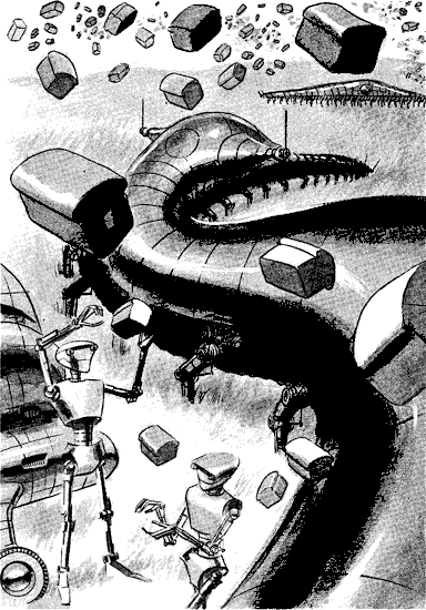 ROGER Snedden's paleness became tinged with an interesting green. He cleared his throat and made strange gulping noises. Tin Philosopher's photocells focused on him calmly, Rose Thinker's with unfeigned excitement. P.T. Gryce's frown grew blacker by the moment, while Megera Winterly's Venus-mask showed an odd dawning of dismay and awe. She was getting new squawks in her earphones.