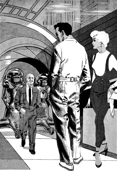 About one thousand miles farther on in that direction, where a cluster of stratosphere-tickling towers marked the location of the metropolis of NewNew York, a tender scene was being enacted in the pressurized penthouse managerial suite of Puffy Products. Megera Winterly, Secretary in Chief to the Managerial Board and referred to by her underlings as the Blonde Icicle, was dealing with the advances of Roger ("Racehorse") Snedden, Assistant Secretary to the Board and often indistinguishable from any passing office boy.