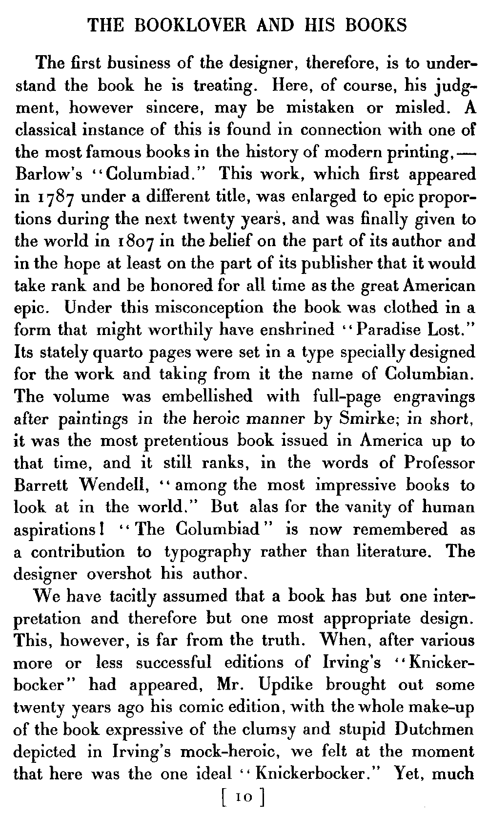 The first business of the designer, therefore, is to understand the book he is treating. Here, of course, his judgment, however sincere, may be mistaken or misled. A classical instance of this is found in connection with one of the most famous books in the history of modern printing,—Barlow's "Columbiad." This work, which first appeared in 1787 under a different title, was enlarged to epic proportions during the next twenty years, and was finally given to the world in 1807 in the belief on the part of its author and in the hope at least on the part of its publisher that it would take rank and be honored for all time as the great American epic. Under this misconception the book was clothed in a form that might worthily have enshrined "Paradise Lost." Its stately quarto pages were set in a type specially designed for the work and taking from it the name of Columbian. The volume was embellished with full-page engravings after paintings in the heroic manner by Smirke; in short, it was the most pretentious book issued in America up to that time, and it still ranks, in the words of Professor Barrett Wendell, "among the most impressive books to look at in the world." But alas for the vanity of human aspirations! "The Columbiad" is now remembered as a contribution to typography rather than literature. The designer overshot his author.