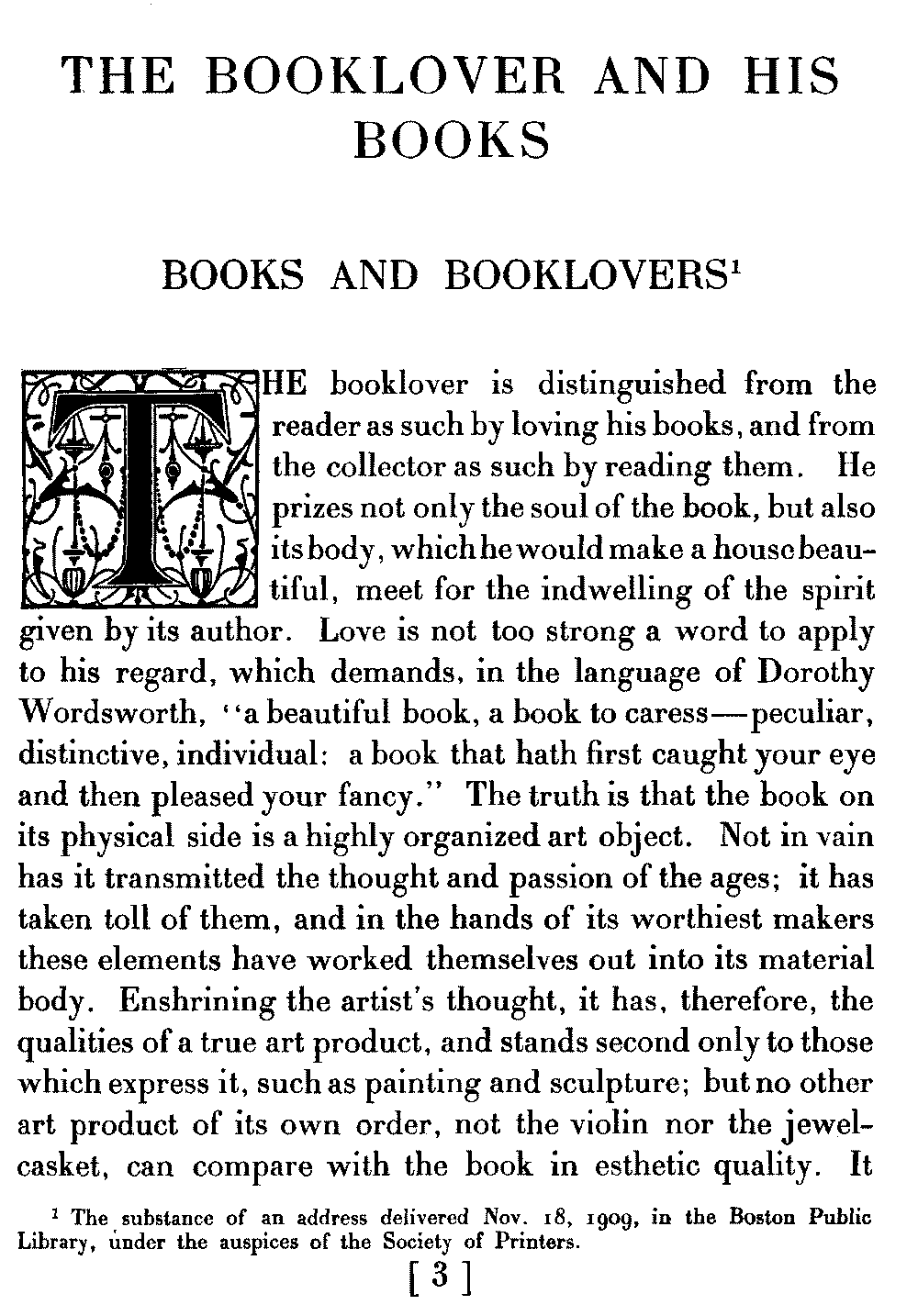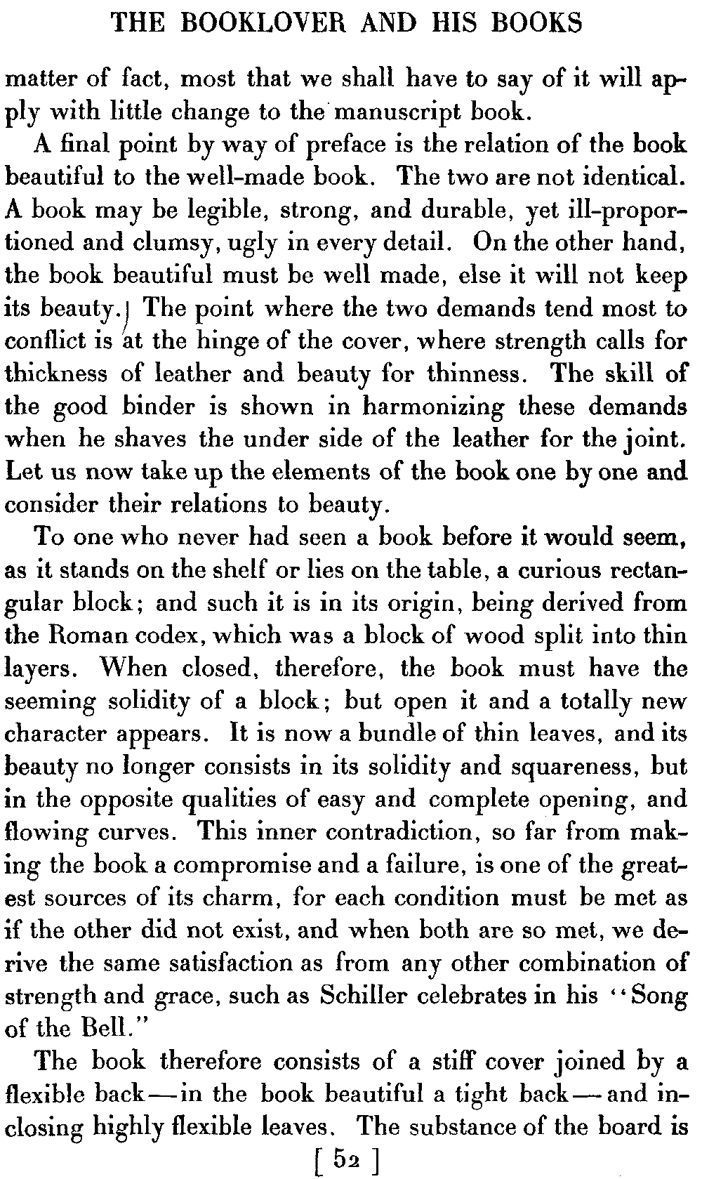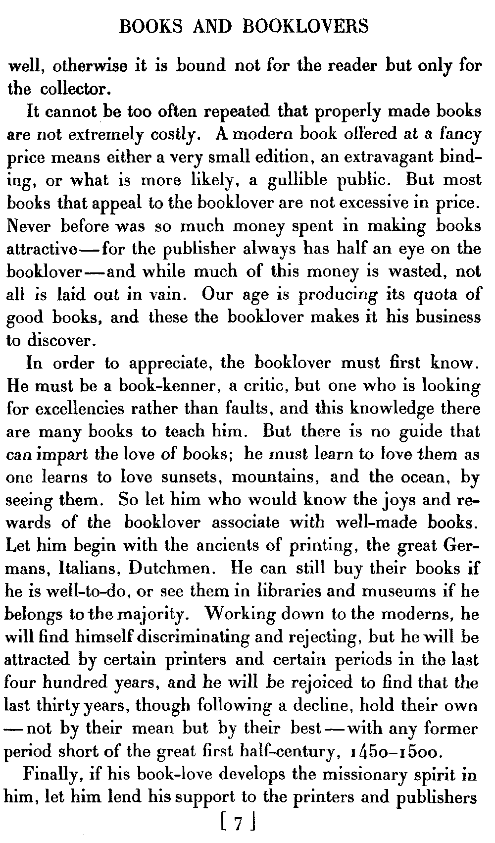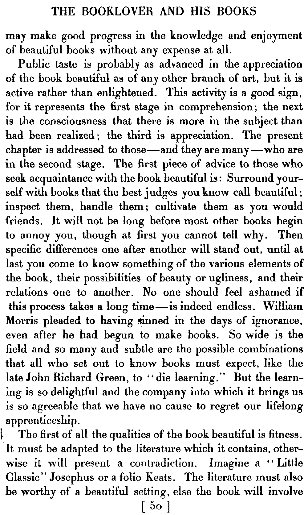 In order to appreciate, the booklover must first know. He must be a book-kenner, a critic, but one who is looking for excellencies rather than faults, and this knowledge there are many books to teach him. But there is no guide that can impart the love of books; he must learn to love them as one learns to love sunsets, mountains, and the ocean, by seeing them. So let him who would know the joys and rewards of the booklover associate with well-made books. Let him begin with the ancients of printing, the great Germans, Italians, Dutchmen. He can still buy their books if he is well-to-do, or see them in libraries and museums if he belongs to the majority. Working down to the moderns, he will find himself discriminating and rejecting, but he will be attracted by certain printers and certain periods in the last four hundred years, and he will be rejoiced to find that the last thirty years, though following a decline, hold their own—not by their mean but by their best—with any former period short of the great first half-century, 1450-1500.
