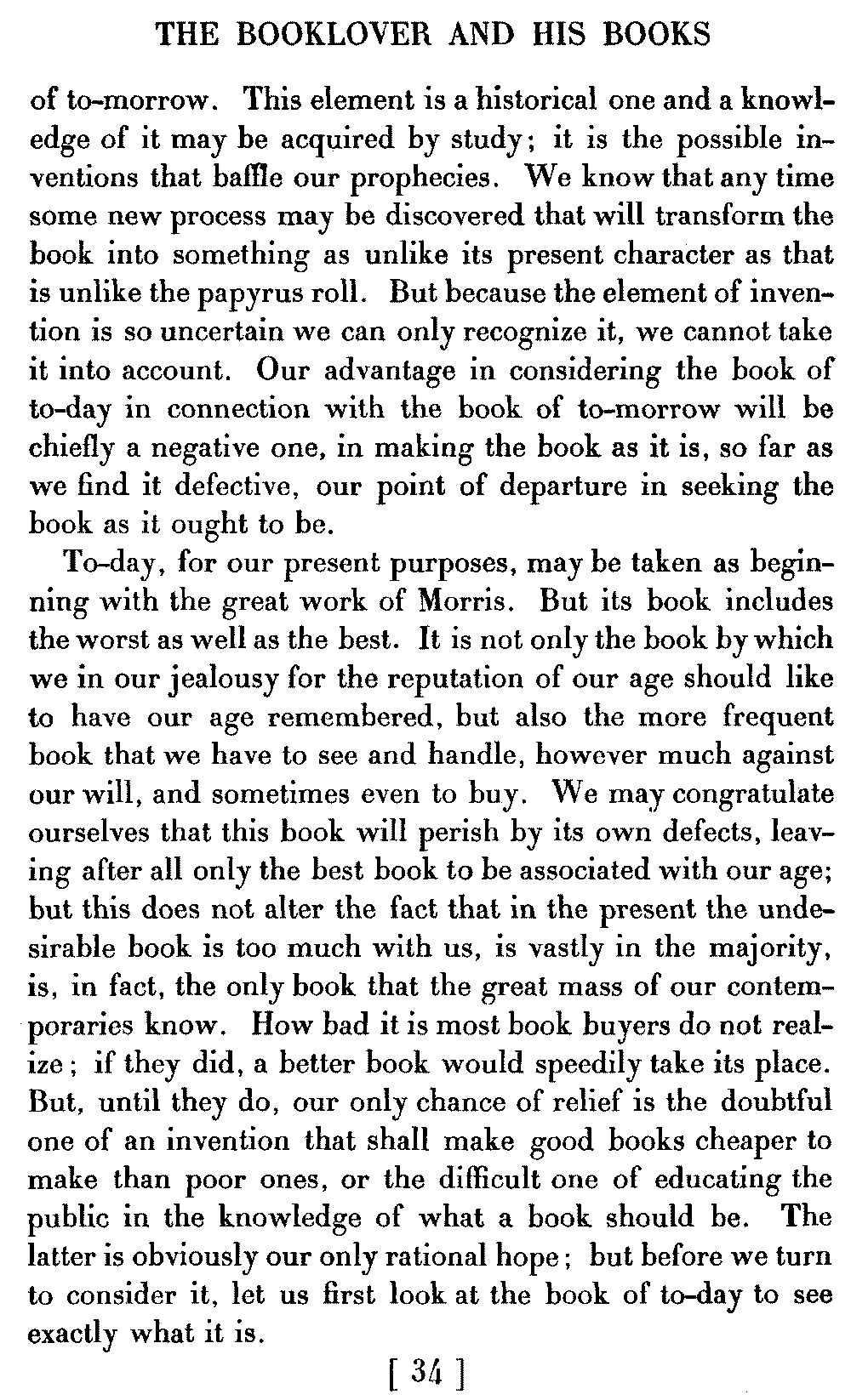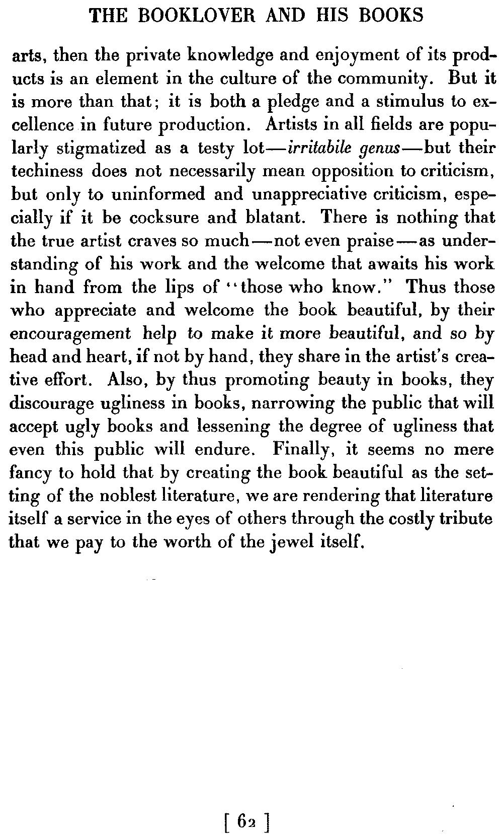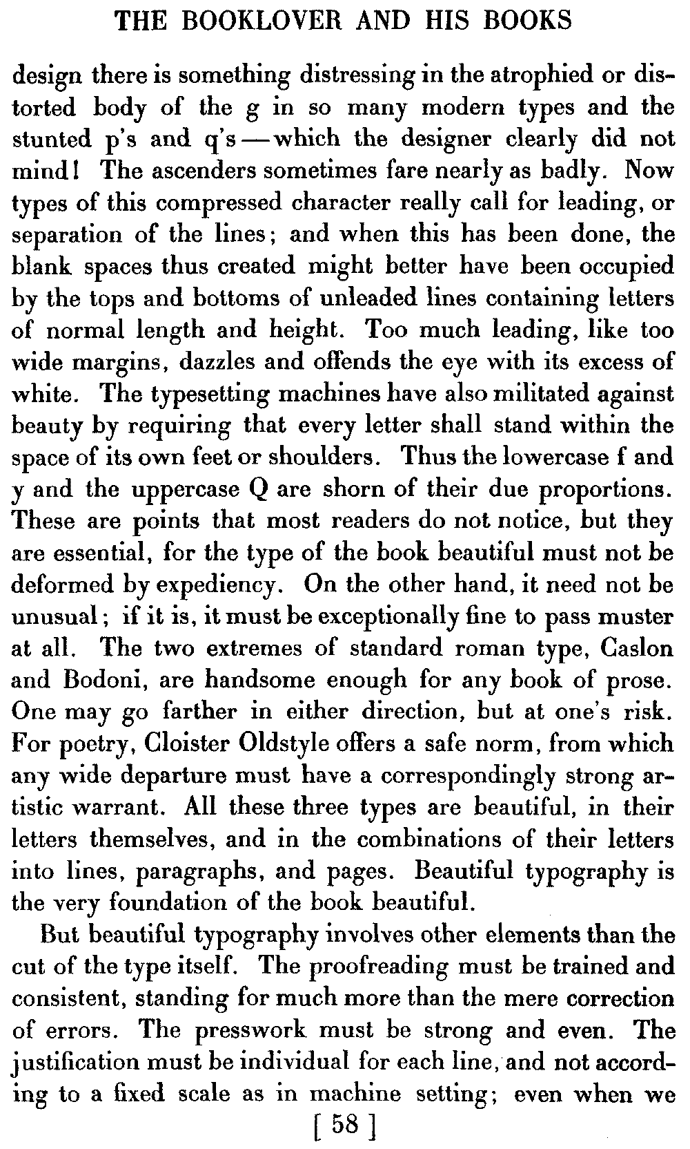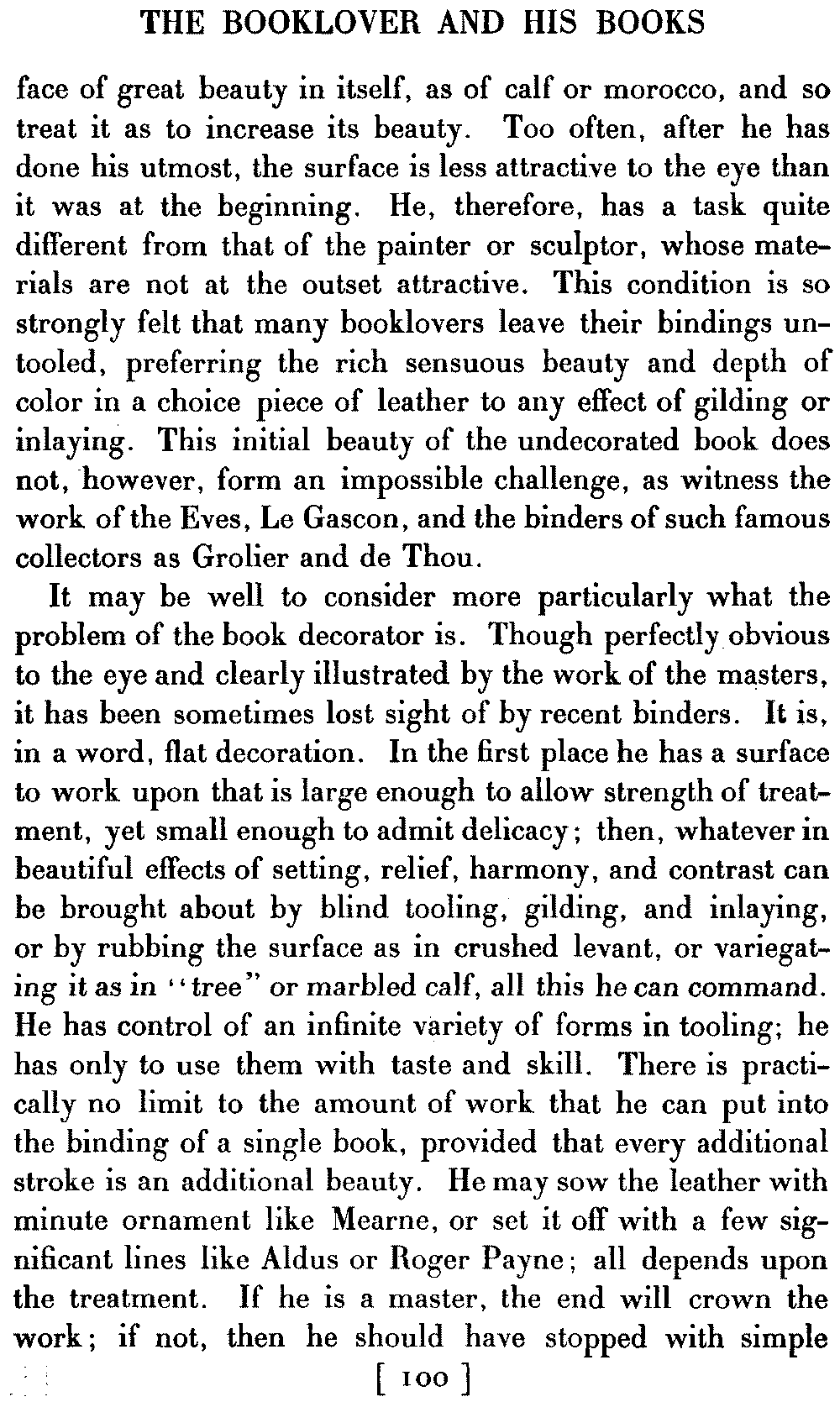 In order to appreciate, the booklover must first know. He must be a book-kenner, a critic, but one who is looking for excellencies rather than faults, and this knowledge there are many books to teach him. But there is no guide that can impart the love of books; he must learn to love them as one learns to love sunsets, mountains, and the ocean, by seeing them. So let him who would know the joys and rewards of the booklover associate with well-made books. Let him begin with the ancients of printing, the great Germans, Italians, Dutchmen. He can still buy their books if he is well-to-do, or see them in libraries and museums if he belongs to the majority. Working down to the moderns, he will find himself discriminating and rejecting, but he will be attracted by certain printers and certain periods in the last four hundred years, and he will be rejoiced to find that the last thirty years, though following a decline, hold their own—not by their mean but by their best—with any former period short of the great first half-century, 1450-1500.