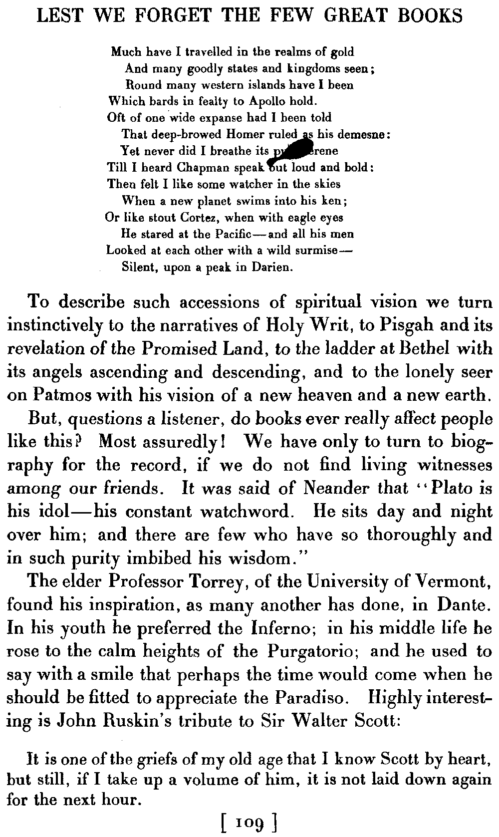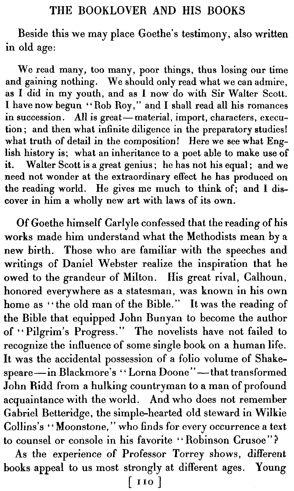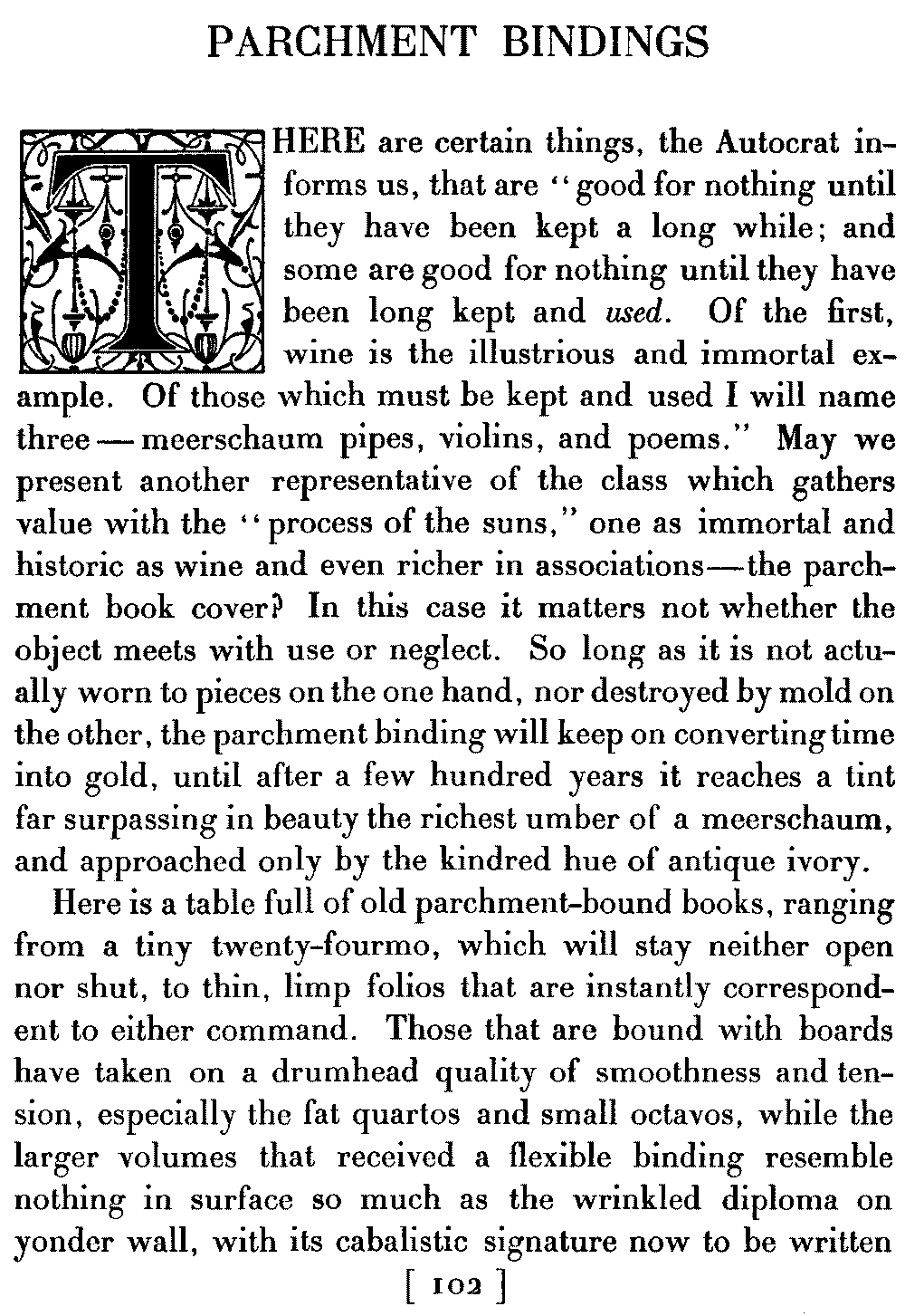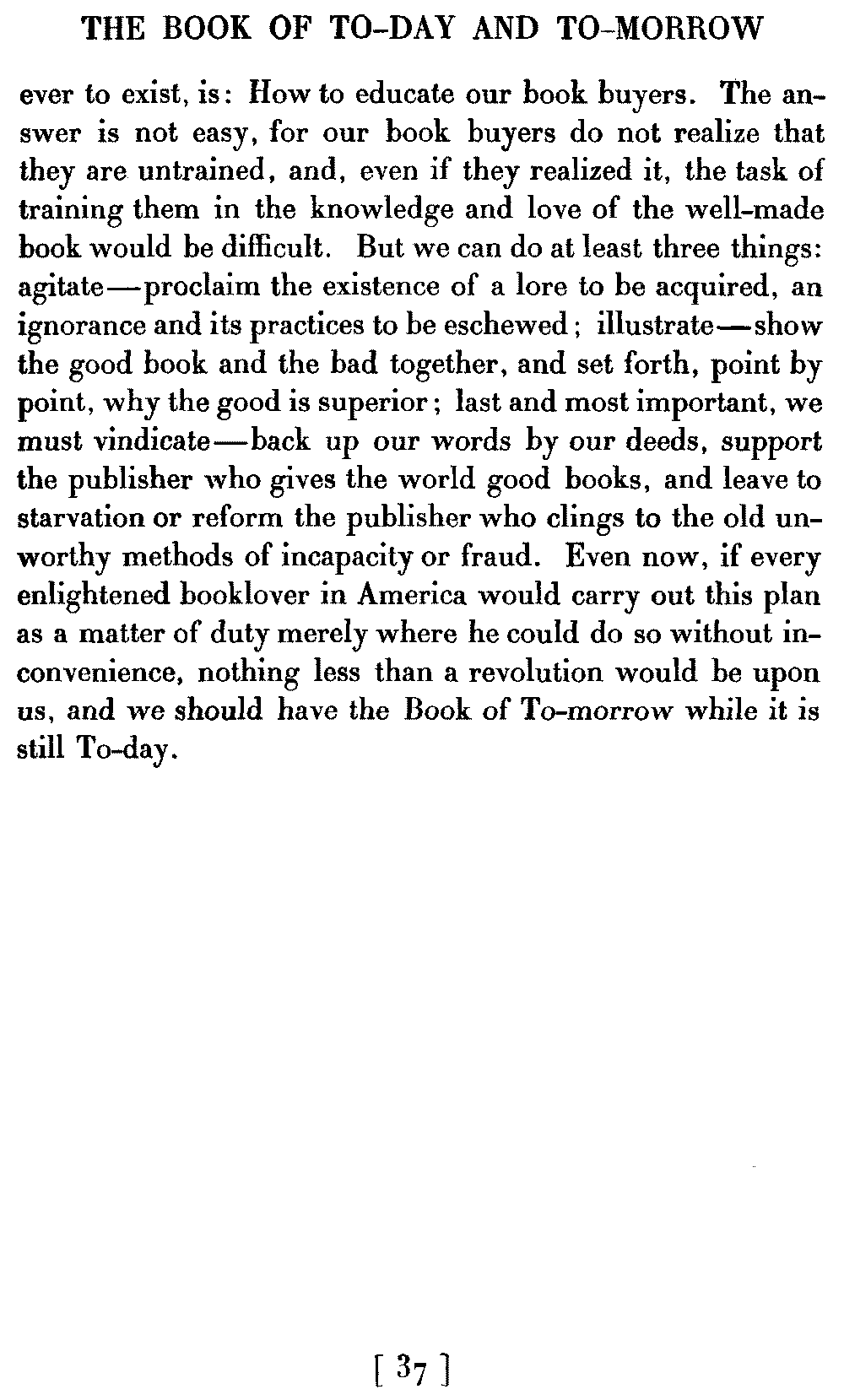 In order to appreciate, the booklover must first know. He must be a book-kenner, a critic, but one who is looking for excellencies rather than faults, and this knowledge there are many books to teach him. But there is no guide that can impart the love of books; he must learn to love them as one learns to love sunsets, mountains, and the ocean, by seeing them. So let him who would know the joys and rewards of the booklover associate with well-made books. Let him begin with the ancients of printing, the great Germans, Italians, Dutchmen. He can still buy their books if he is well-to-do, or see them in libraries and museums if he belongs to the majority. Working down to the moderns, he will find himself discriminating and rejecting, but he will be attracted by certain printers and certain periods in the last four hundred years, and he will be rejoiced to find that the last thirty years, though following a decline, hold their own—not by their mean but by their best—with any former period short of the great first half-century, 1450-1500.