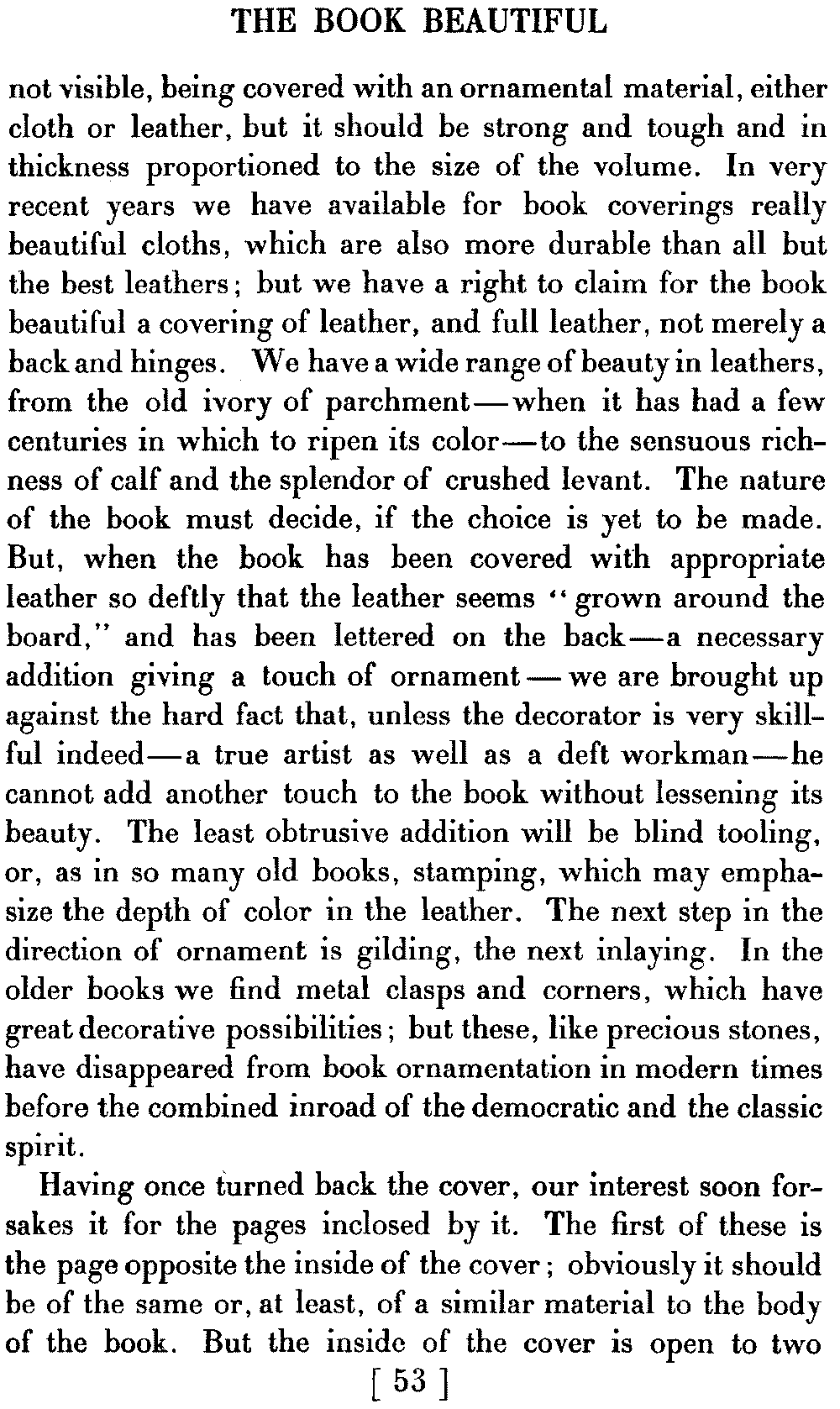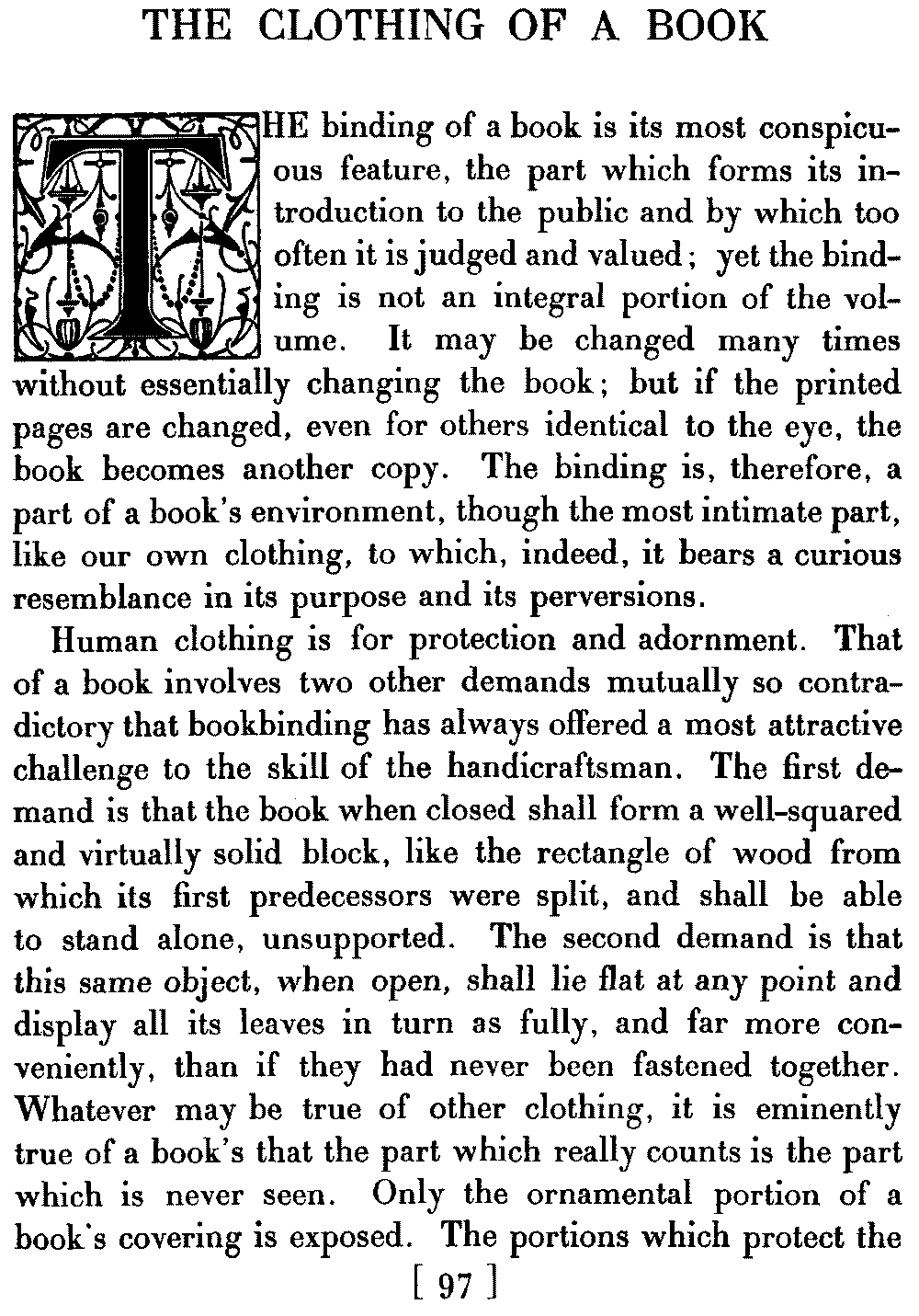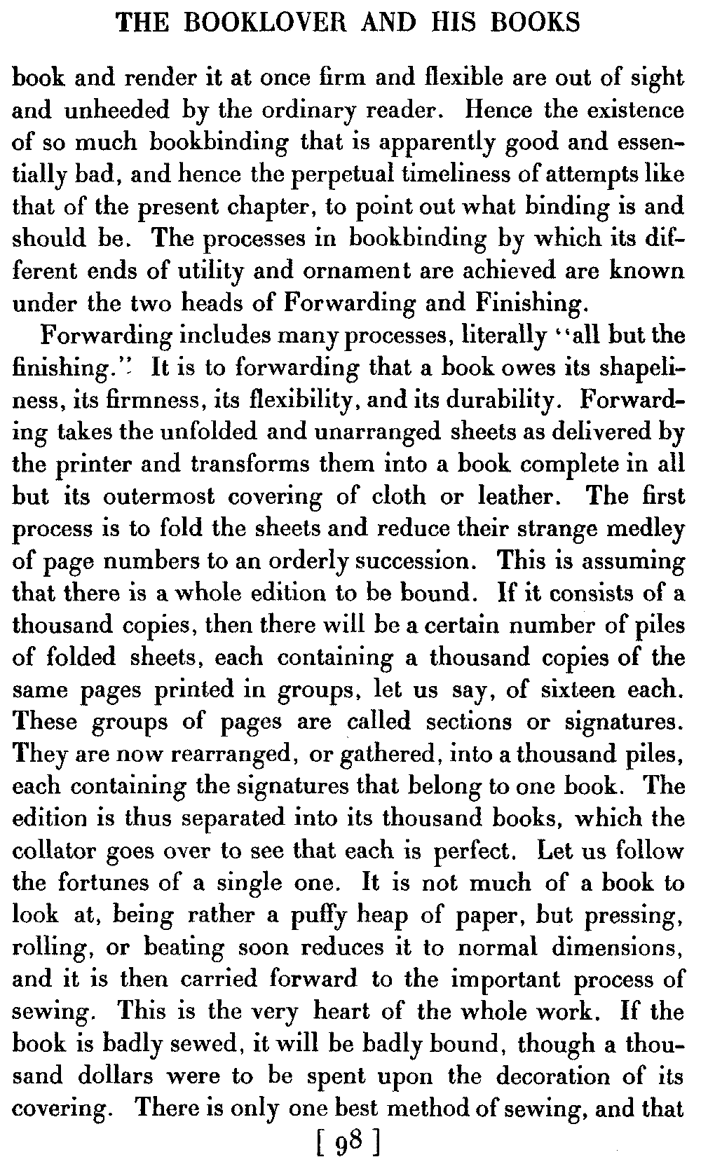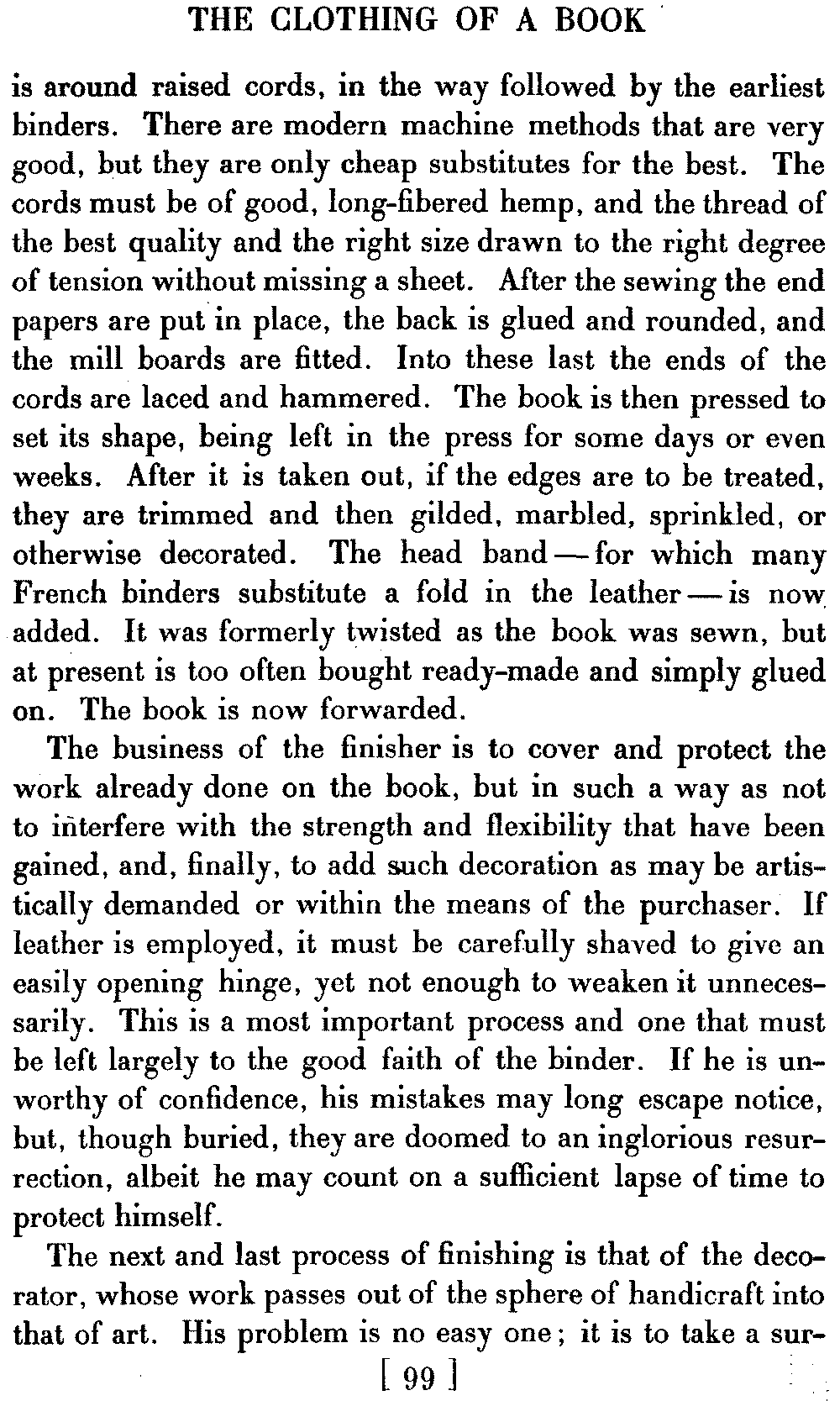 The binding is to the book what the book is to its subject-matter, a clothing and protection. In the middle ages, when books were so few as to be a distinction, they were displayed sidewise, not edgewise, on the shelves, and their covers were often richly decorated, sometimes with costly gems. Even the wooden cover of the pre-Columbian Mexican book had gems set in its corners. Modern ornamentation is confined to tooling, blind and gilt, and inlaying. But some booklovers question whether any decoration really adds to the beauty of the finest leather. It should be remembered that the binding is not all on the outside. The visible cover is only the jacket of the real cover on which the integrity of the book depends. The sewing is the first element in time and importance. To be well bound a book should lie open[7] well, otherwise it is bound not for the reader but only for the collector.