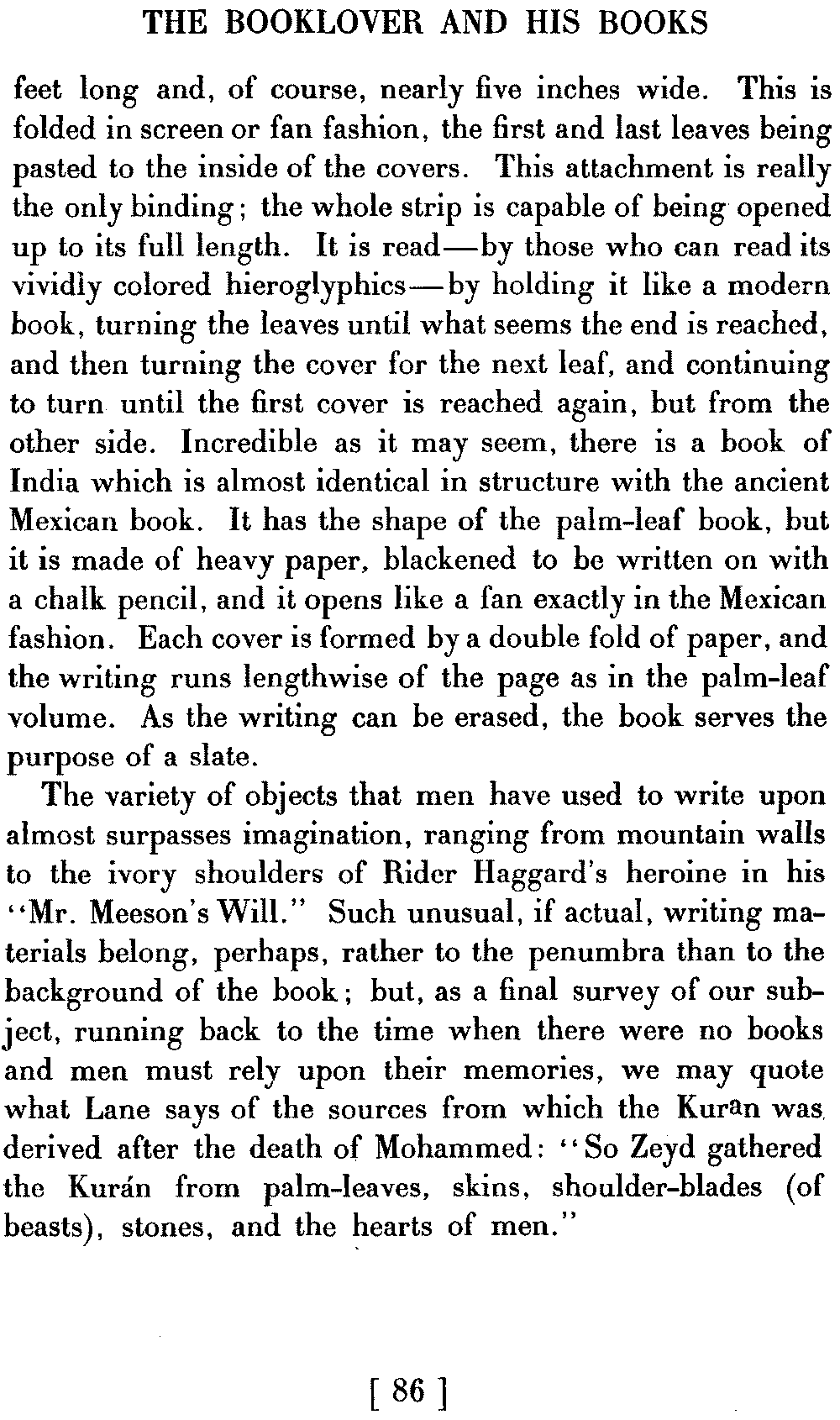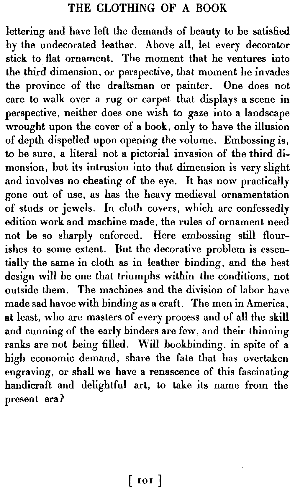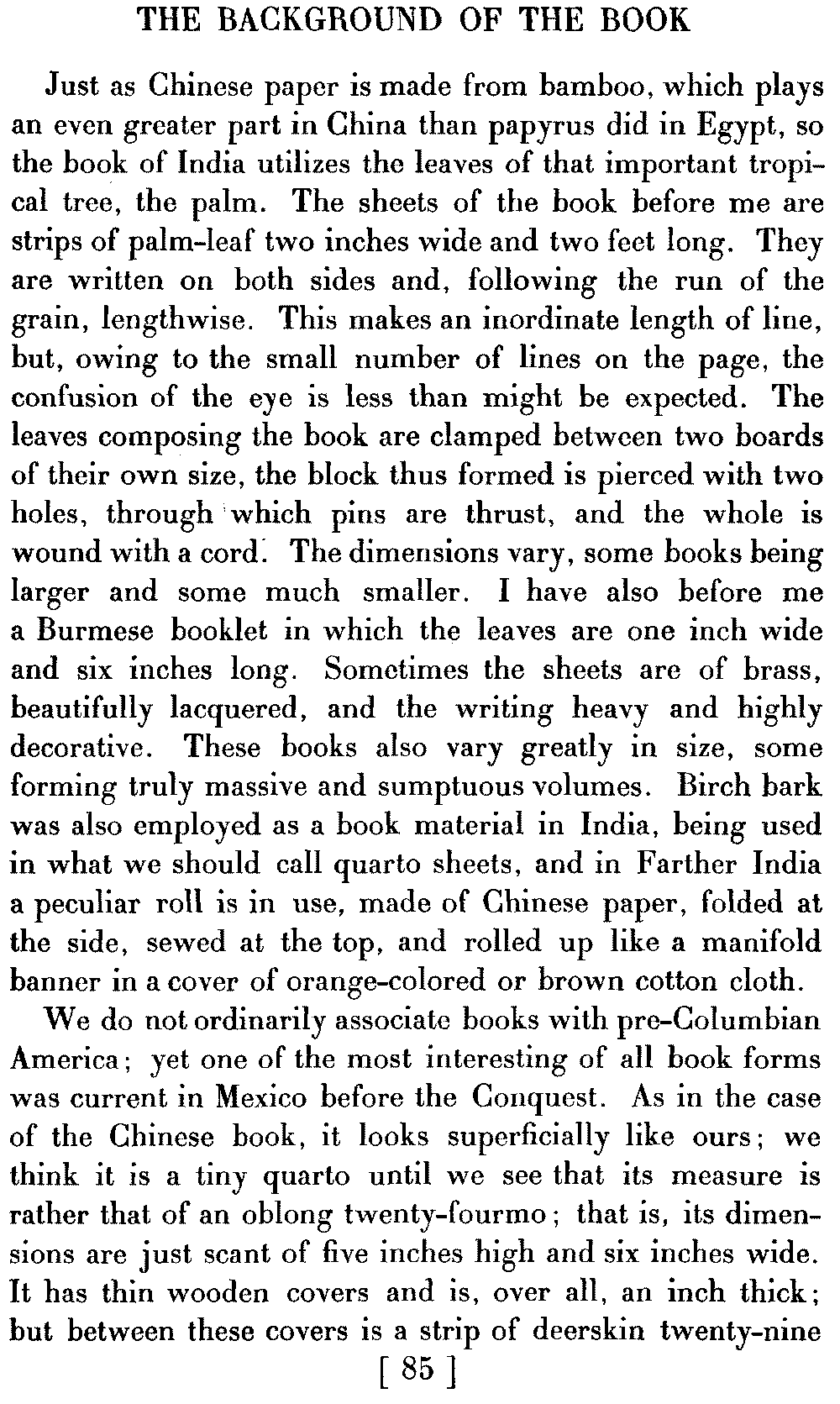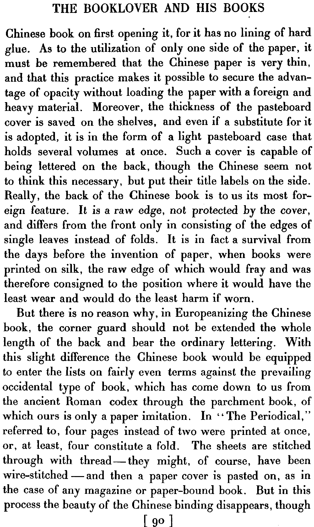 The binding is to the book what the book is to its subject-matter, a clothing and protection. In the middle ages, when books were so few as to be a distinction, they were displayed sidewise, not edgewise, on the shelves, and their covers were often richly decorated, sometimes with costly gems. Even the wooden cover of the pre-Columbian Mexican book had gems set in its corners. Modern ornamentation is confined to tooling, blind and gilt, and inlaying. But some booklovers question whether any decoration really adds to the beauty of the finest leather. It should be remembered that the binding is not all on the outside. The visible cover is only the jacket of the real cover on which the integrity of the book depends. The sewing is the first element in time and importance. To be well bound a book should lie open[7] well, otherwise it is bound not for the reader but only for the collector.