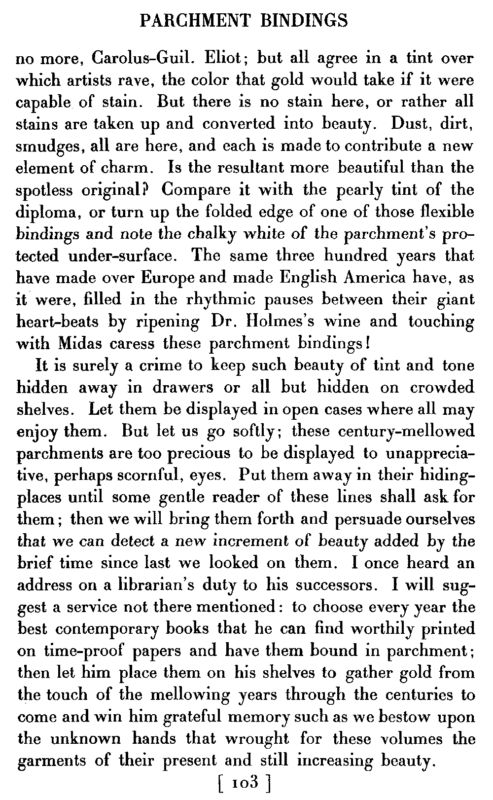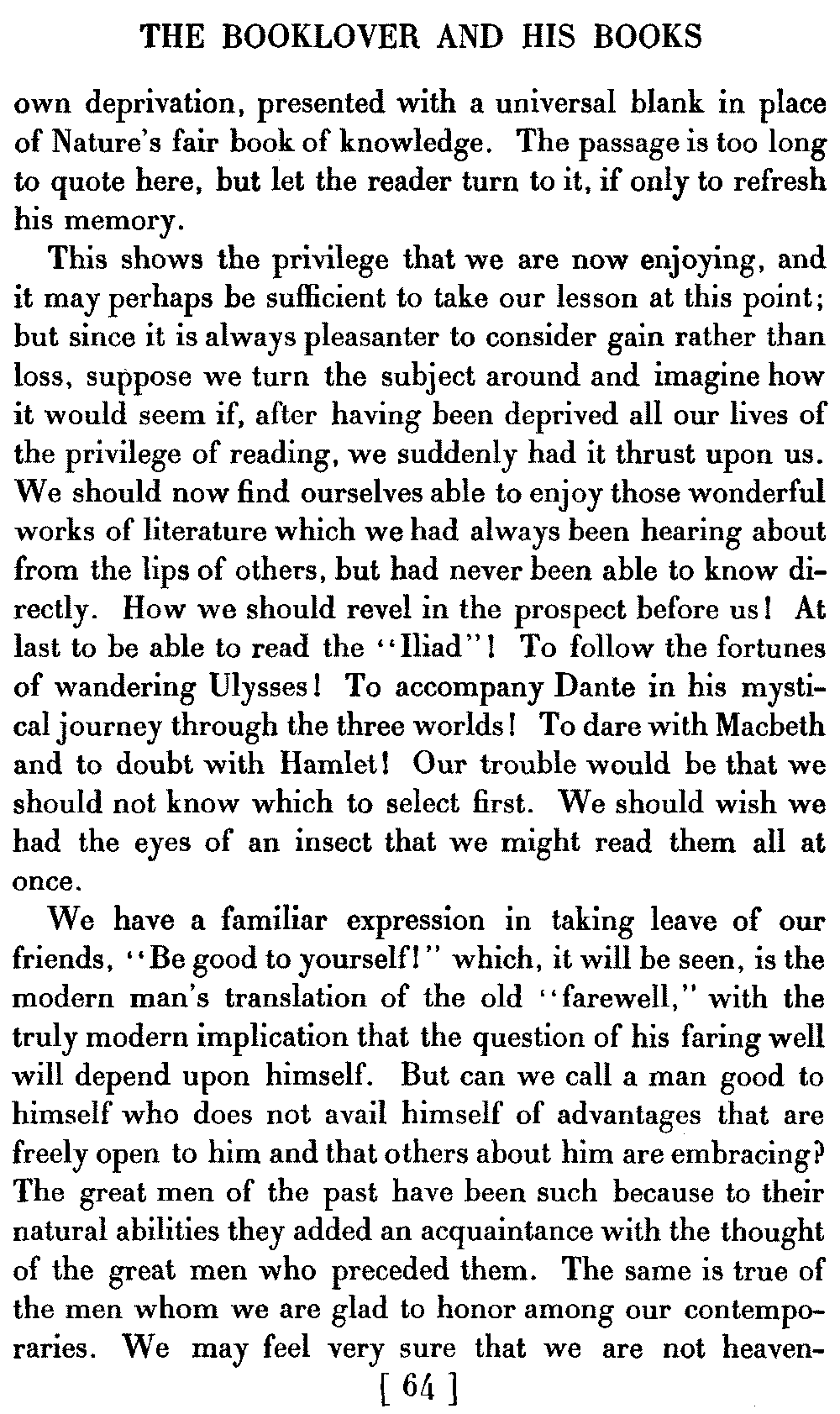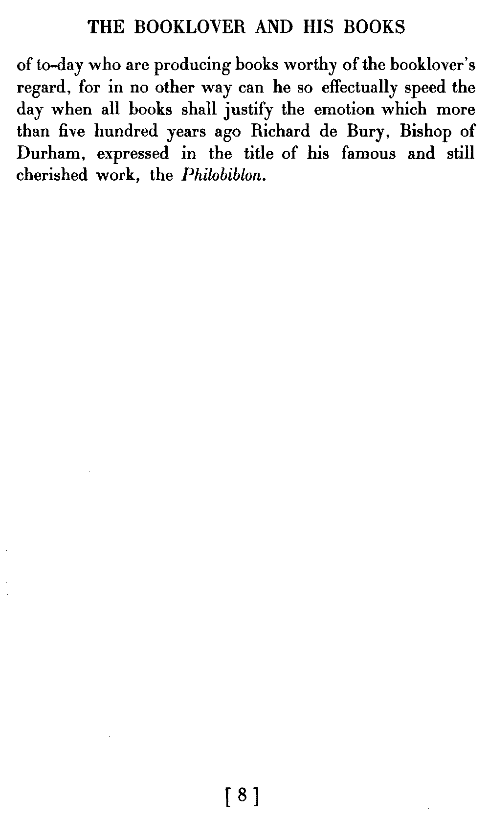 Finally, if his book-love develops the missionary spirit in him, let him lend his support to the printers and publishers[8] of to-day who are producing books worthy of the booklover's regard, for in no other way can he so effectually speed the day when all books shall justify the emotion which more than five hundred years ago Richard de Bury, Bishop of Durham, expressed in the title of his famous and still cherished work, the Philobiblon.