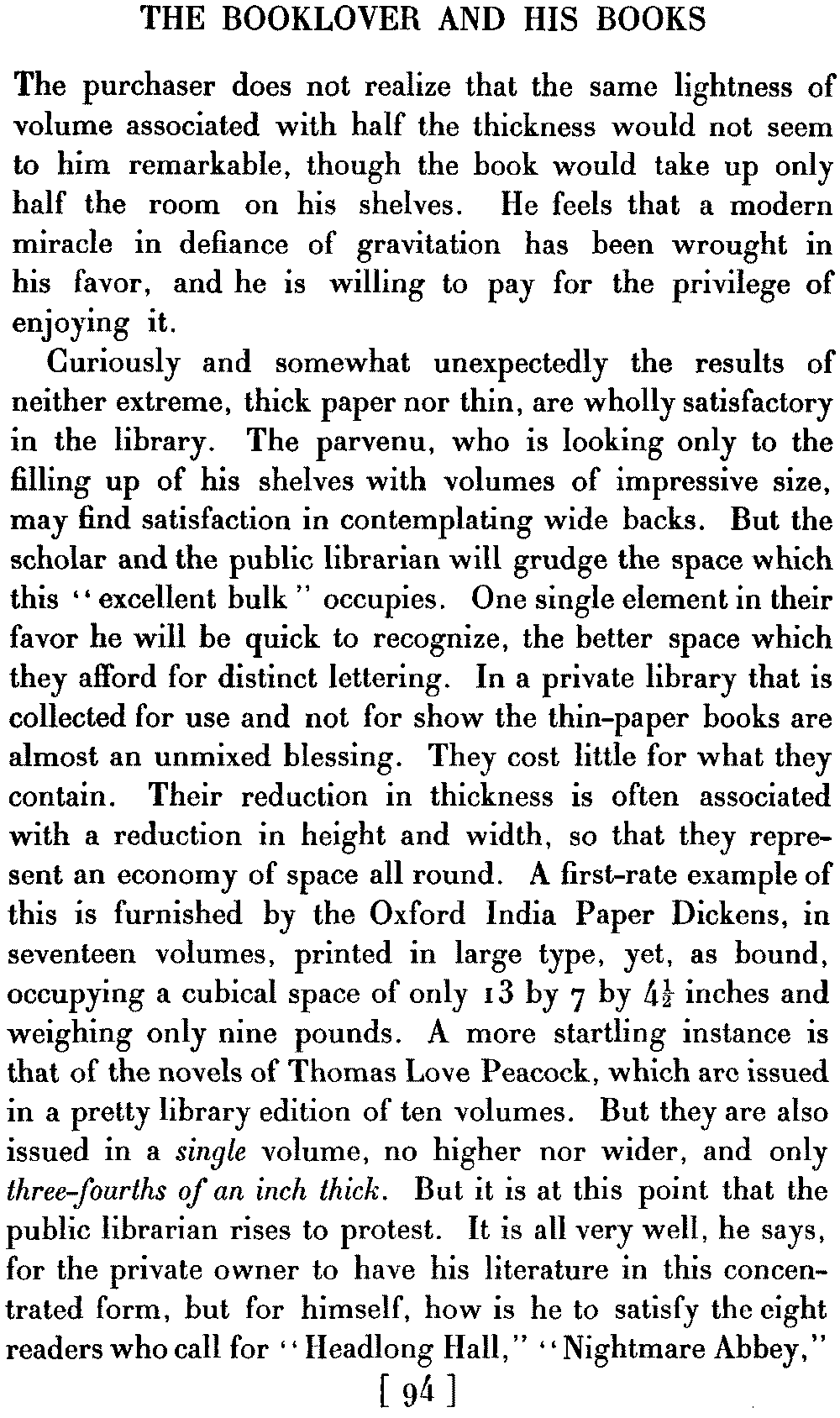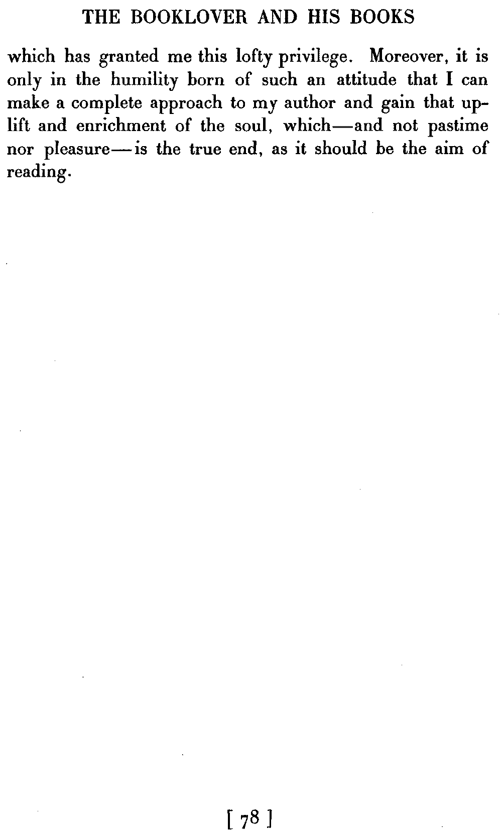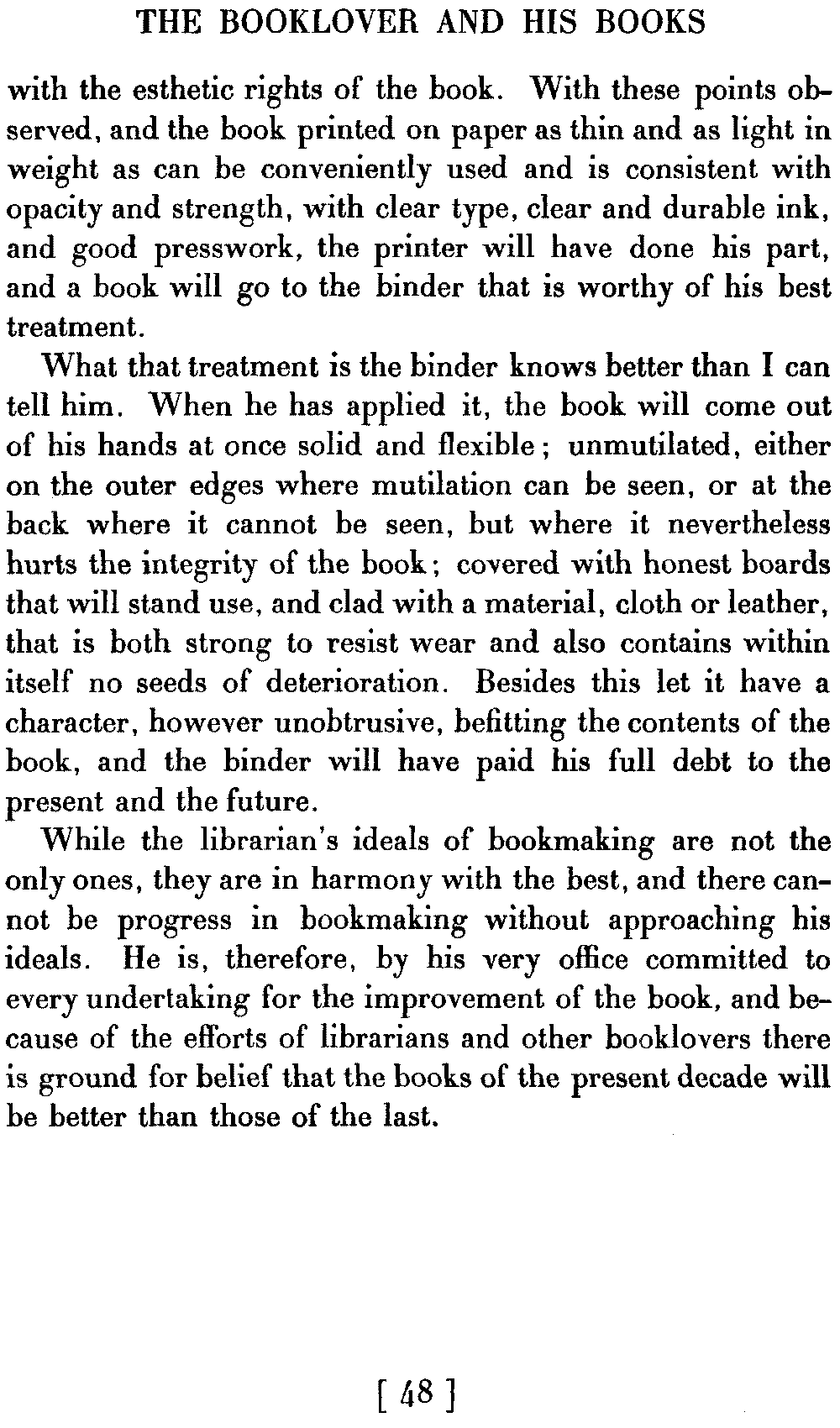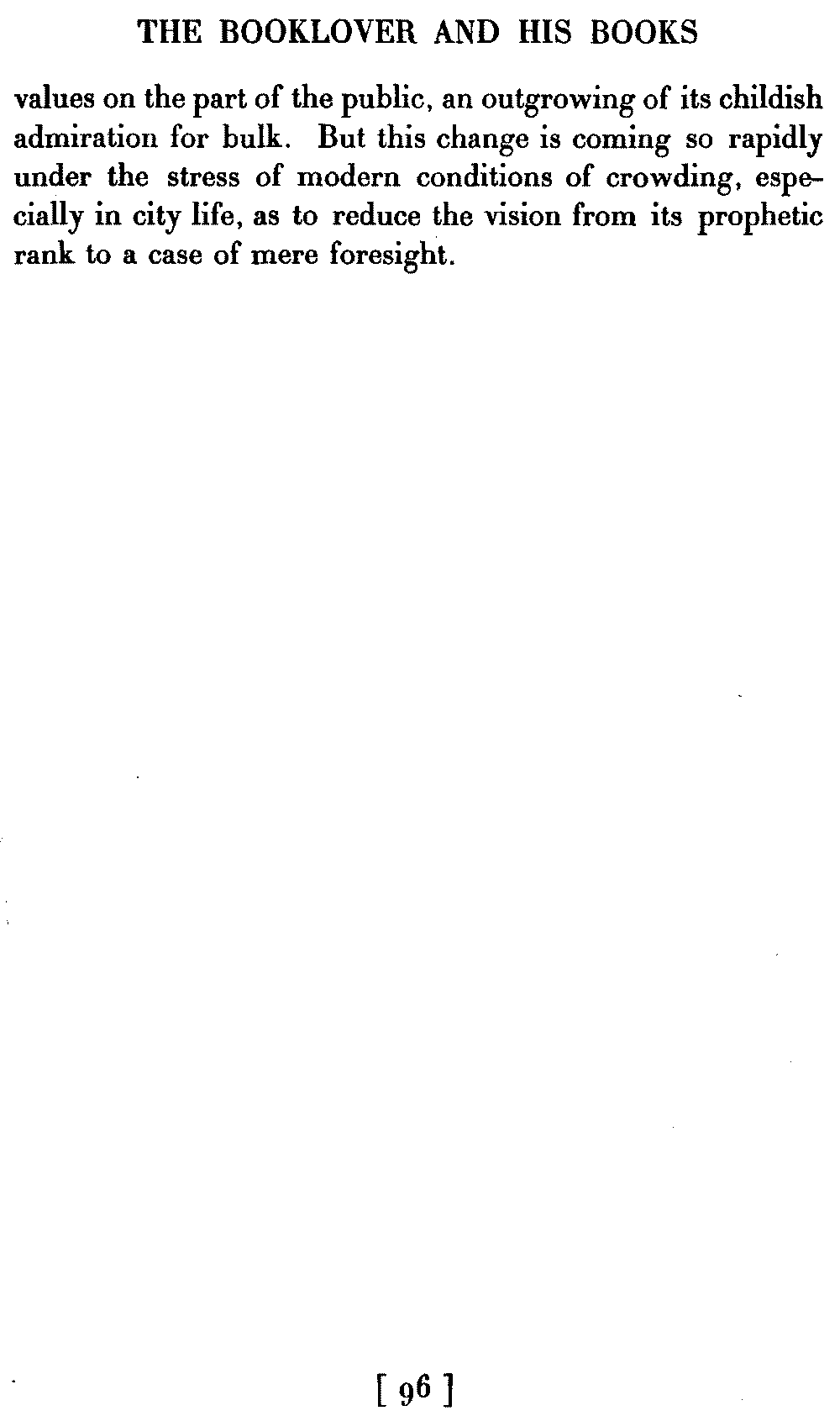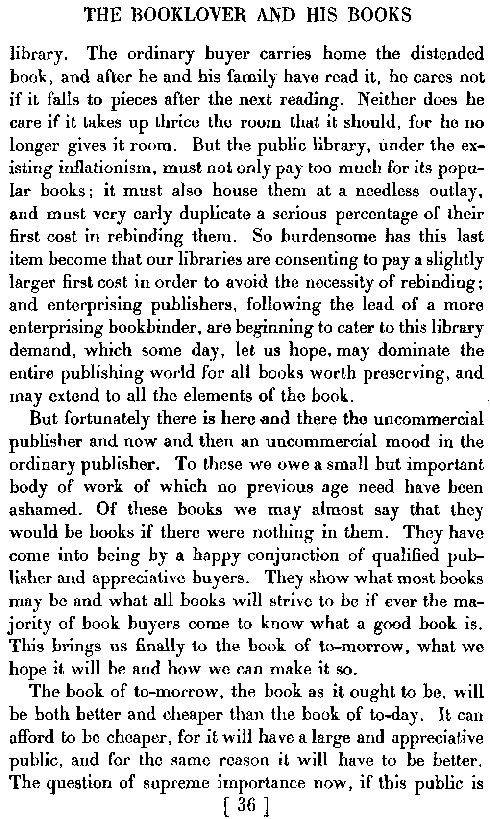 It cannot be too often repeated that properly made books are not extremely costly. A modern book offered at a fancy price means either a very small edition, an extravagant binding, or what is more likely, a gullible public. But most books that appeal to the booklover are not excessive in price. Never before was so much money spent in making books attractive—for the publisher always has half an eye on the booklover—and while much of this money is wasted, not all is laid out in vain. Our age is producing its quota of good books, and these the booklover makes it his business to discover.