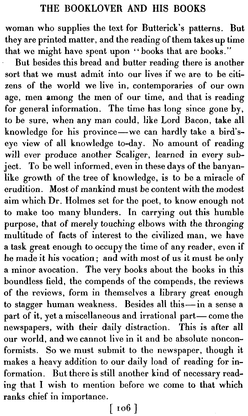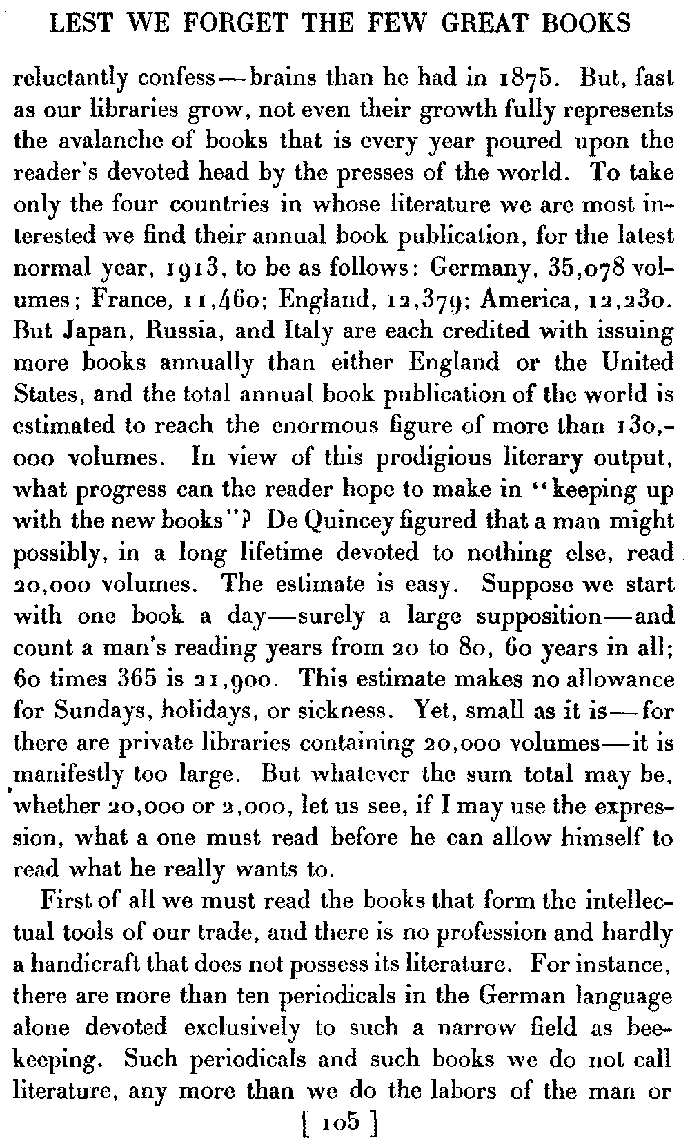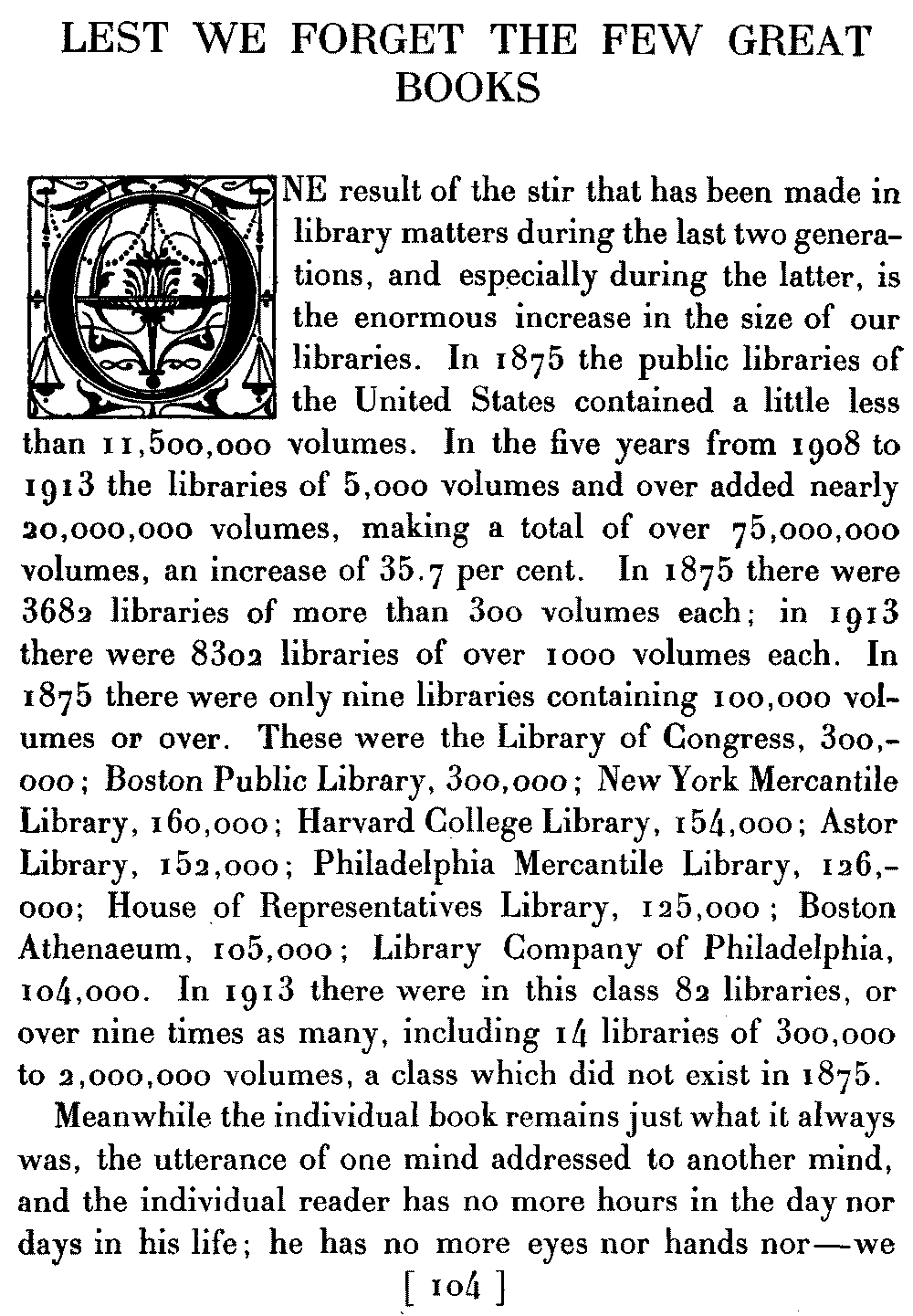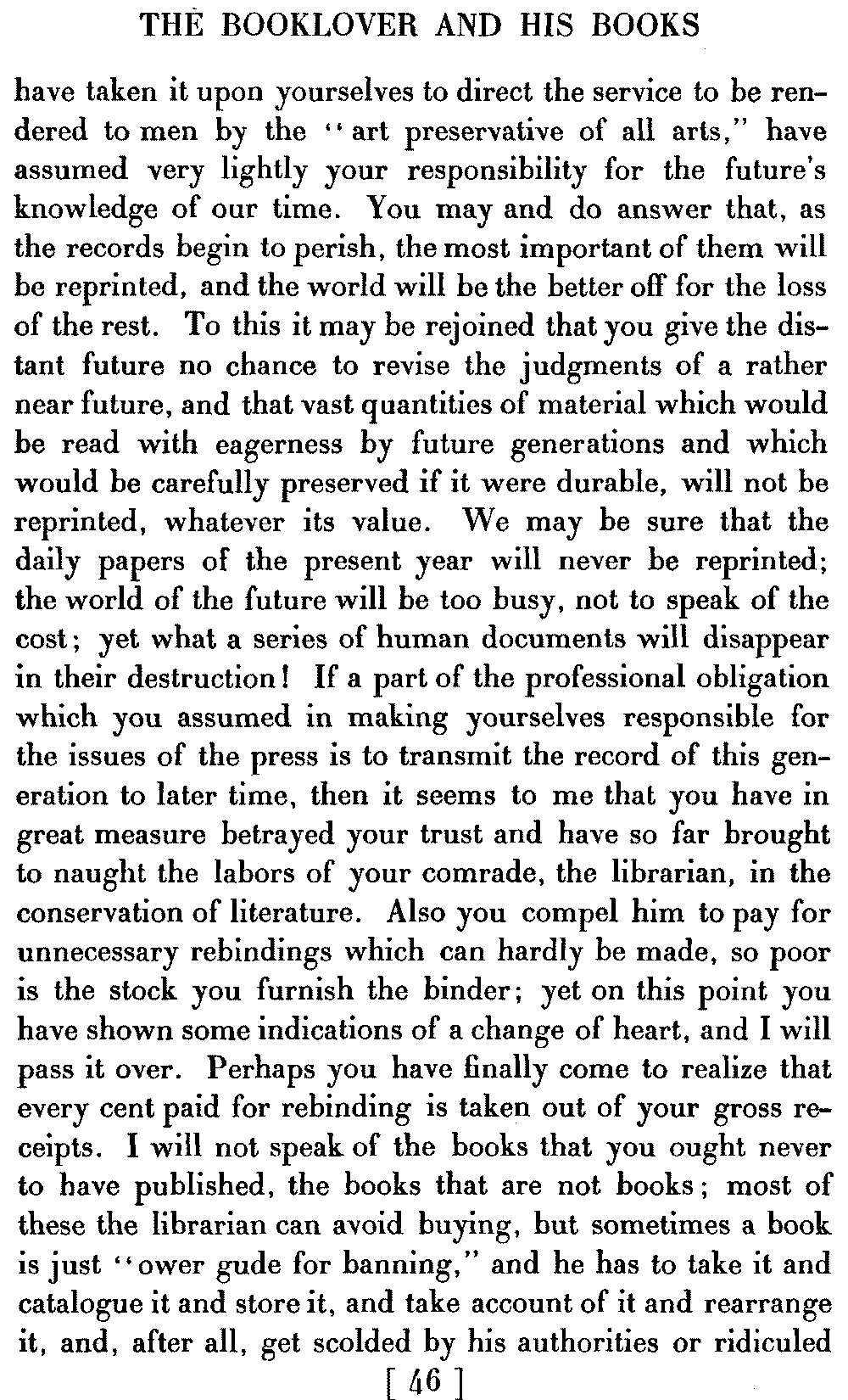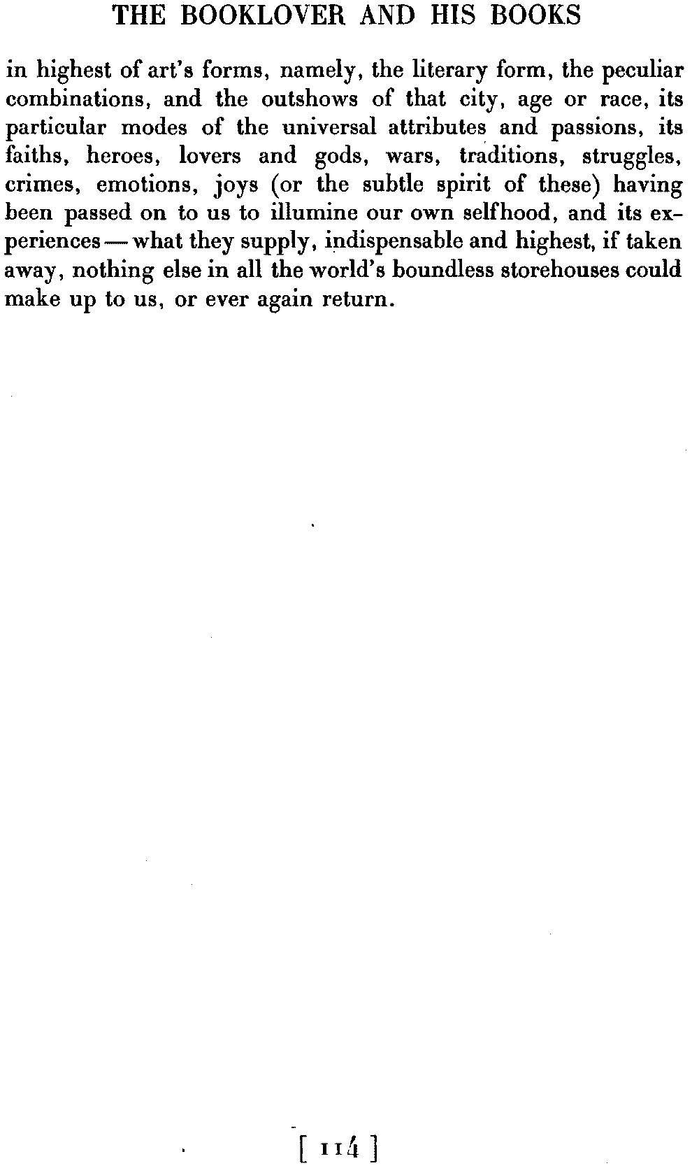 It cannot be too often repeated that properly made books are not extremely costly. A modern book offered at a fancy price means either a very small edition, an extravagant binding, or what is more likely, a gullible public. But most books that appeal to the booklover are not excessive in price. Never before was so much money spent in making books attractive—for the publisher always has half an eye on the booklover—and while much of this money is wasted, not all is laid out in vain. Our age is producing its quota of good books, and these the booklover makes it his business to discover.