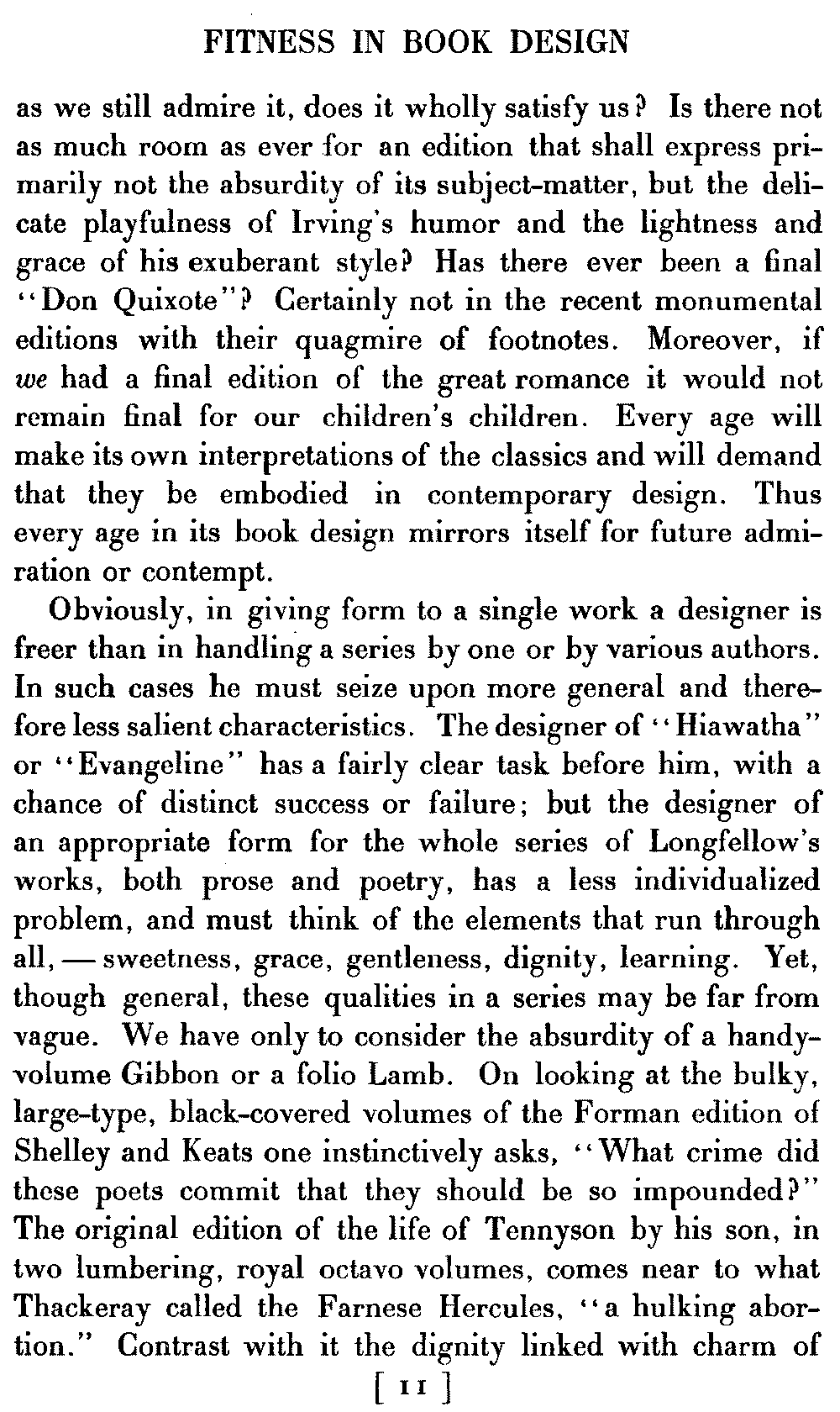 We have tacitly assumed that a book has but one interpretation and therefore but one most appropriate design. This, however, is far from the truth. When, after various more or less successful editions of Irving's "Knickerbocker" had appeared, Mr. Updike brought out some twenty years ago his comic edition, with the whole make-up of the book expressive of the clumsy and stupid Dutchmen depicted in Irving's mock-heroic, we felt at the moment that here was the one ideal "Knickerbocker." Yet, much[11] as we still admire it, does it wholly satisfy us? Is there not as much room as ever for an edition that shall express primarily not the absurdity of its subject-matter, but the delicate playfulness of Irving's humor and the lightness and grace of his exuberant style? Has there ever been a final "Don Quixote"? Certainly not in the recent monumental editions with their quagmire of footnotes. Moreover, if we had a final edition of the great romance it would not remain final for our children's children. Every age will make its own interpretations of the classics and will demand that they be embodied in contemporary design. Thus every age in its book design mirrors itself for future admiration or contempt.