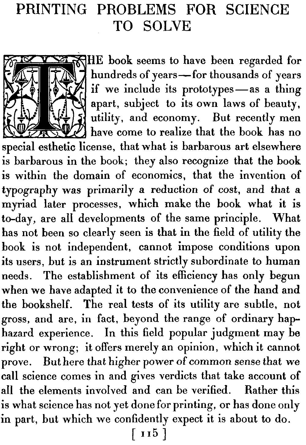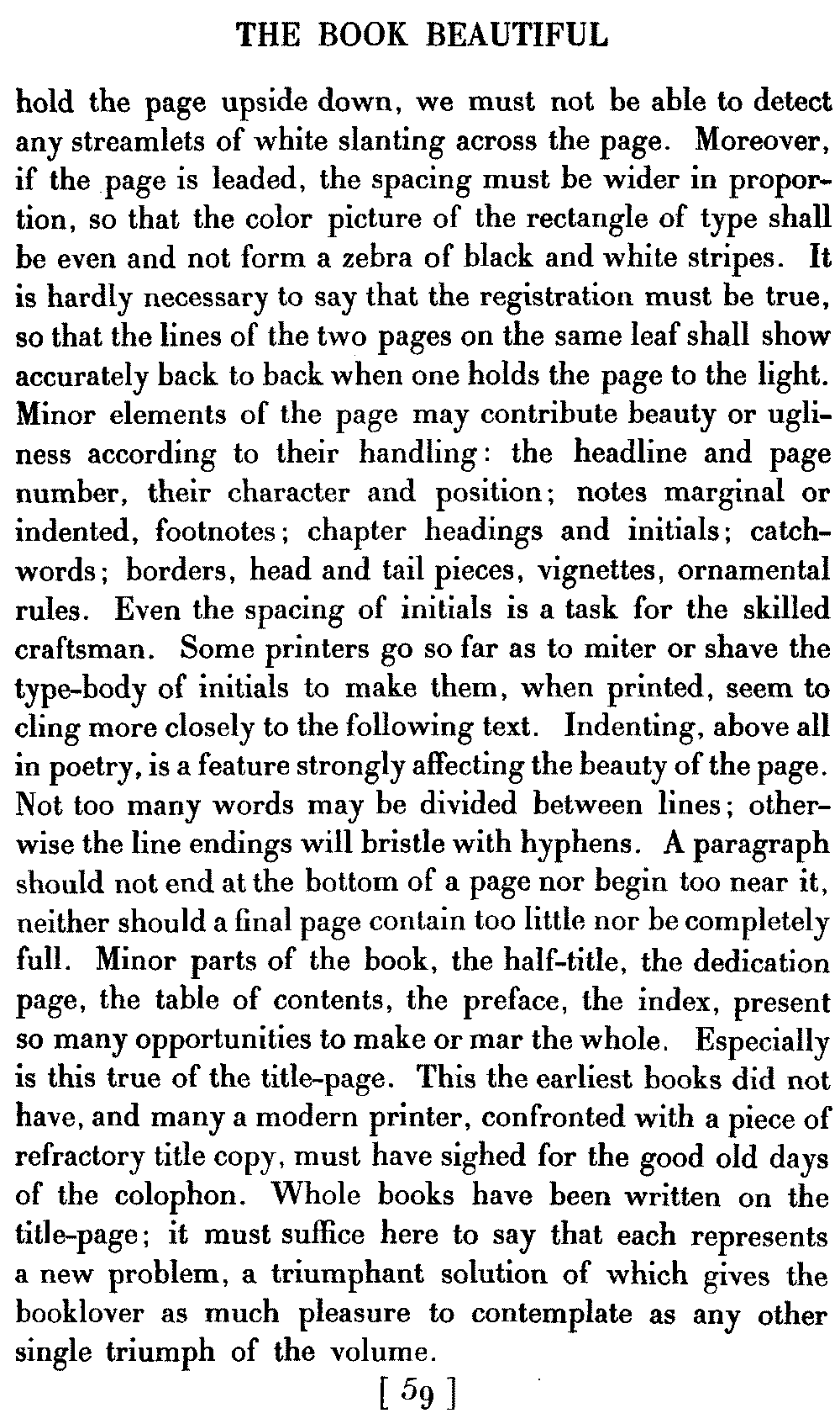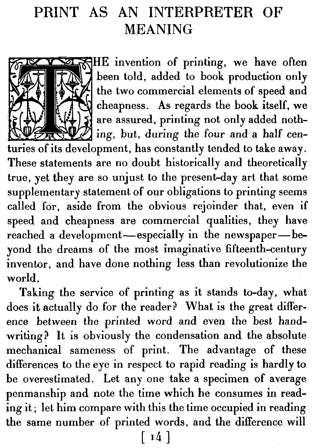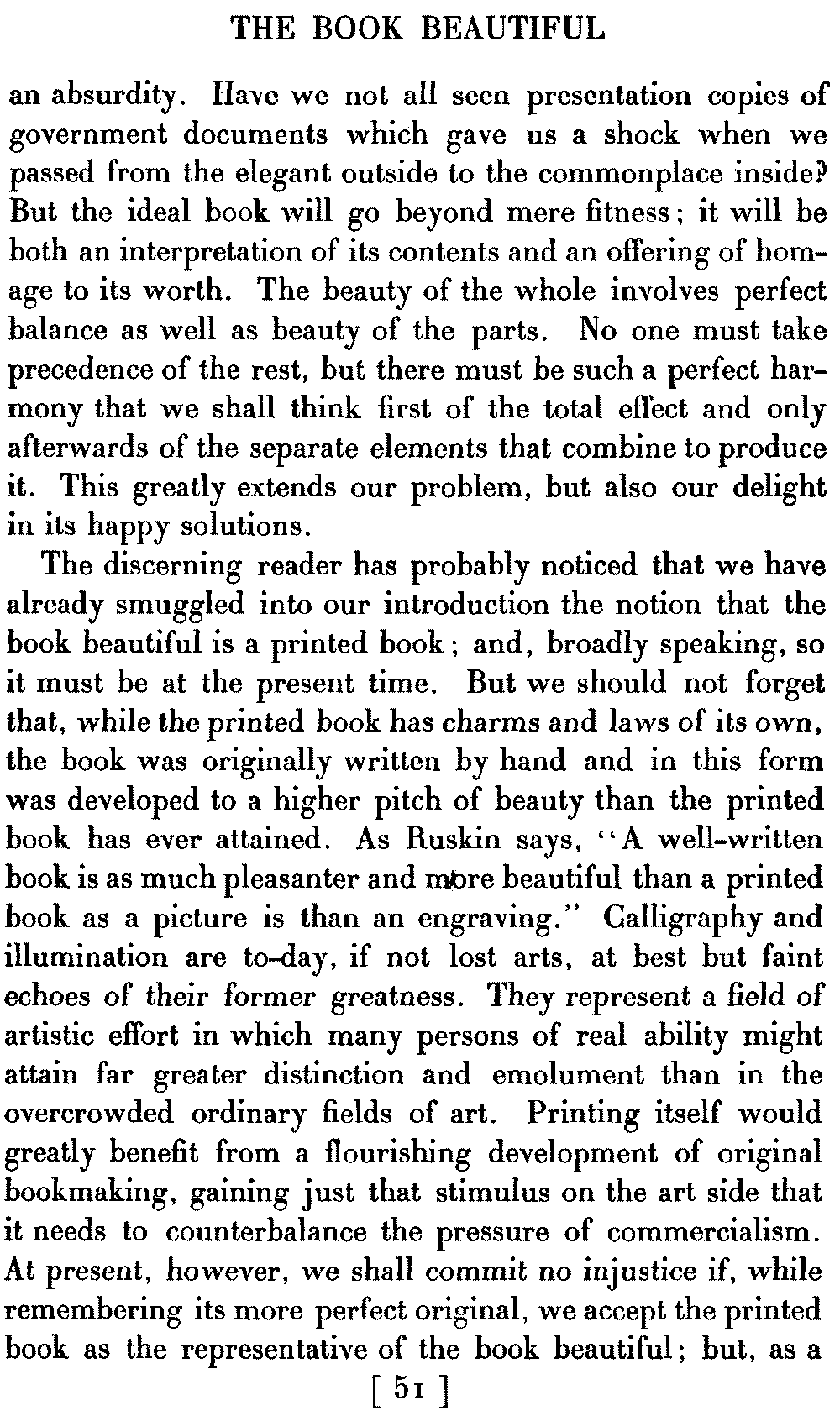 It is surely not an extreme assumption that the first duty of the printer is to the meaning of his author, and his second to esthetics; but shall we not rather say that his duty is to meet both demands, not by a compromise, but by a complete satisfaction of each? A difficult requirement, surely, but one that we are confident the twentieth-century printer will not permit his critics to pronounce impossible.