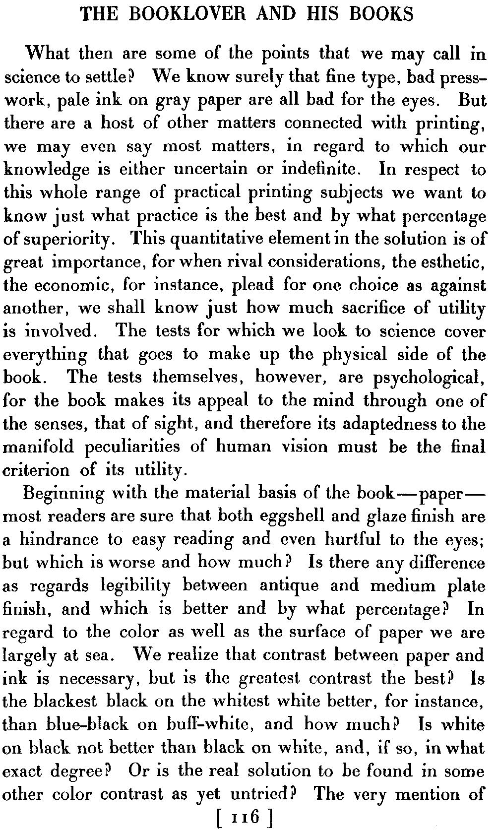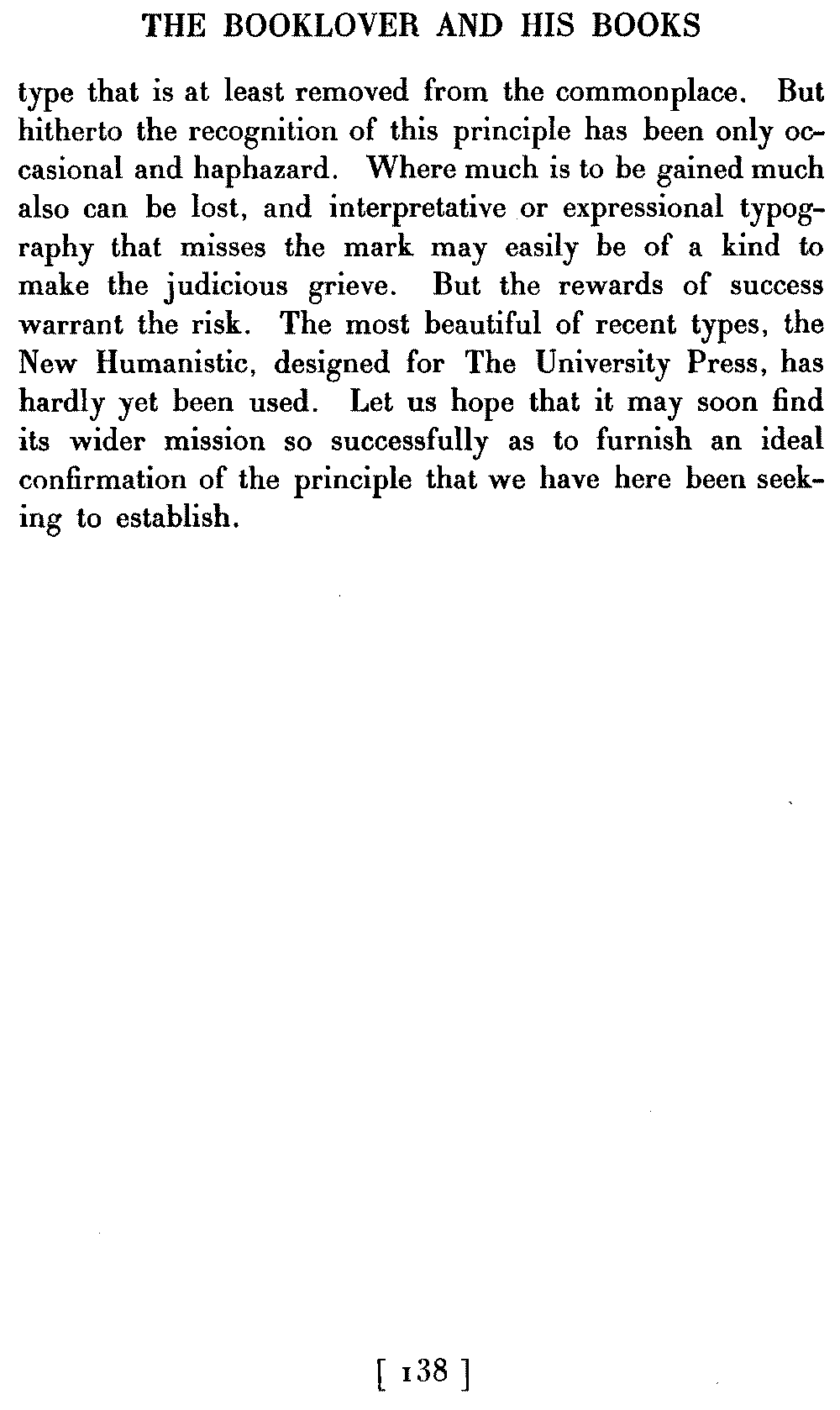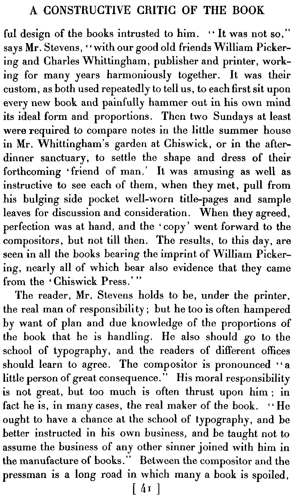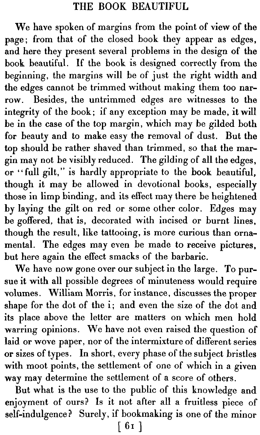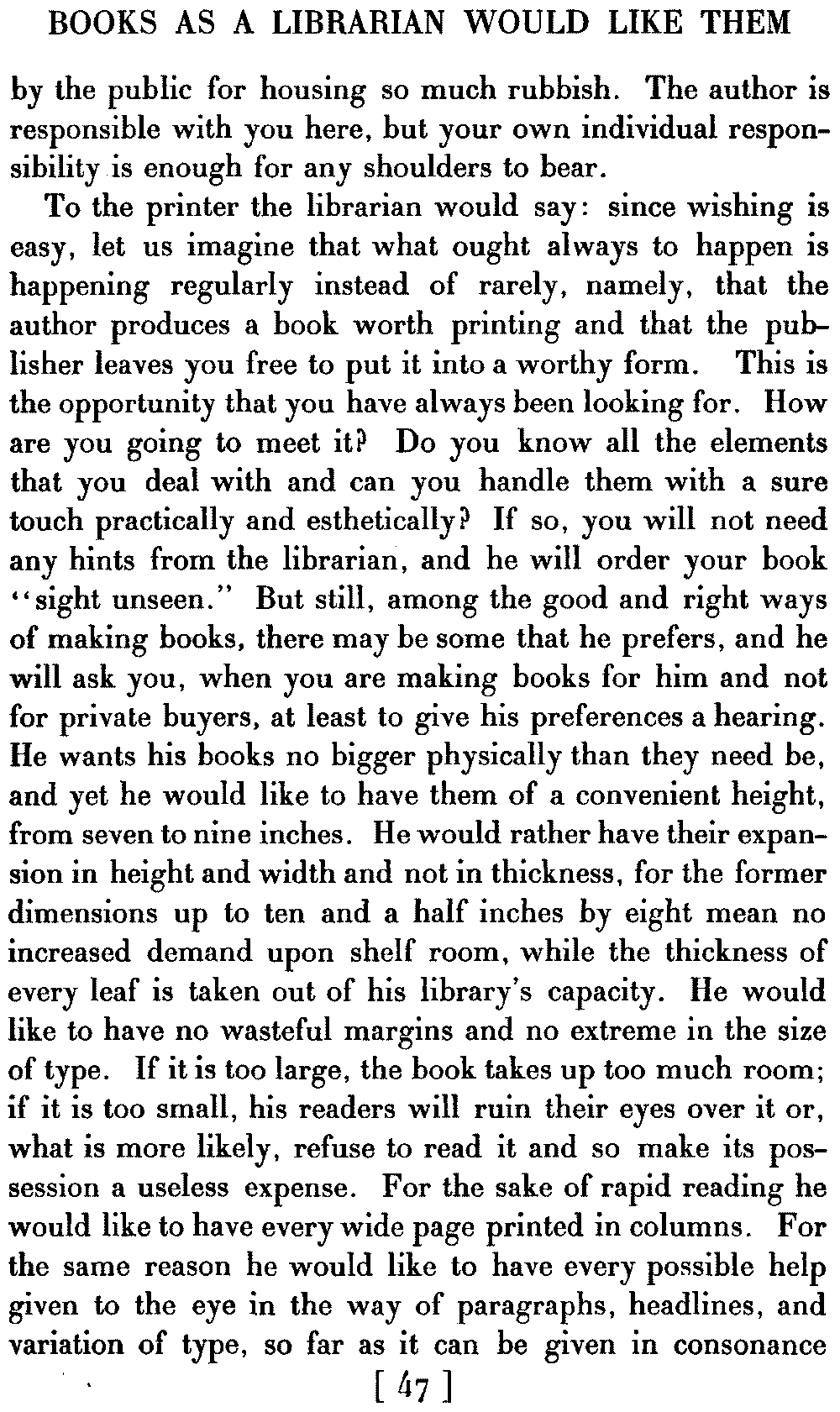 It is surely not an extreme assumption that the first duty of the printer is to the meaning of his author, and his second to esthetics; but shall we not rather say that his duty is to meet both demands, not by a compromise, but by a complete satisfaction of each? A difficult requirement, surely, but one that we are confident the twentieth-century printer will not permit his critics to pronounce impossible.