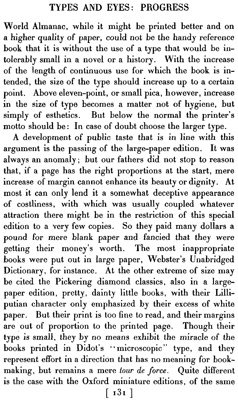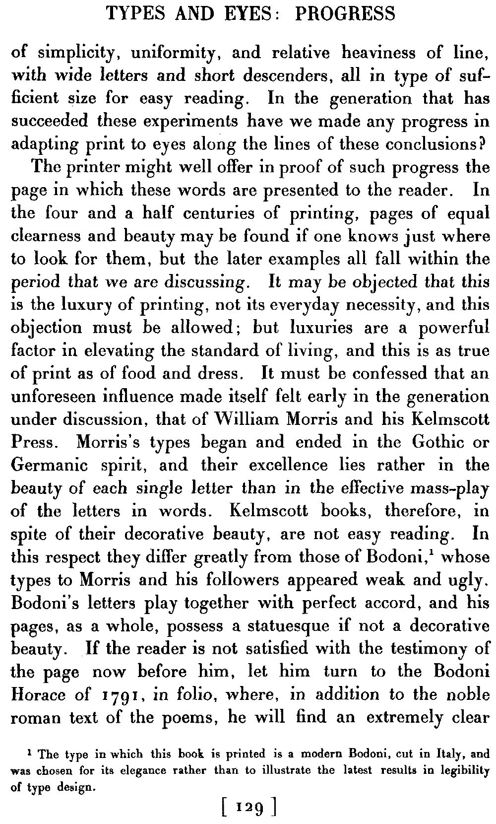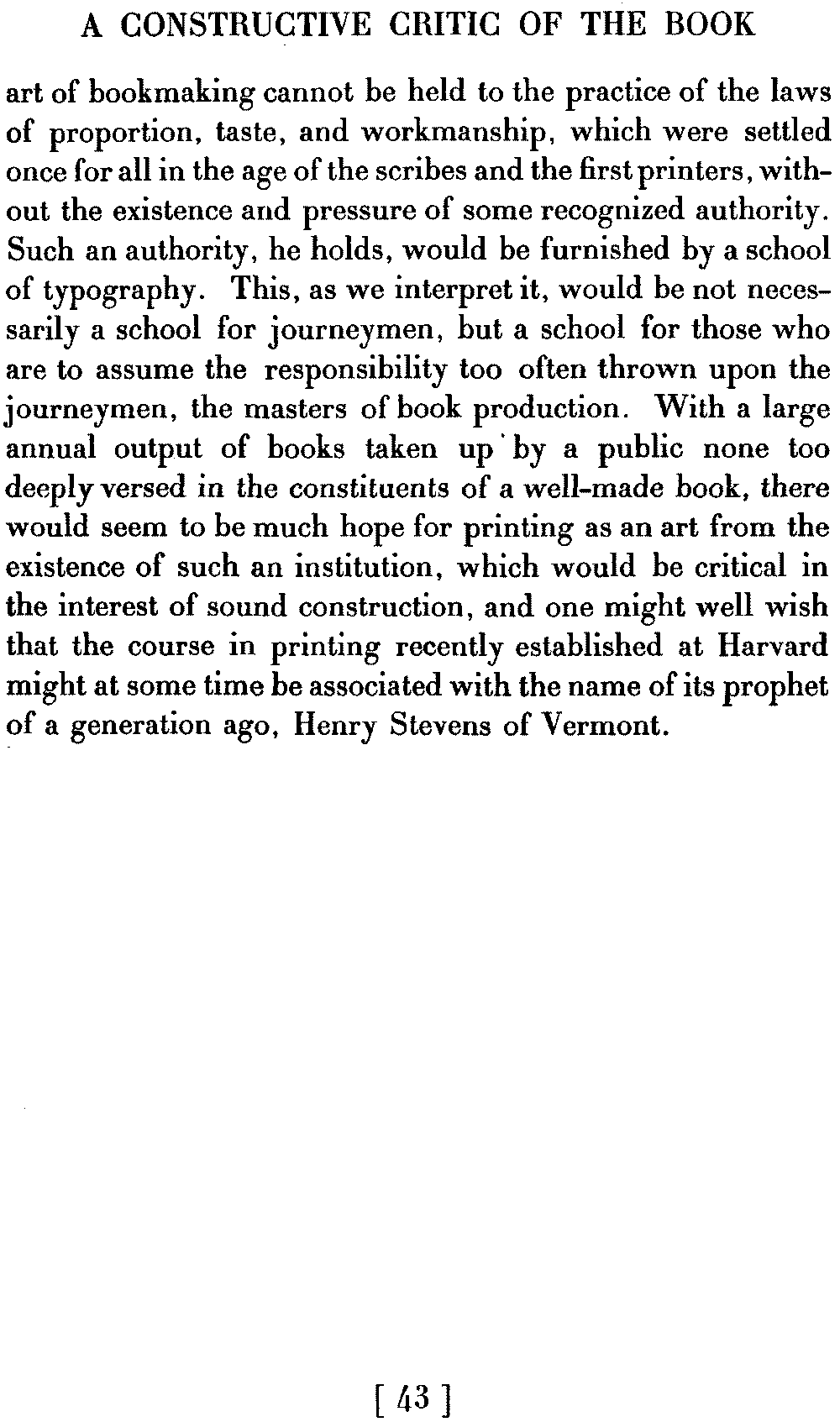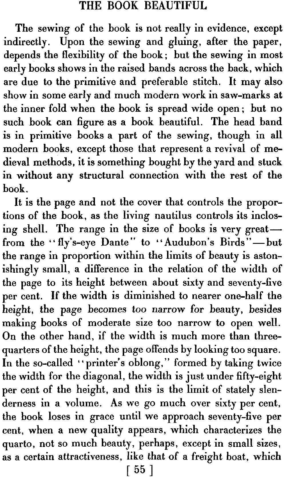 It is surely not an extreme assumption that the first duty of the printer is to the meaning of his author, and his second to esthetics; but shall we not rather say that his duty is to meet both demands, not by a compromise, but by a complete satisfaction of each? A difficult requirement, surely, but one that we are confident the twentieth-century printer will not permit his critics to pronounce impossible.