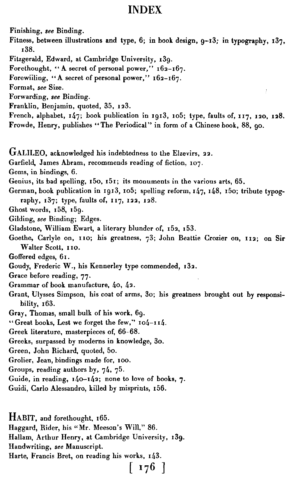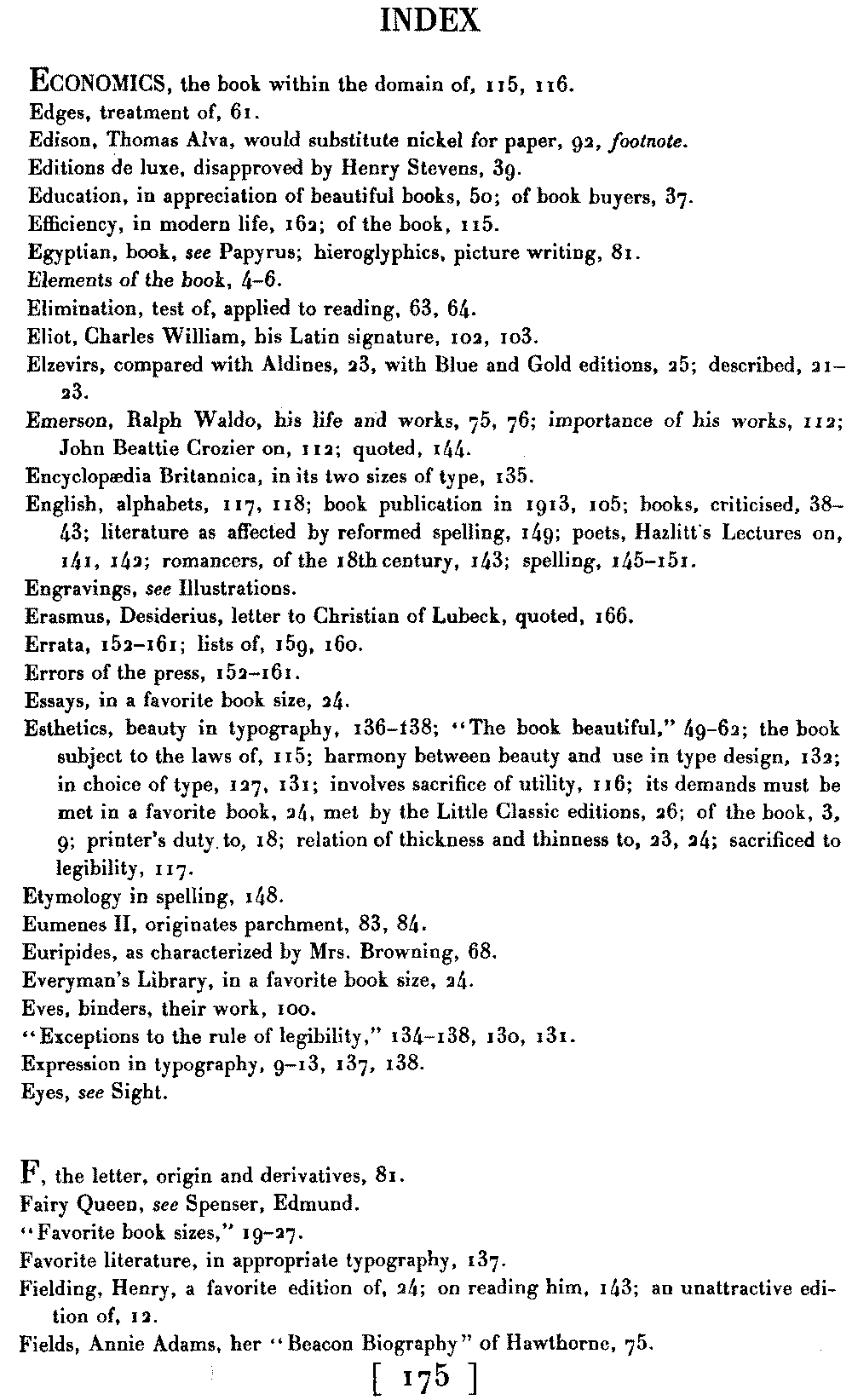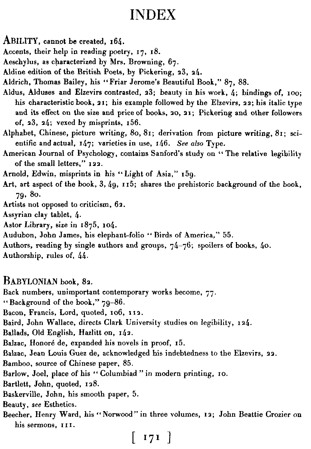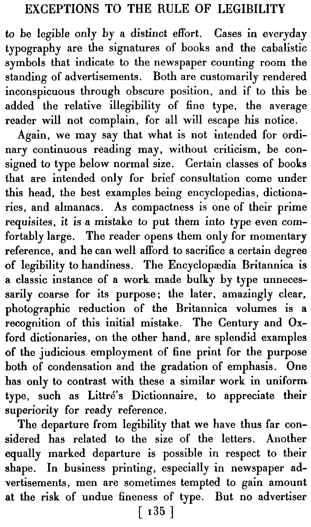 In ordinary text, printing has grown away from the distinctions to the eye that were in vogue two hundred years ago—a gain to art and perhaps to legibility also, though contemporary critics like Franklin lamented the change—but in reference books we have attained to a finer skill in making distinctions to the eye than our forefathers achieved with all their typographic struggles. Nor are our reference pages lacking in beauty. But our familiarity with works of this class tends to obscure their wonderful merit as time-savers and eye-savers. It is only when we take up some foreign dictionary, printed with little contrast of type, perhaps in German text, and bristling with unmeaning abbreviations, that we appreciate our privilege. Surely this is a marvelous mechanical triumph, to present the words of an author in such a form that the eye, to take it in, needs but[17] to sweep rapidly down the page, or, if it merely glances at the page, it shall have the meaning of the whole so focused in a few leading words that it can turn at once to the passage sought, or see that it must look elsewhere. The saving of time so effected may be interpreted either as a lengthening of life or as an increased fullness of life, but it means also a lessening of friction and thus an addition to human comfort.