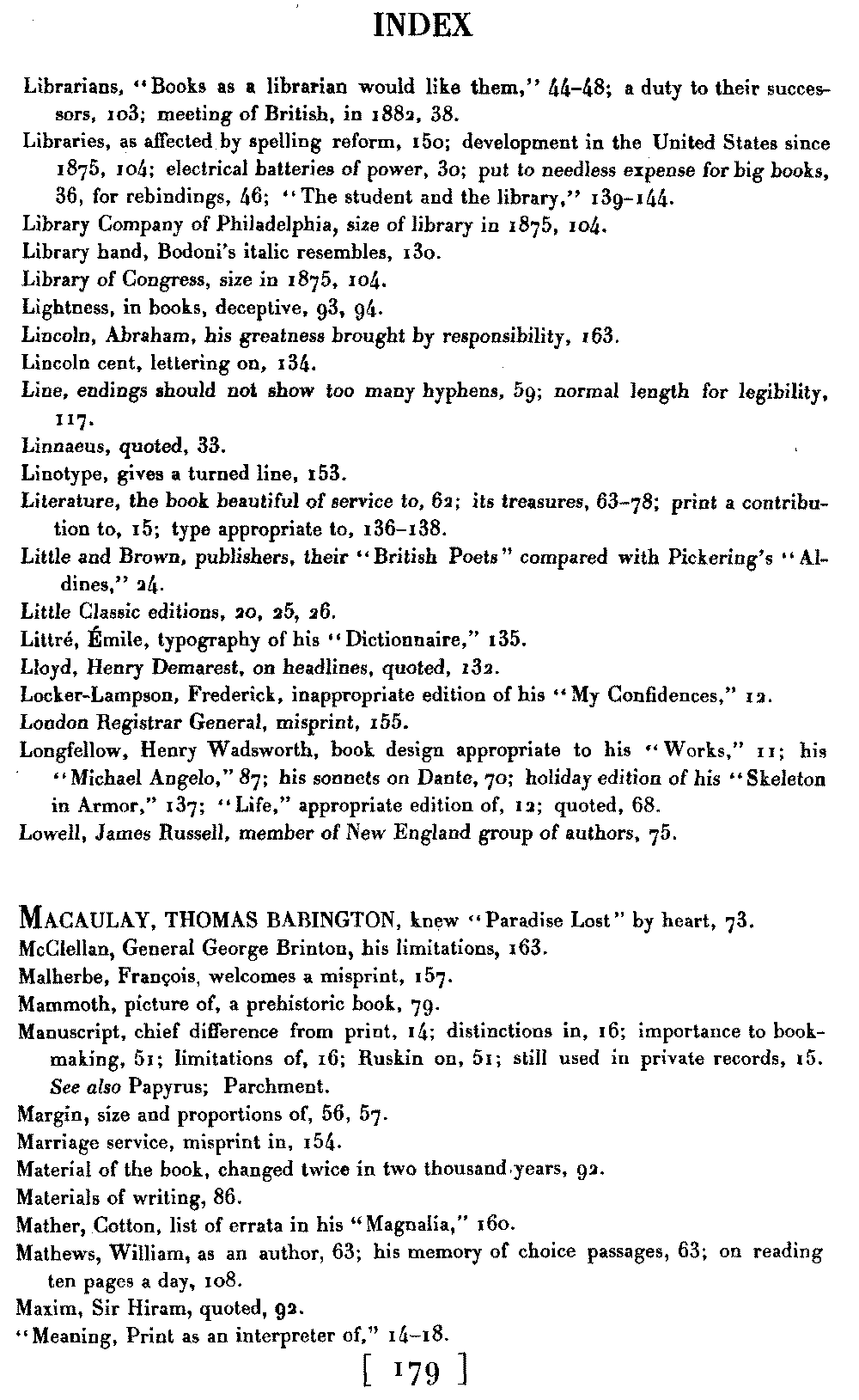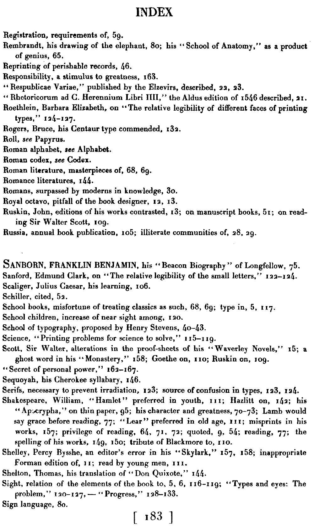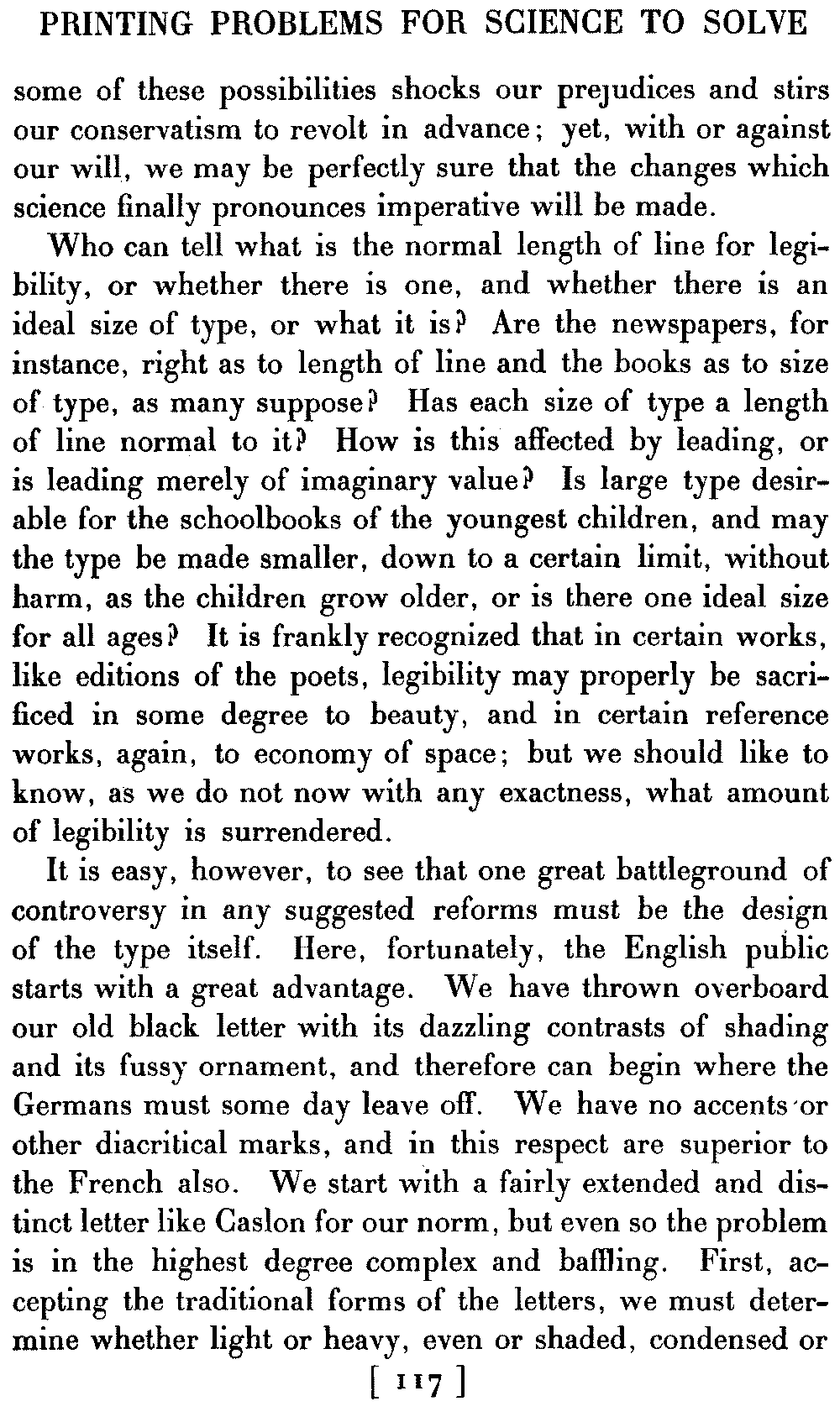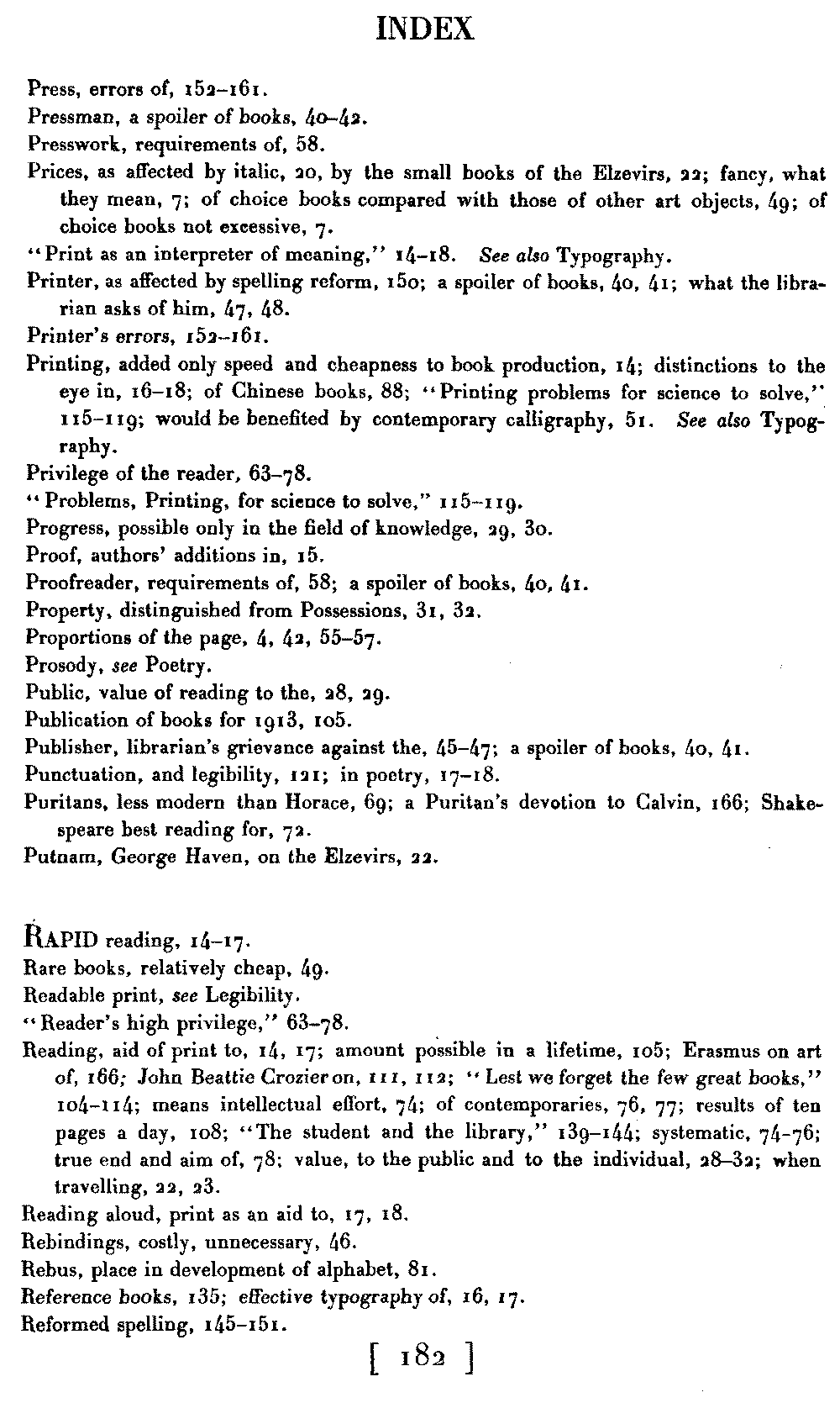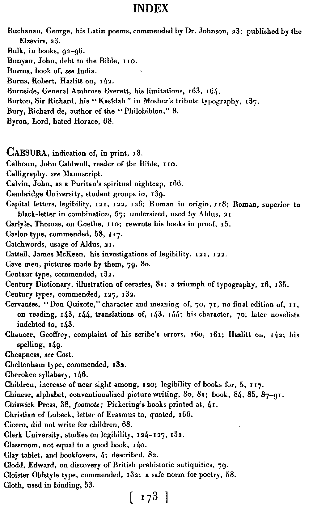 In ordinary text, printing has grown away from the distinctions to the eye that were in vogue two hundred years ago—a gain to art and perhaps to legibility also, though contemporary critics like Franklin lamented the change—but in reference books we have attained to a finer skill in making distinctions to the eye than our forefathers achieved with all their typographic struggles. Nor are our reference pages lacking in beauty. But our familiarity with works of this class tends to obscure their wonderful merit as time-savers and eye-savers. It is only when we take up some foreign dictionary, printed with little contrast of type, perhaps in German text, and bristling with unmeaning abbreviations, that we appreciate our privilege. Surely this is a marvelous mechanical triumph, to present the words of an author in such a form that the eye, to take it in, needs but[17] to sweep rapidly down the page, or, if it merely glances at the page, it shall have the meaning of the whole so focused in a few leading words that it can turn at once to the passage sought, or see that it must look elsewhere. The saving of time so effected may be interpreted either as a lengthening of life or as an increased fullness of life, but it means also a lessening of friction and thus an addition to human comfort.