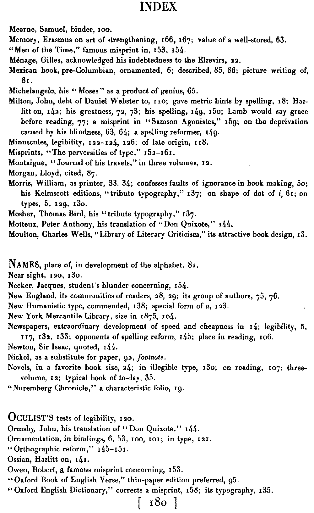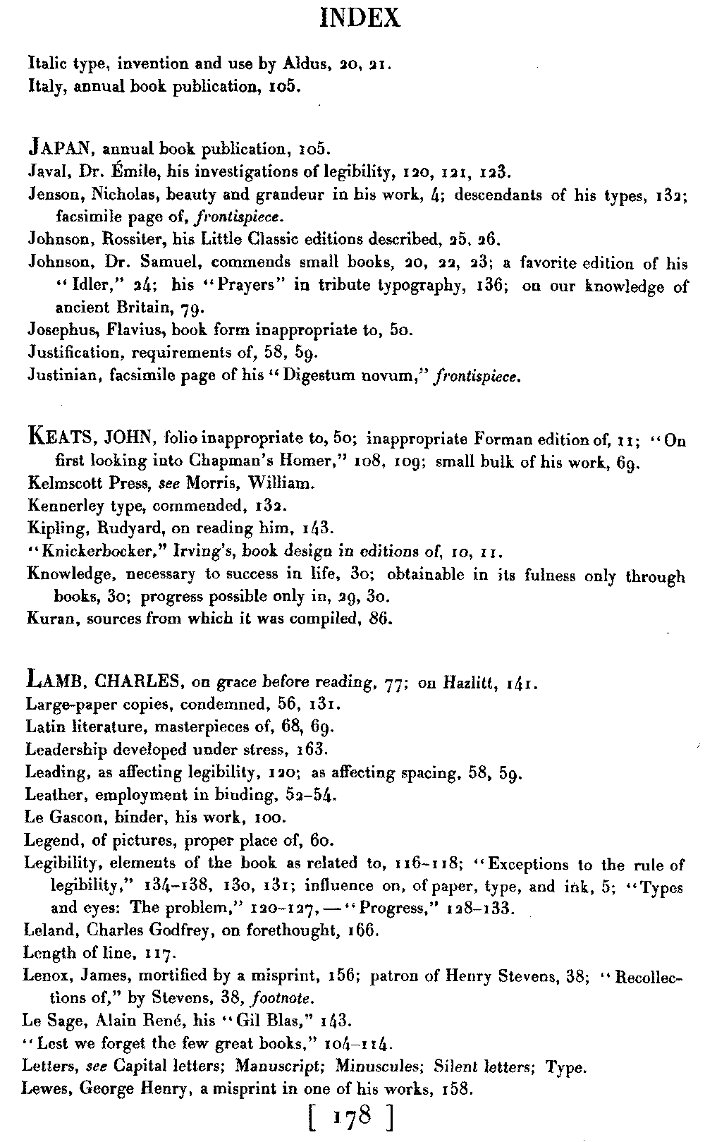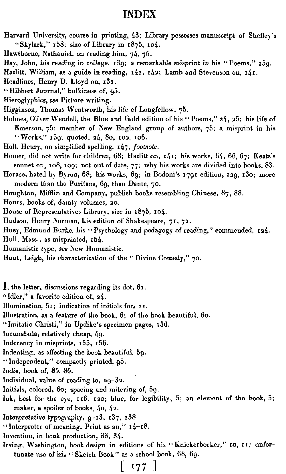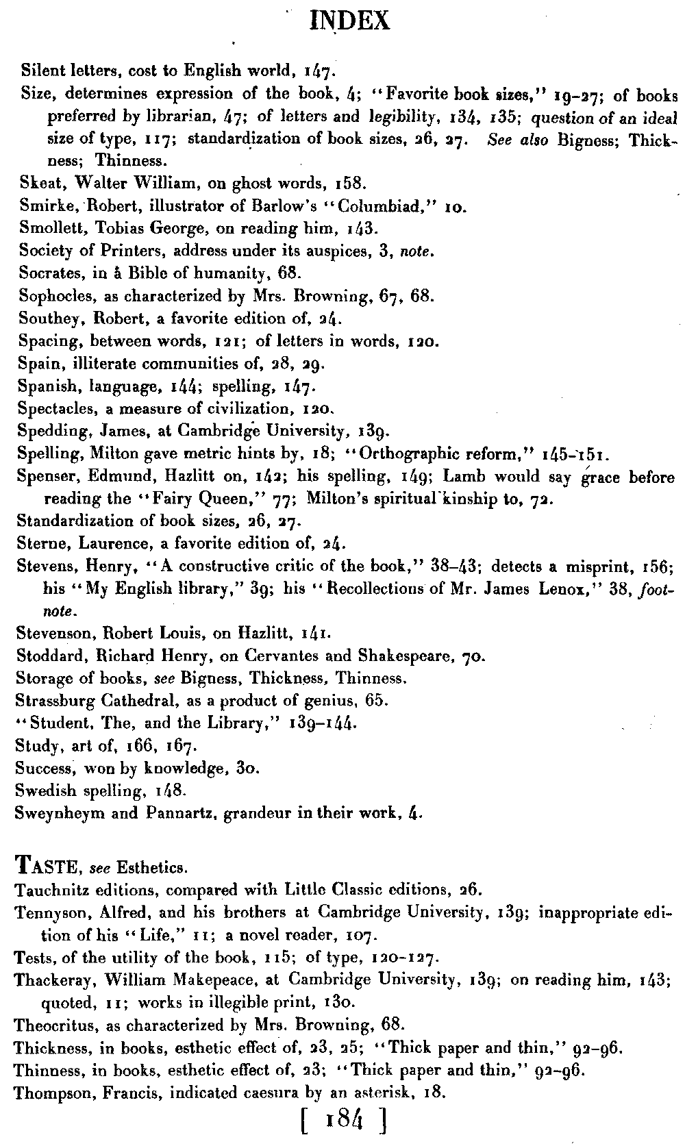 In ordinary text, printing has grown away from the distinctions to the eye that were in vogue two hundred years ago—a gain to art and perhaps to legibility also, though contemporary critics like Franklin lamented the change—but in reference books we have attained to a finer skill in making distinctions to the eye than our forefathers achieved with all their typographic struggles. Nor are our reference pages lacking in beauty. But our familiarity with works of this class tends to obscure their wonderful merit as time-savers and eye-savers. It is only when we take up some foreign dictionary, printed with little contrast of type, perhaps in German text, and bristling with unmeaning abbreviations, that we appreciate our privilege. Surely this is a marvelous mechanical triumph, to present the words of an author in such a form that the eye, to take it in, needs but[17] to sweep rapidly down the page, or, if it merely glances at the page, it shall have the meaning of the whole so focused in a few leading words that it can turn at once to the passage sought, or see that it must look elsewhere. The saving of time so effected may be interpreted either as a lengthening of life or as an increased fullness of life, but it means also a lessening of friction and thus an addition to human comfort.