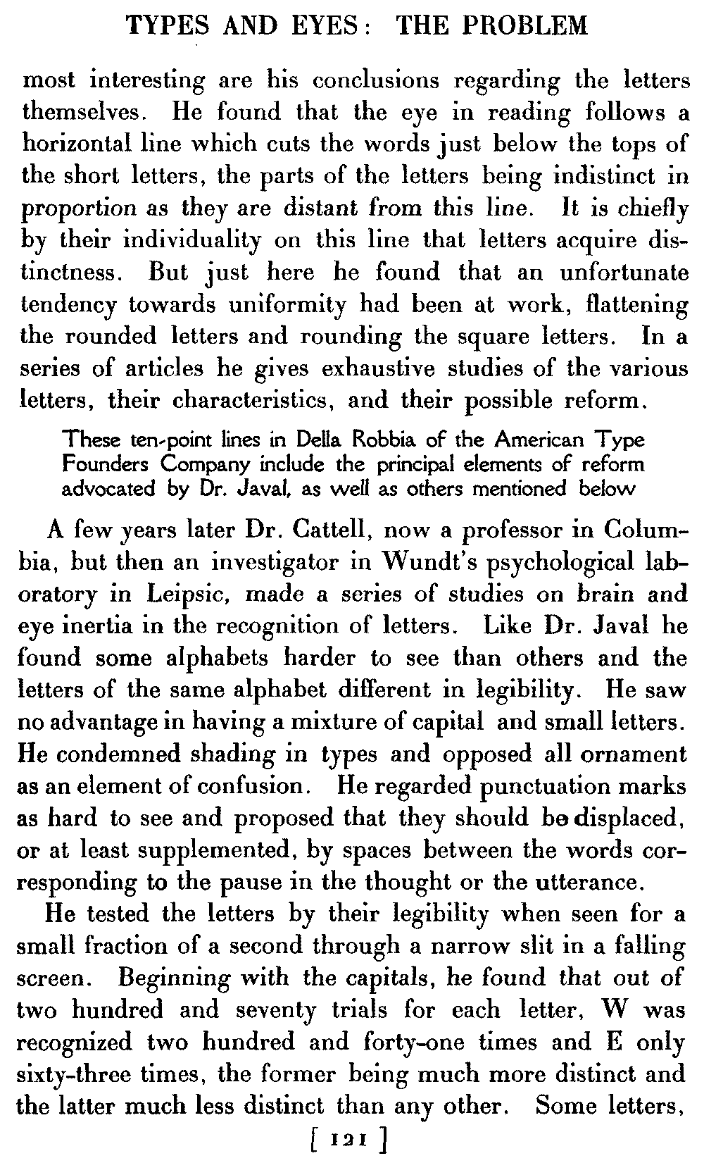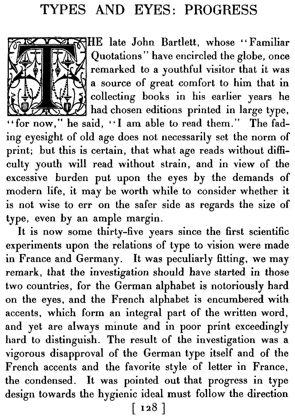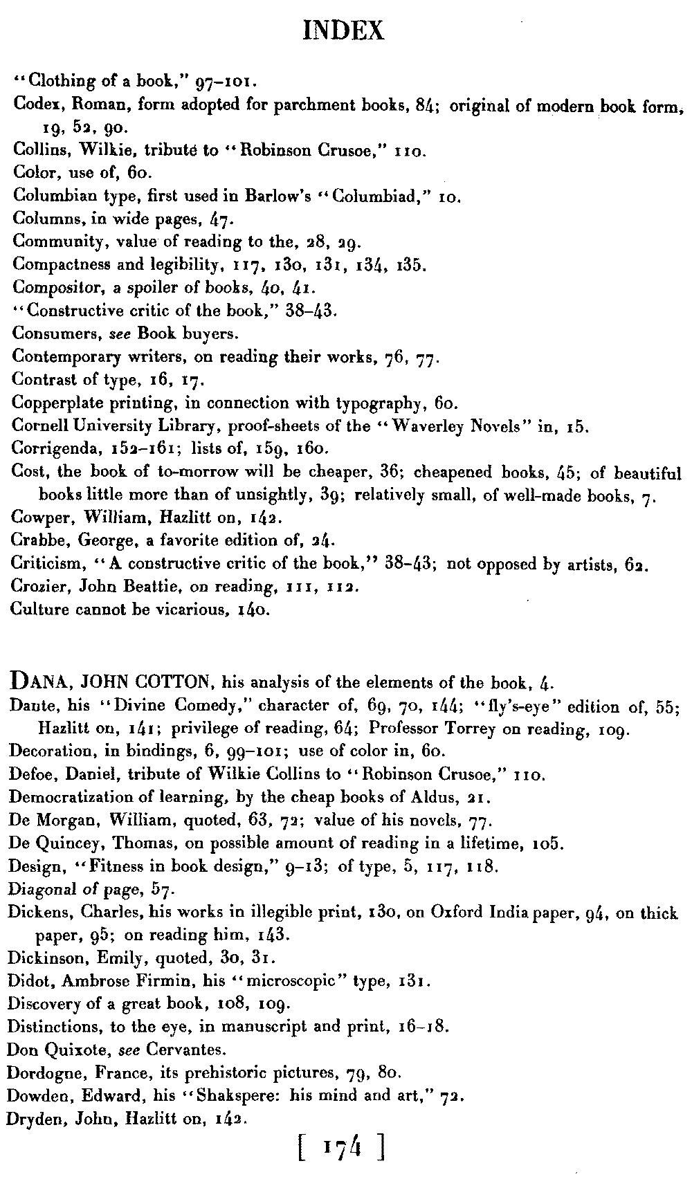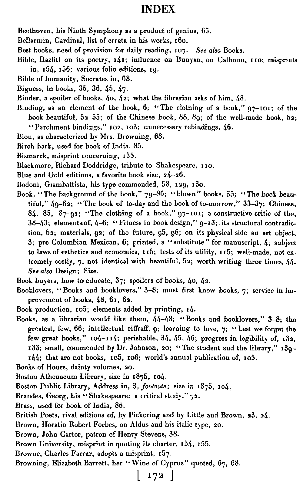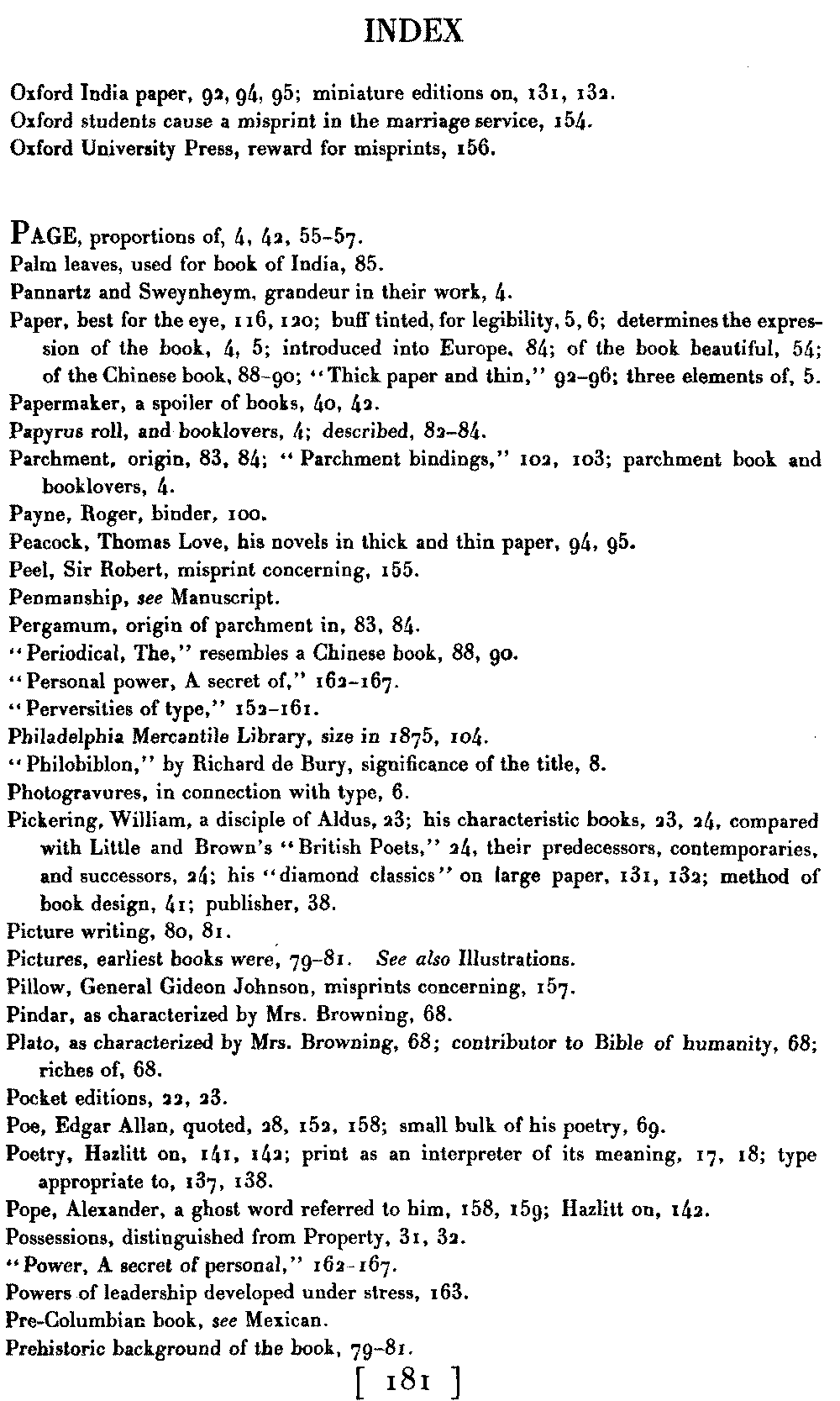 In ordinary text, printing has grown away from the distinctions to the eye that were in vogue two hundred years ago—a gain to art and perhaps to legibility also, though contemporary critics like Franklin lamented the change—but in reference books we have attained to a finer skill in making distinctions to the eye than our forefathers achieved with all their typographic struggles. Nor are our reference pages lacking in beauty. But our familiarity with works of this class tends to obscure their wonderful merit as time-savers and eye-savers. It is only when we take up some foreign dictionary, printed with little contrast of type, perhaps in German text, and bristling with unmeaning abbreviations, that we appreciate our privilege. Surely this is a marvelous mechanical triumph, to present the words of an author in such a form that the eye, to take it in, needs but[17] to sweep rapidly down the page, or, if it merely glances at the page, it shall have the meaning of the whole so focused in a few leading words that it can turn at once to the passage sought, or see that it must look elsewhere. The saving of time so effected may be interpreted either as a lengthening of life or as an increased fullness of life, but it means also a lessening of friction and thus an addition to human comfort.