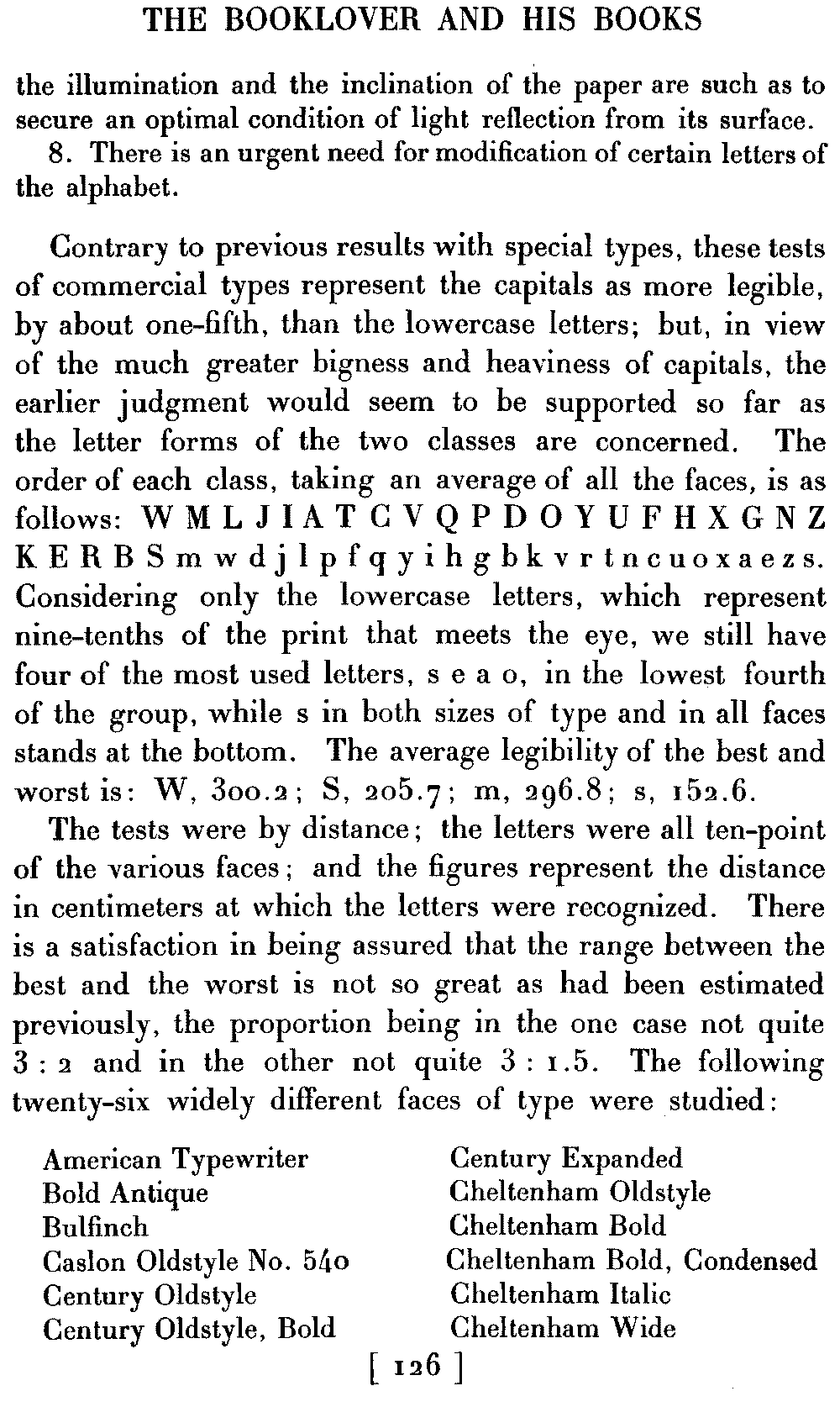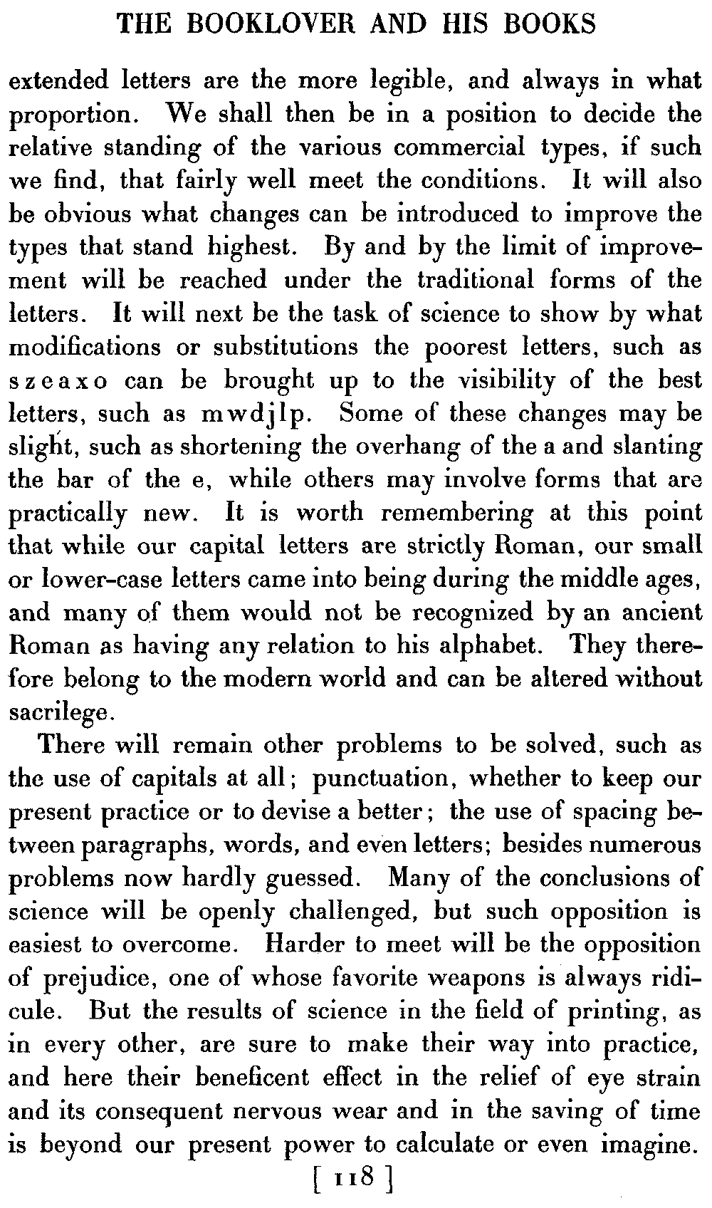 Taking the service of printing as it stands to-day, what does it actually do for the reader? What is the great difference between the printed word and even the best handwriting? It is obviously the condensation and the absolute mechanical sameness of print. The advantage of these differences to the eye in respect to rapid reading is hardly to be overestimated. Let any one take a specimen of average penmanship and note the time which he consumes in reading it; let him compare with this the time occupied in reading the same number of printed words, and the difference will[15] be startling; but not even so will it do justice to print, for handwriting average in quality is very far from average in frequency. If it be urged that the twentieth-century comparison should be between typewriting and print, we may reply that typewriting is print, though it lacks most of its condensation, and that the credit for its superior legibility belongs to typography, of which the new art is obviously a by-product. But we are not yet out of the manuscript period, so far as private records are concerned, and it still is true, as it has been for many generations, that print multiplies the years of every scholar's and reader's life.