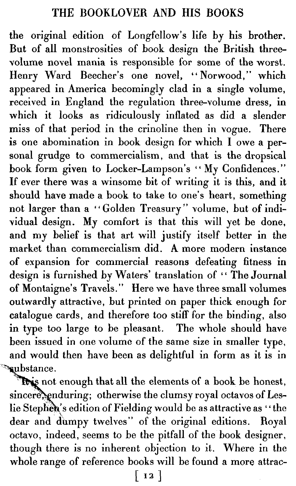 Obviously, in giving form to a single work a designer is freer than in handling a series by one or by various authors. In such cases he must seize upon more general and therefore less salient characteristics. The designer of "Hiawatha" or "Evangeline" has a fairly clear task before him, with a chance of distinct success or failure; but the designer of an appropriate form for the whole series of Longfellow's works, both prose and poetry, has a less individualized problem, and must think of the elements that run through all,—sweetness, grace, gentleness, dignity, learning. Yet, though general, these qualities in a series may be far from vague. We have only to consider the absurdity of a handy-volume Gibbon or a folio Lamb. On looking at the bulky, large-type, black-covered volumes of the Forman edition of Shelley and Keats one instinctively asks, "What crime did these poets commit that they should be so impounded?" The original edition of the life of Tennyson by his son, in two lumbering, royal octavo volumes, comes near to what Thackeray called the Farnese Hercules, "a hulking abortion." Contrast with it the dignity linked with charm of[12] the original edition of Longfellow's life by his brother. But of all monstrosities of book design the British three-volume novel mania is responsible for some of the worst. Henry Ward Beecher's one novel, "Norwood," which appeared in America becomingly clad in a single volume, received in England the regulation three-volume dress, in which it looks as ridiculously inflated as did a slender miss of that period in the crinoline then in vogue. There is one abomination in book design for which I owe a personal grudge to commercialism, and that is the dropsical book form given to Locker-Lampson's "My Confidences." If ever there was a winsome bit of writing it is this, and it should have made a book to take to one's heart, something not larger than a "Golden Treasury" volume, but of individual design. My comfort is that this will yet be done, and my belief is that art will justify itself better in the market than commercialism did. A more modern instance of expansion for commercial reasons defeating fitness in design is furnished by Waters' translation of "The Journal of Montaigne's Travels." Here we have three small volumes outwardly attractive, but printed on paper thick enough for catalogue cards, and therefore too stiff for the binding, also in type too large to be pleasant. The whole should have been issued in one volume of the same size in smaller type, and would then have been as delightful in form as it is in substance.