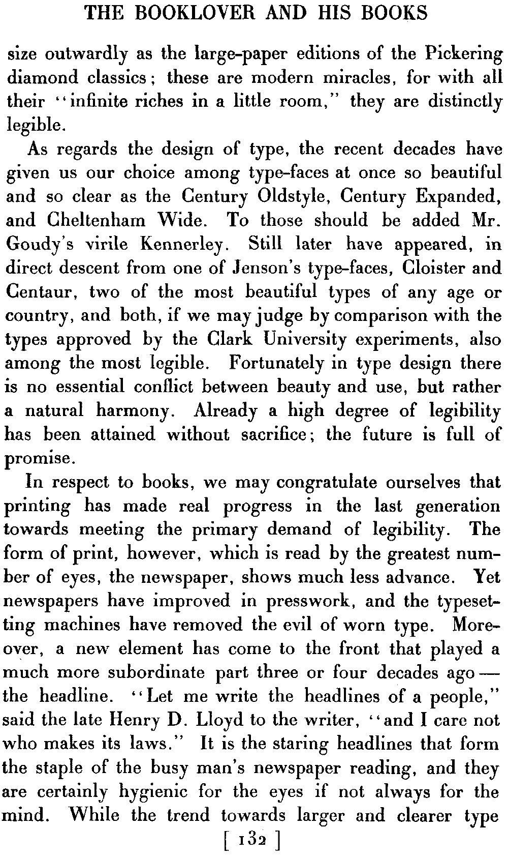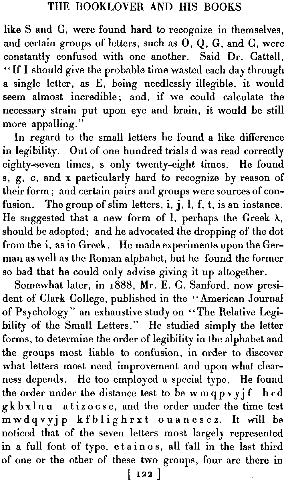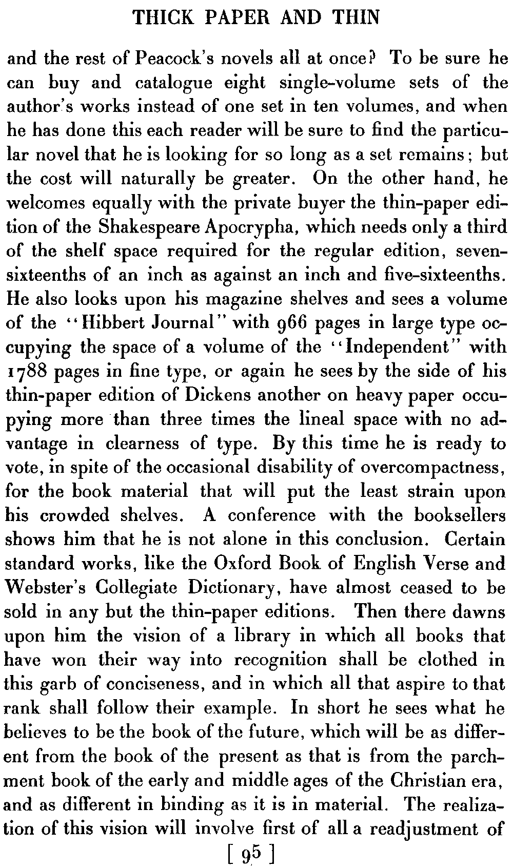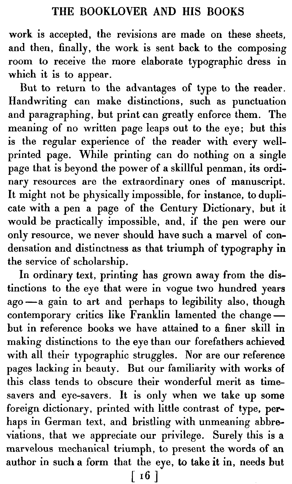 But to return to the advantages of type to the reader. Handwriting can make distinctions, such as punctuation and paragraphing, but print can greatly enforce them. The meaning of no written page leaps out to the eye; but this is the regular experience of the reader with every well-printed page. While printing can do nothing on a single page that is beyond the power of a skillful penman, its ordinary resources are the extraordinary ones of manuscript. It might not be physically impossible, for instance, to duplicate with a pen a page of the Century Dictionary, but it would be practically impossible, and, if the pen were our only resource, we never should have such a marvel of condensation and distinctness as that triumph of typography in the service of scholarship.
