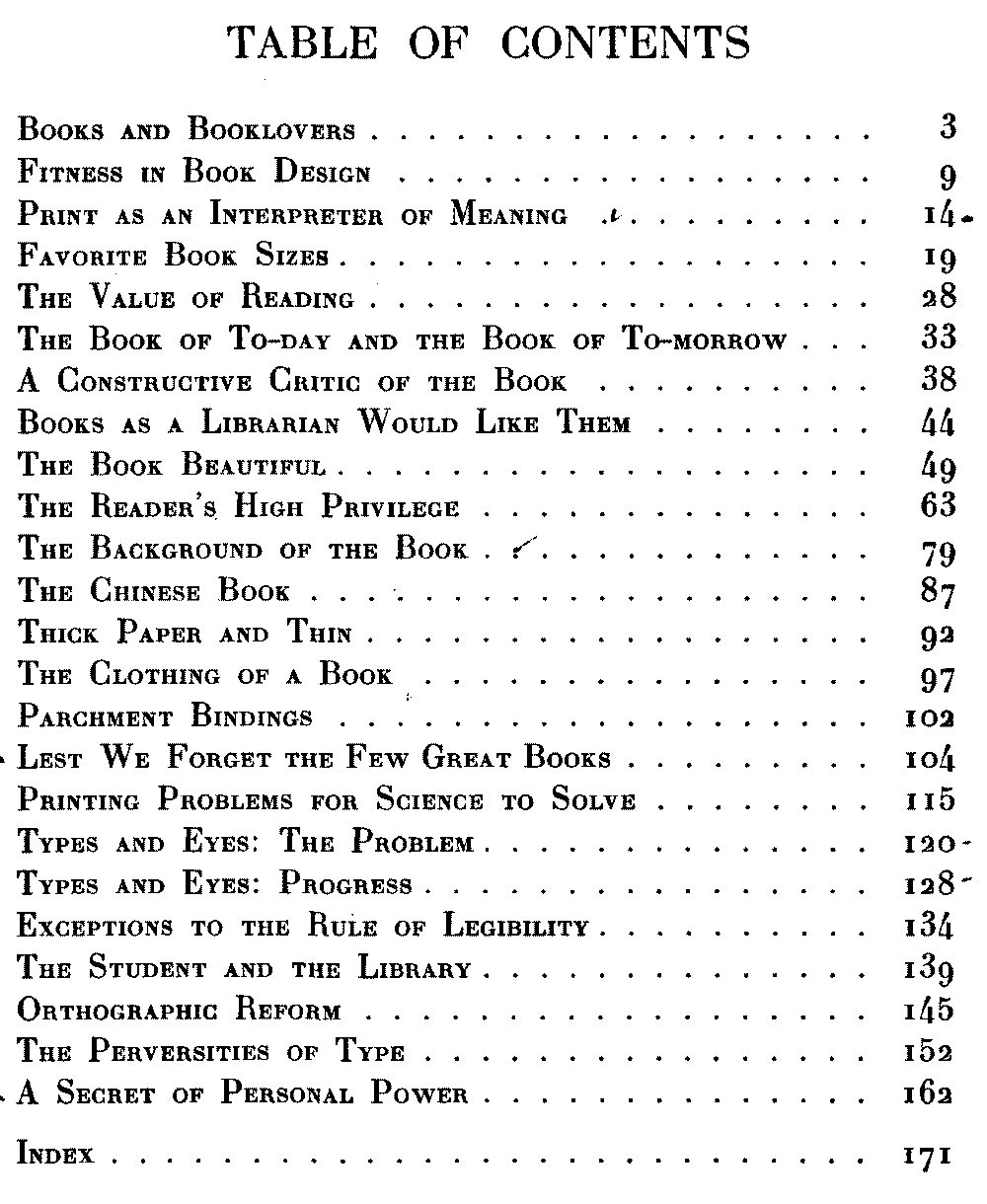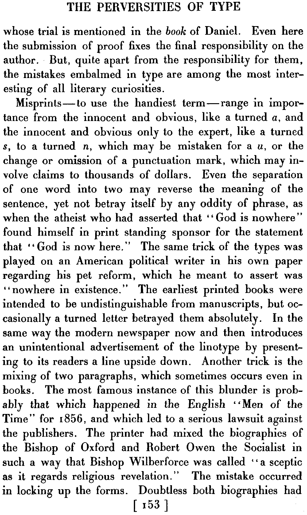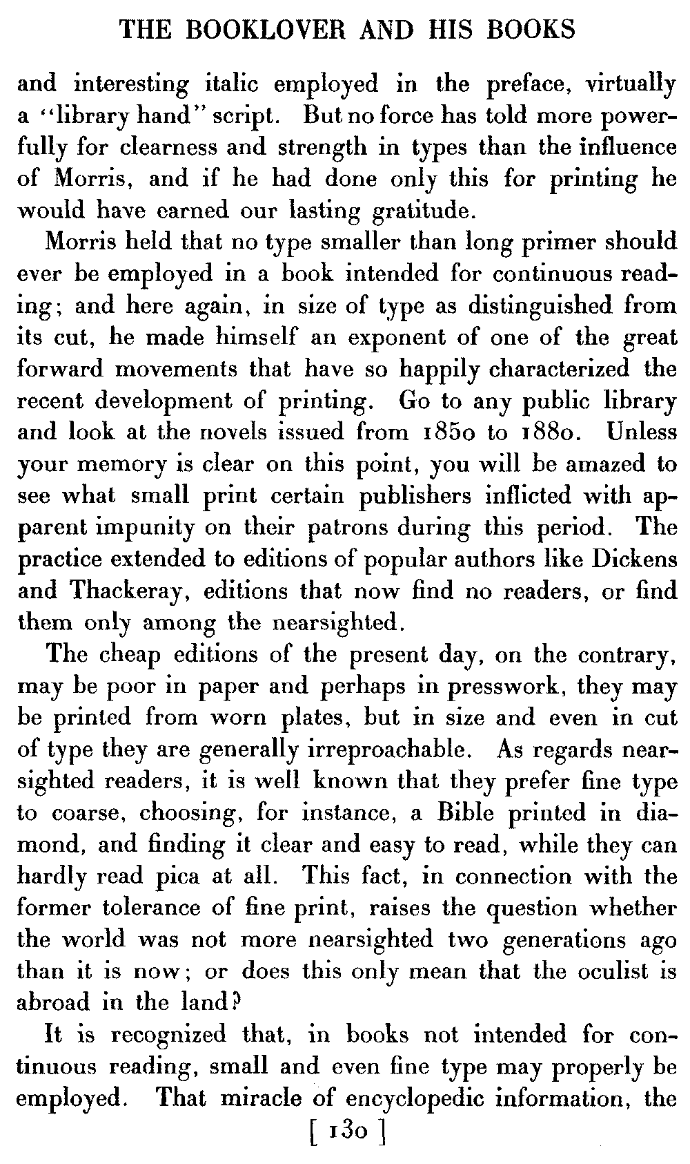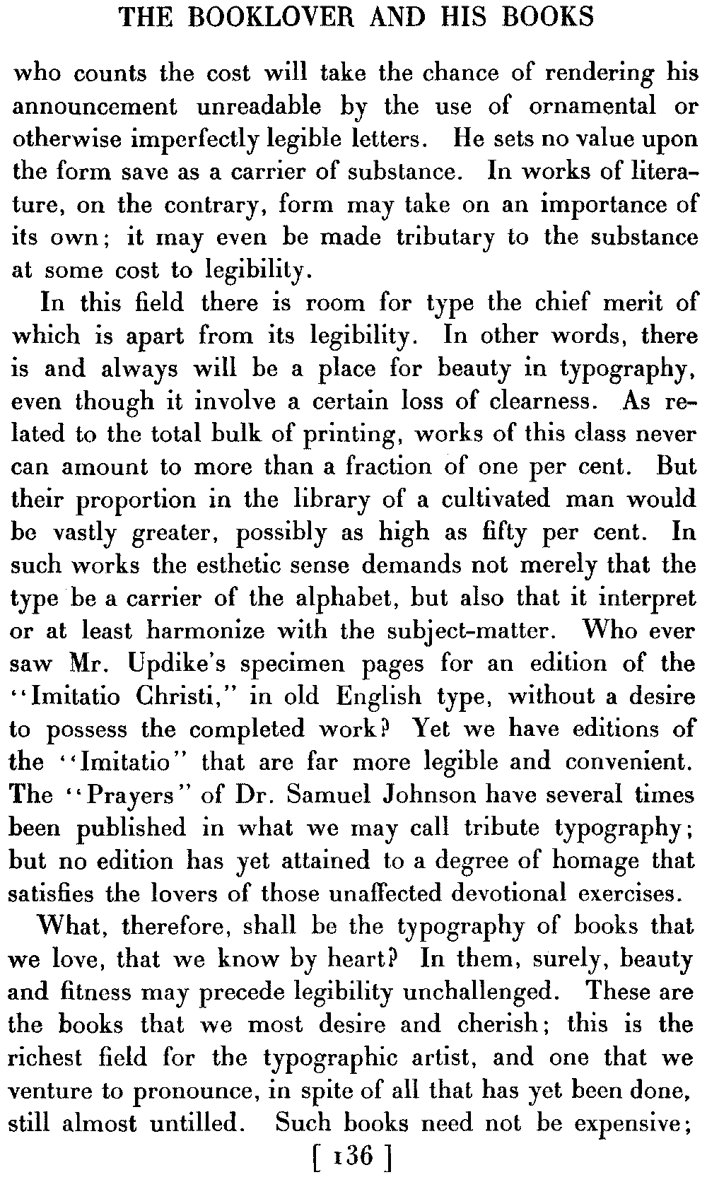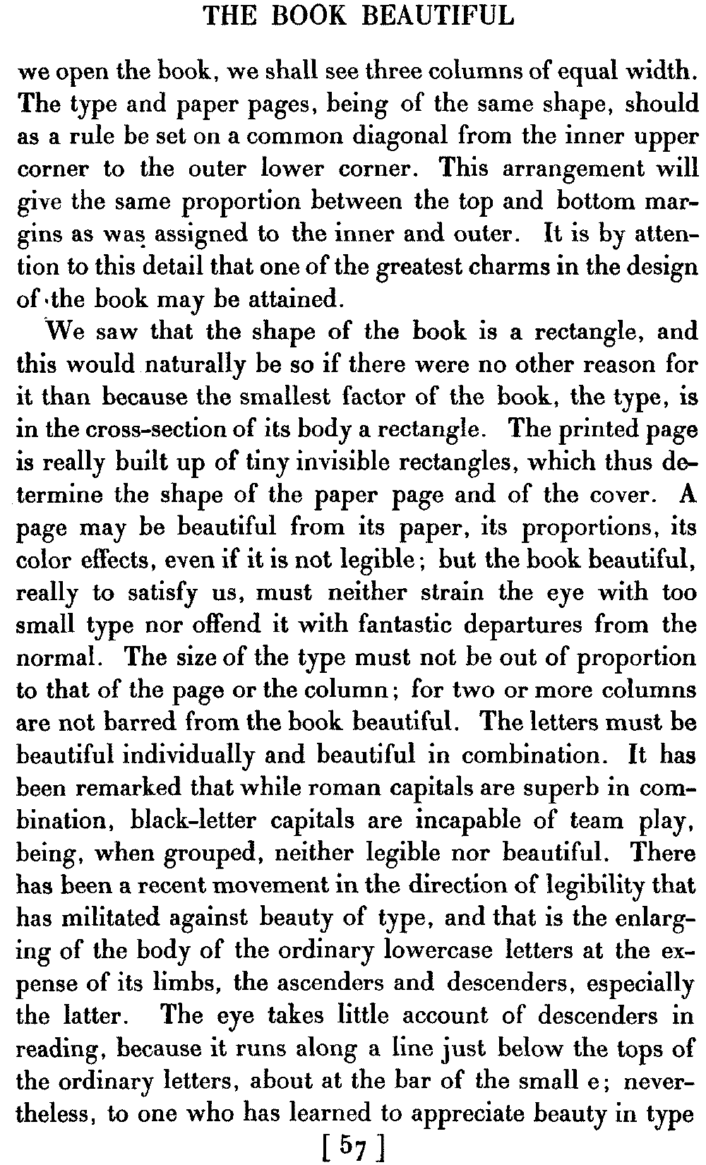 But to return to the advantages of type to the reader. Handwriting can make distinctions, such as punctuation and paragraphing, but print can greatly enforce them. The meaning of no written page leaps out to the eye; but this is the regular experience of the reader with every well-printed page. While printing can do nothing on a single page that is beyond the power of a skillful penman, its ordinary resources are the extraordinary ones of manuscript. It might not be physically impossible, for instance, to duplicate with a pen a page of the Century Dictionary, but it would be practically impossible, and, if the pen were our only resource, we never should have such a marvel of condensation and distinctness as that triumph of typography in the service of scholarship.