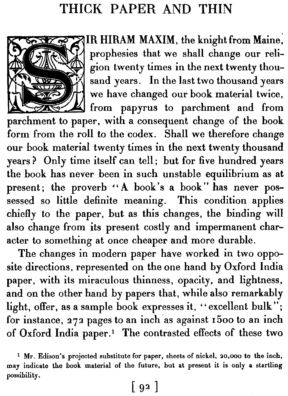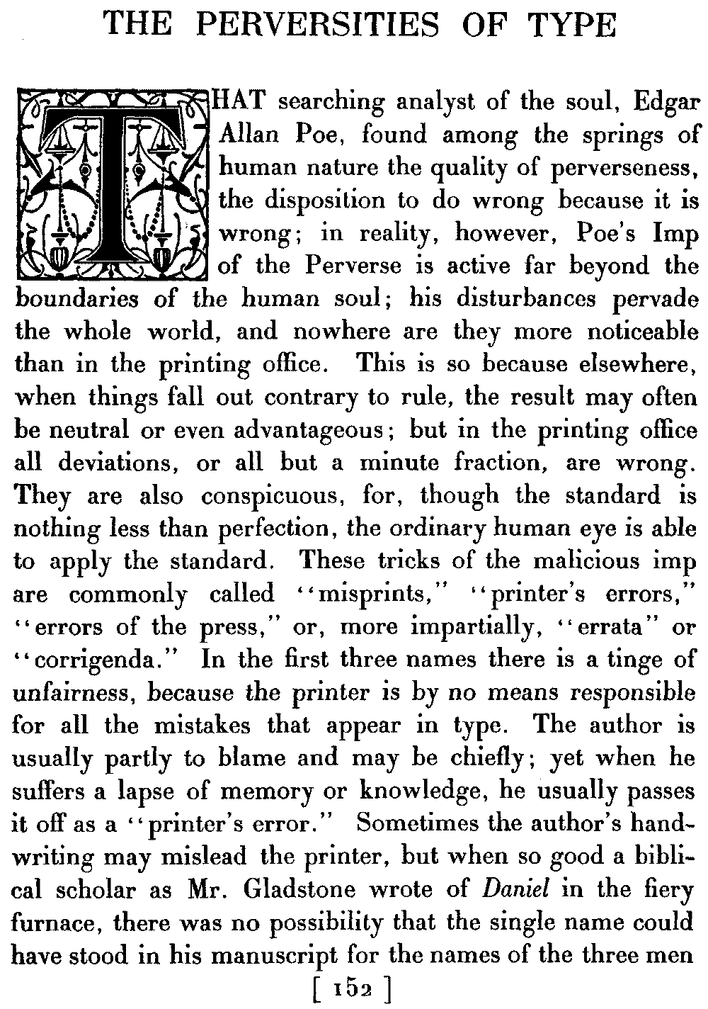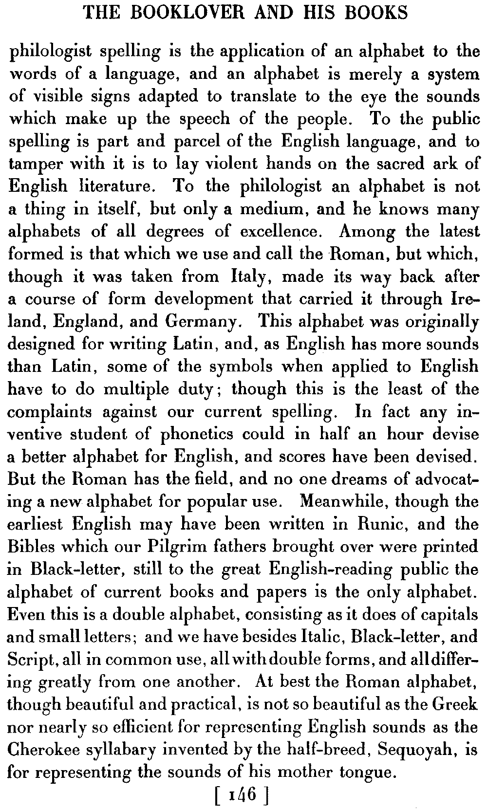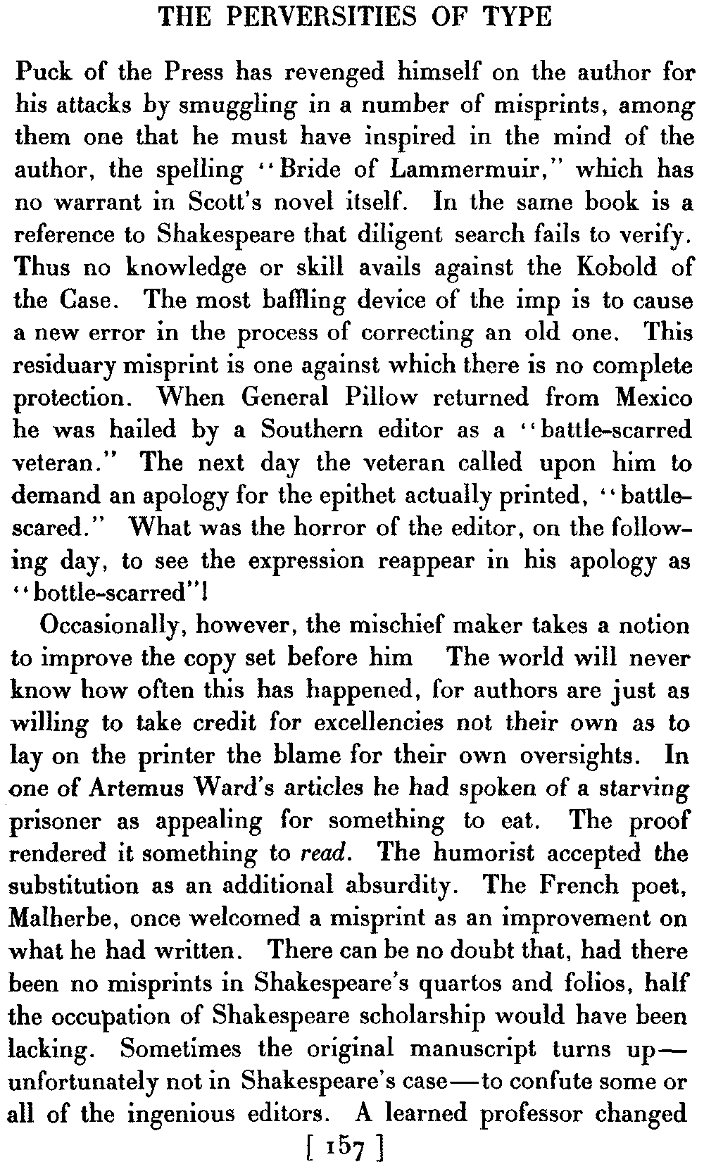 But to return to the advantages of type to the reader. Handwriting can make distinctions, such as punctuation and paragraphing, but print can greatly enforce them. The meaning of no written page leaps out to the eye; but this is the regular experience of the reader with every well-printed page. While printing can do nothing on a single page that is beyond the power of a skillful penman, its ordinary resources are the extraordinary ones of manuscript. It might not be physically impossible, for instance, to duplicate with a pen a page of the Century Dictionary, but it would be practically impossible, and, if the pen were our only resource, we never should have such a marvel of condensation and distinctness as that triumph of typography in the service of scholarship.