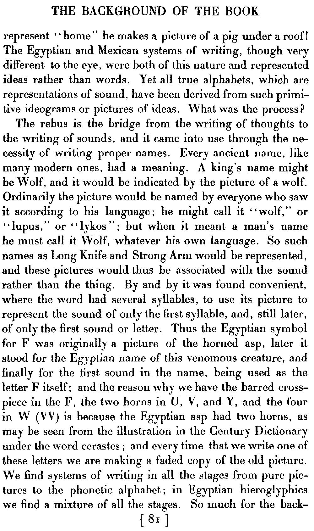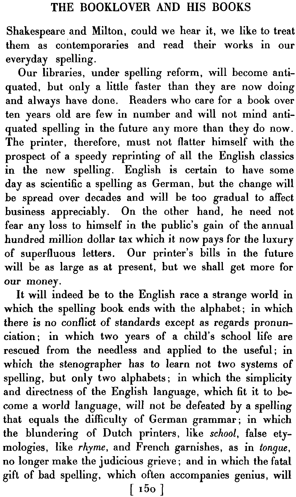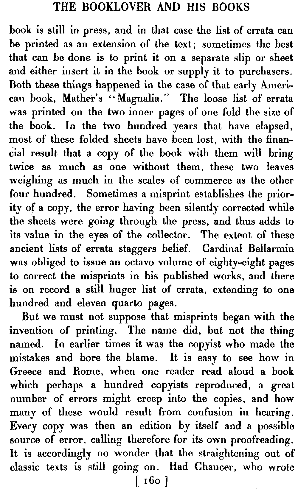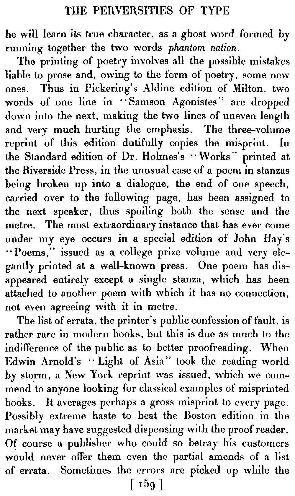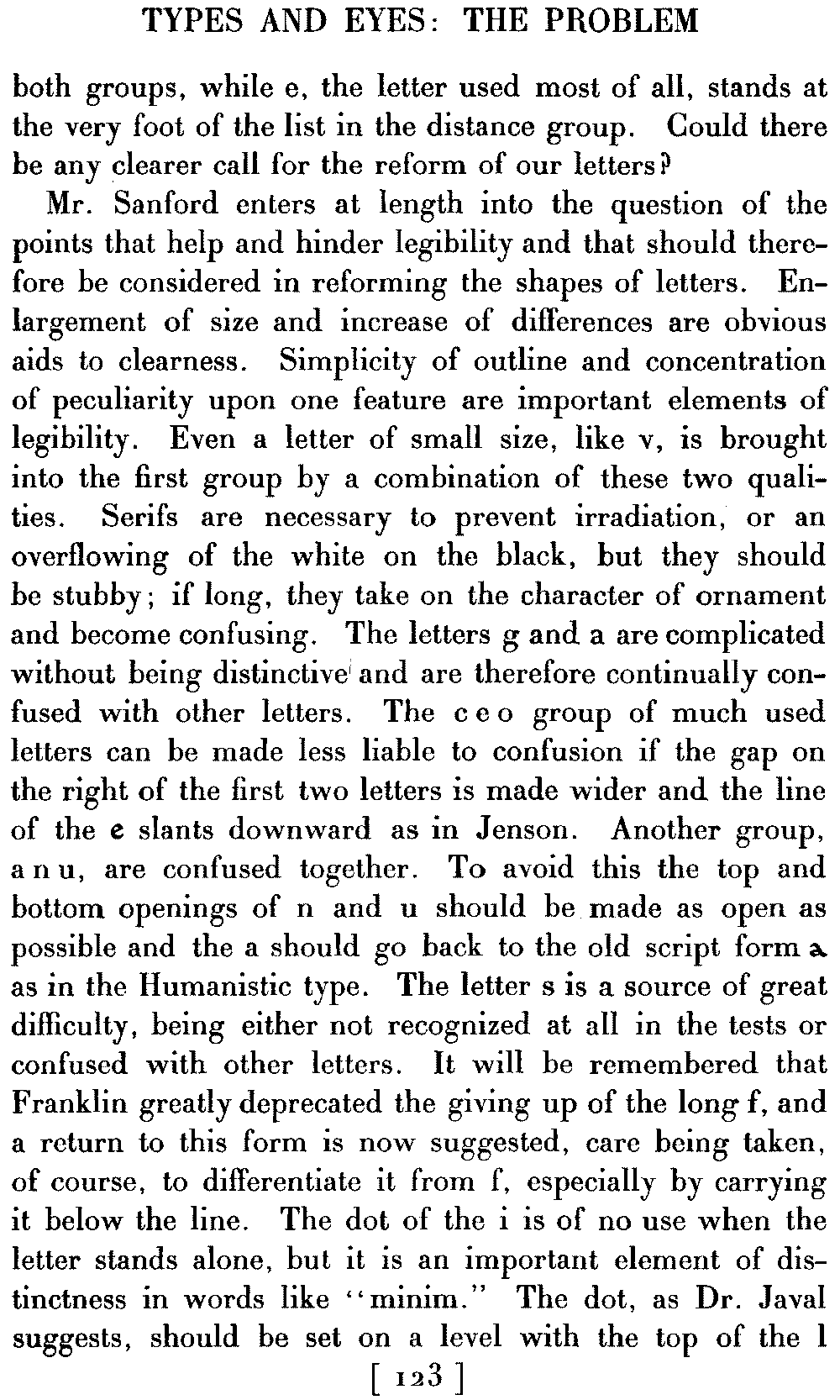 But to return to the advantages of type to the reader. Handwriting can make distinctions, such as punctuation and paragraphing, but print can greatly enforce them. The meaning of no written page leaps out to the eye; but this is the regular experience of the reader with every well-printed page. While printing can do nothing on a single page that is beyond the power of a skillful penman, its ordinary resources are the extraordinary ones of manuscript. It might not be physically impossible, for instance, to duplicate with a pen a page of the Century Dictionary, but it would be practically impossible, and, if the pen were our only resource, we never should have such a marvel of condensation and distinctness as that triumph of typography in the service of scholarship.