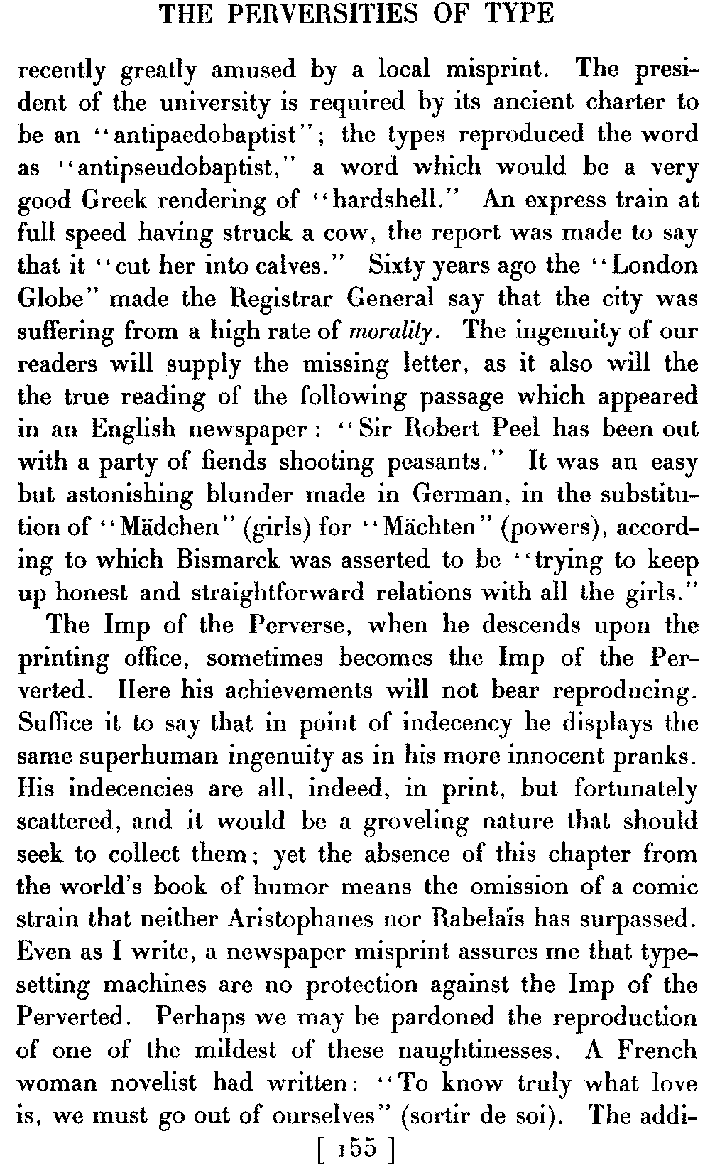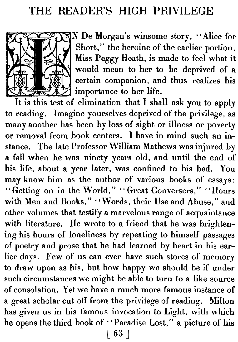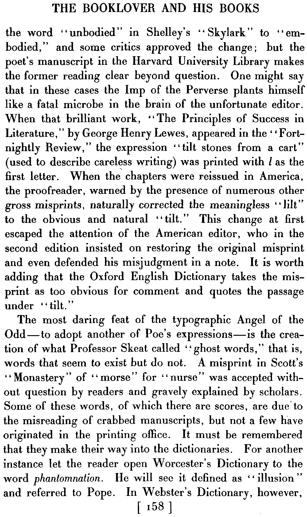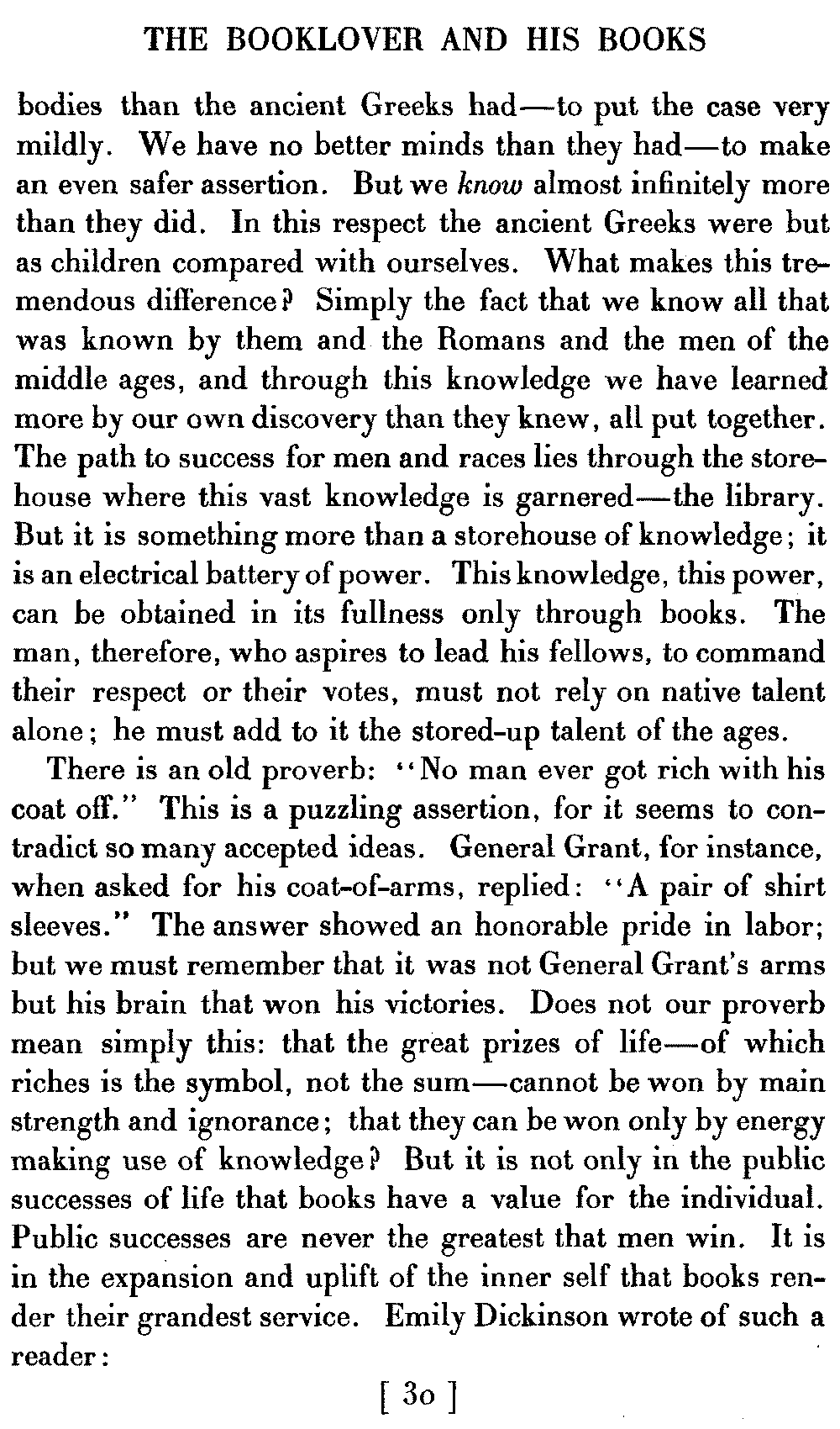 But to return to the advantages of type to the reader. Handwriting can make distinctions, such as punctuation and paragraphing, but print can greatly enforce them. The meaning of no written page leaps out to the eye; but this is the regular experience of the reader with every well-printed page. While printing can do nothing on a single page that is beyond the power of a skillful penman, its ordinary resources are the extraordinary ones of manuscript. It might not be physically impossible, for instance, to duplicate with a pen a page of the Century Dictionary, but it would be practically impossible, and, if the pen were our only resource, we never should have such a marvel of condensation and distinctness as that triumph of typography in the service of scholarship.