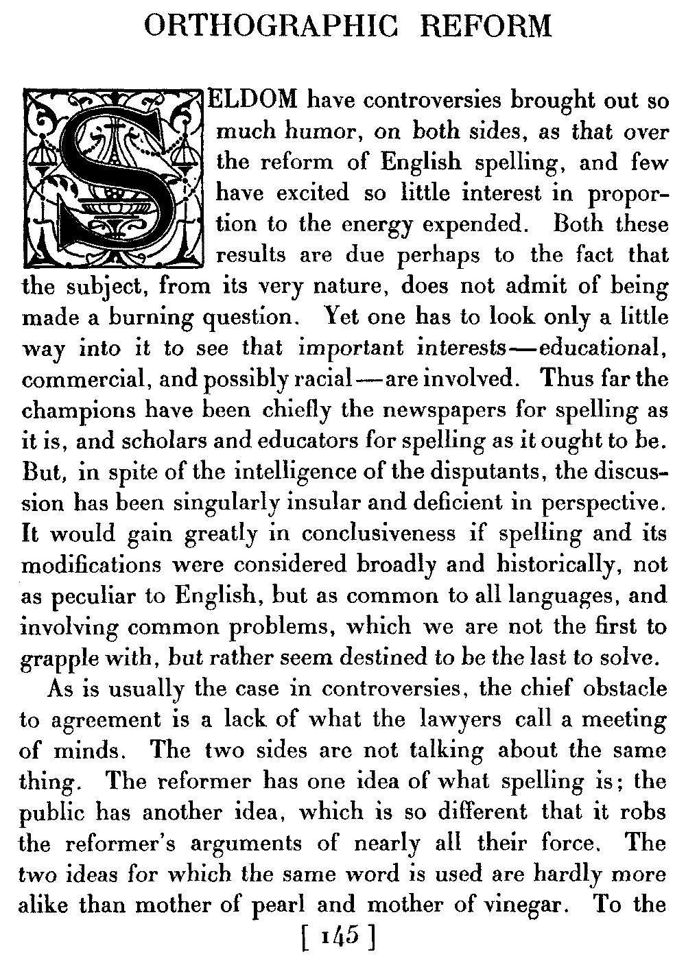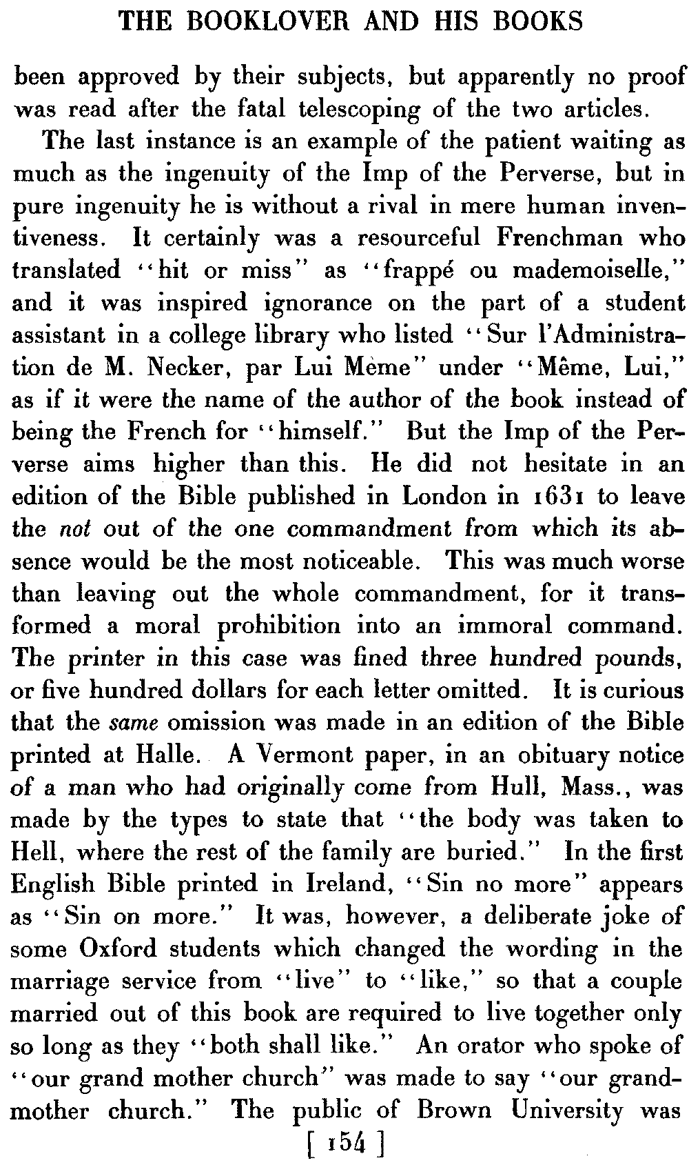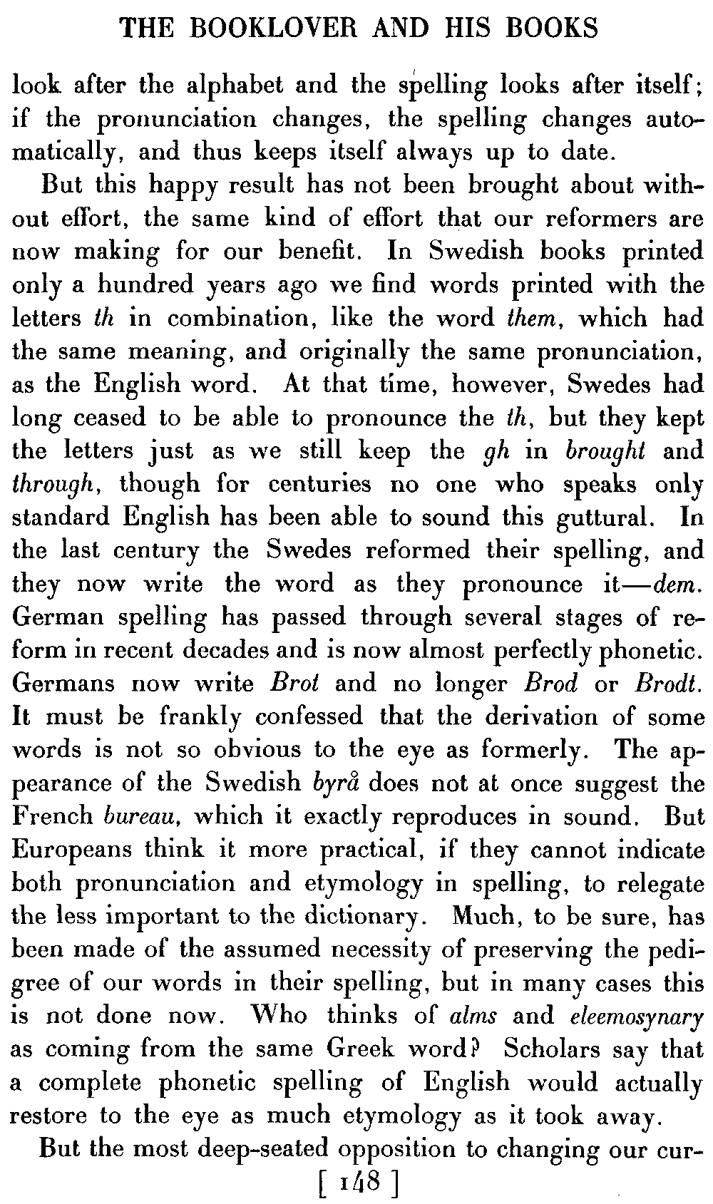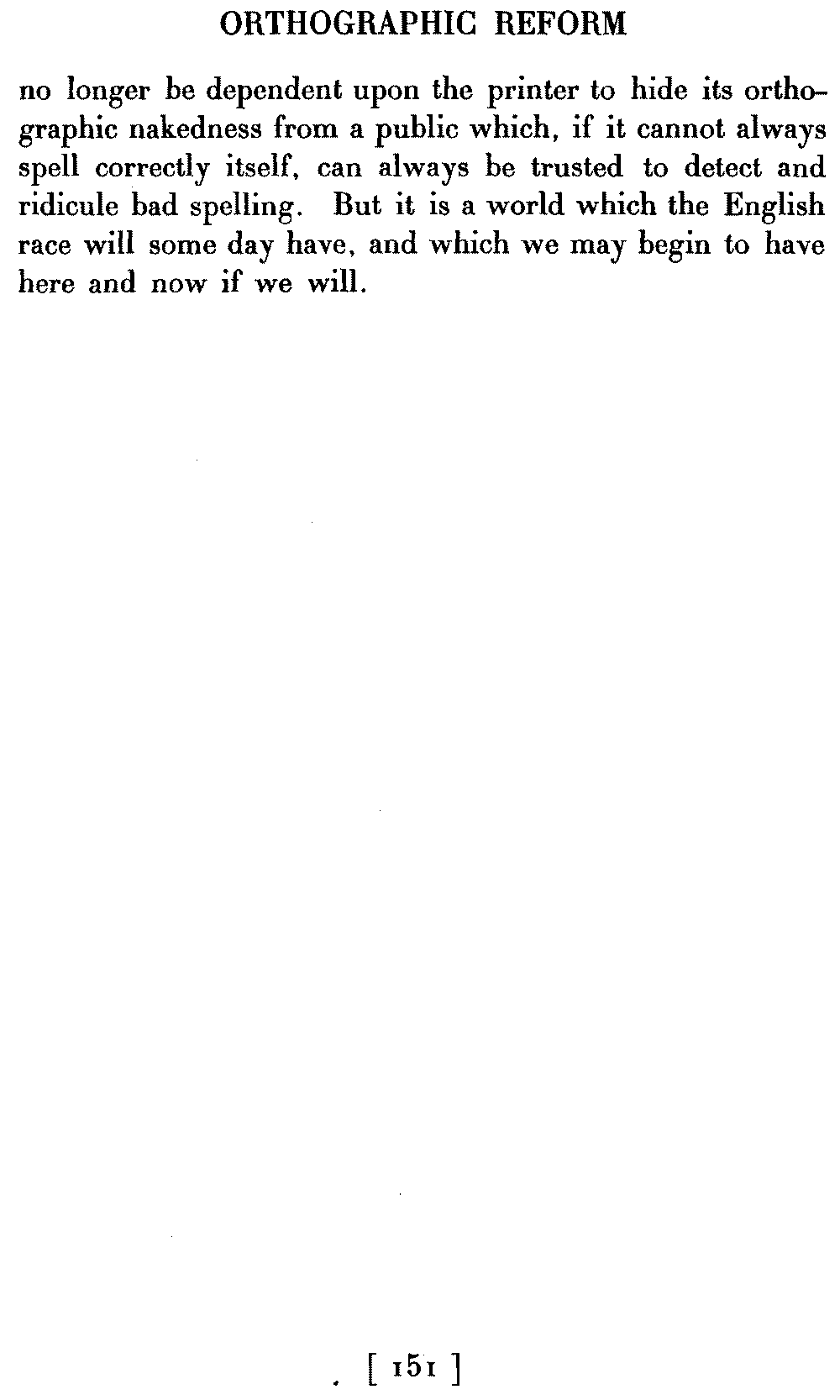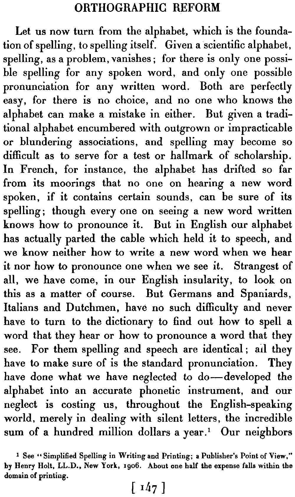 But to return to the advantages of type to the reader. Handwriting can make distinctions, such as punctuation and paragraphing, but print can greatly enforce them. The meaning of no written page leaps out to the eye; but this is the regular experience of the reader with every well-printed page. While printing can do nothing on a single page that is beyond the power of a skillful penman, its ordinary resources are the extraordinary ones of manuscript. It might not be physically impossible, for instance, to duplicate with a pen a page of the Century Dictionary, but it would be practically impossible, and, if the pen were our only resource, we never should have such a marvel of condensation and distinctness as that triumph of typography in the service of scholarship.