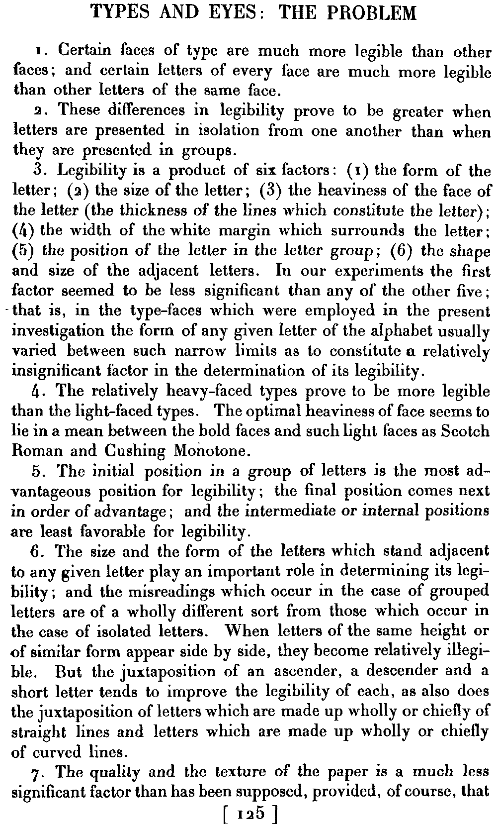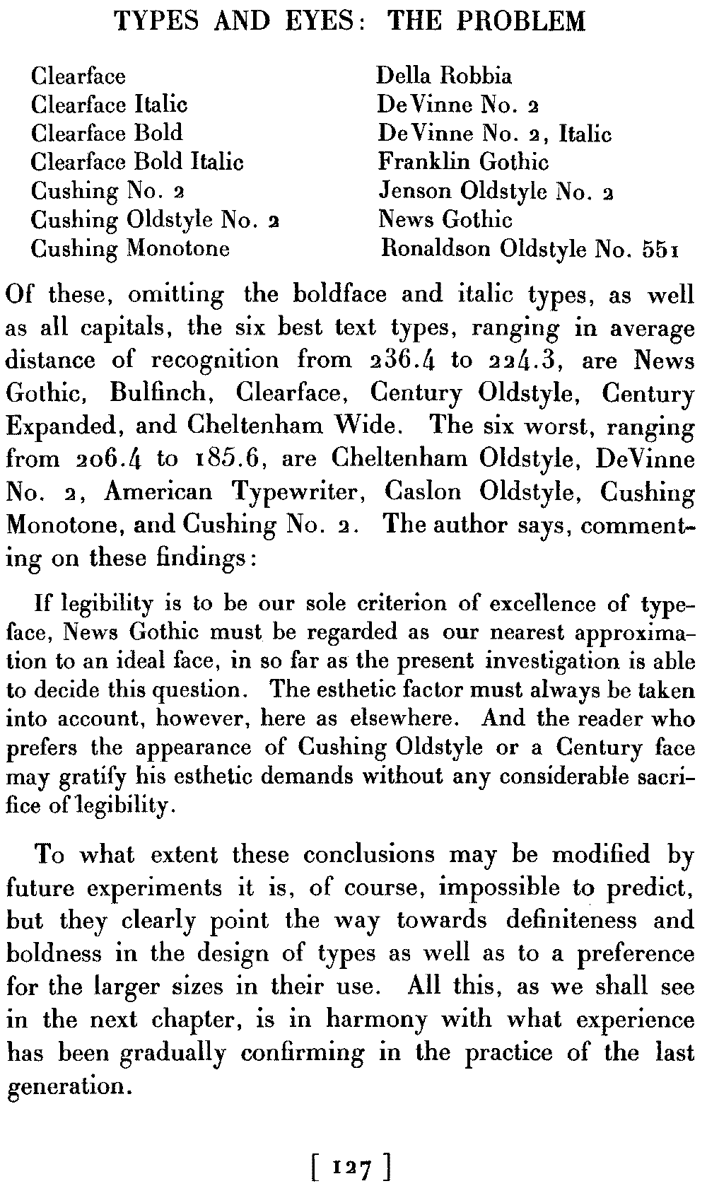 Type gives its name to the art and is the instrument by which the spoken word is made visible to the eye. The aims in its design should be legibility, beauty, and compactness, in this order; but these are more or less conflicting qualities, and it is doubtful if any one design can surpass in all. Modern type is cleaner-cut than the old, but it may be questioned whether this is a real gain. William Morris held that all types should avoid hair-lines, fussiness, and ugliness. Legibility should have the right of way for most printed matter, especially children's books and newspapers. If the latter desire compactness, they should condense their style, not their types.