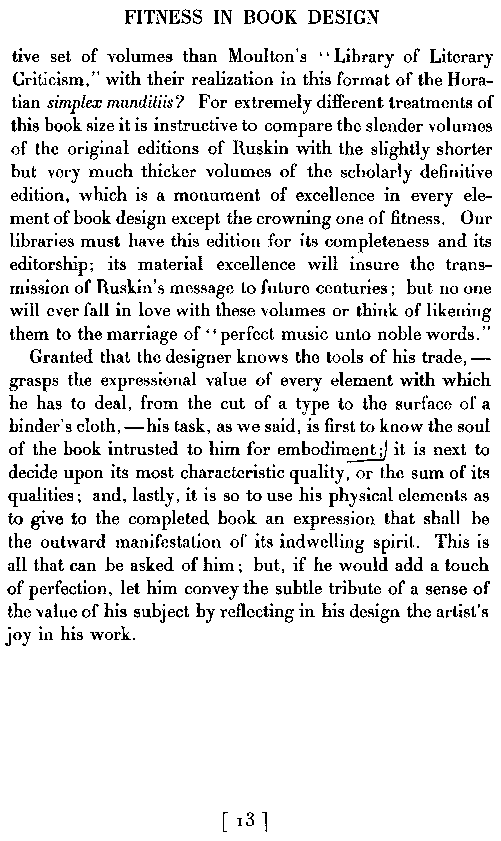 It is not enough that all the elements of a book be honest, sincere, enduring; otherwise the clumsy royal octavos of Leslie Stephen's edition of Fielding would be as attractive as "the dear and dumpy twelves" of the original editions. Royal octavo, indeed, seems to be the pitfall of the book designer, though there is no inherent objection to it. Where in the whole range of reference books will be found a more attractive[13] set of volumes than Moulton's "Library of Literary Criticism," with their realization in this format of the Horatian simplex munditiis? For extremely different treatments of this book size it is instructive to compare the slender volumes of the original editions of Ruskin with the slightly shorter but very much thicker volumes of the scholarly definitive edition, which is a monument of excellence in every element of book design except the crowning one of fitness. Our libraries must have this edition for its completeness and its editorship; its material excellence will insure the transmission of Ruskin's message to future centuries; but no one will ever fall in love with these volumes or think of likening them to the marriage of "perfect music unto noble words."