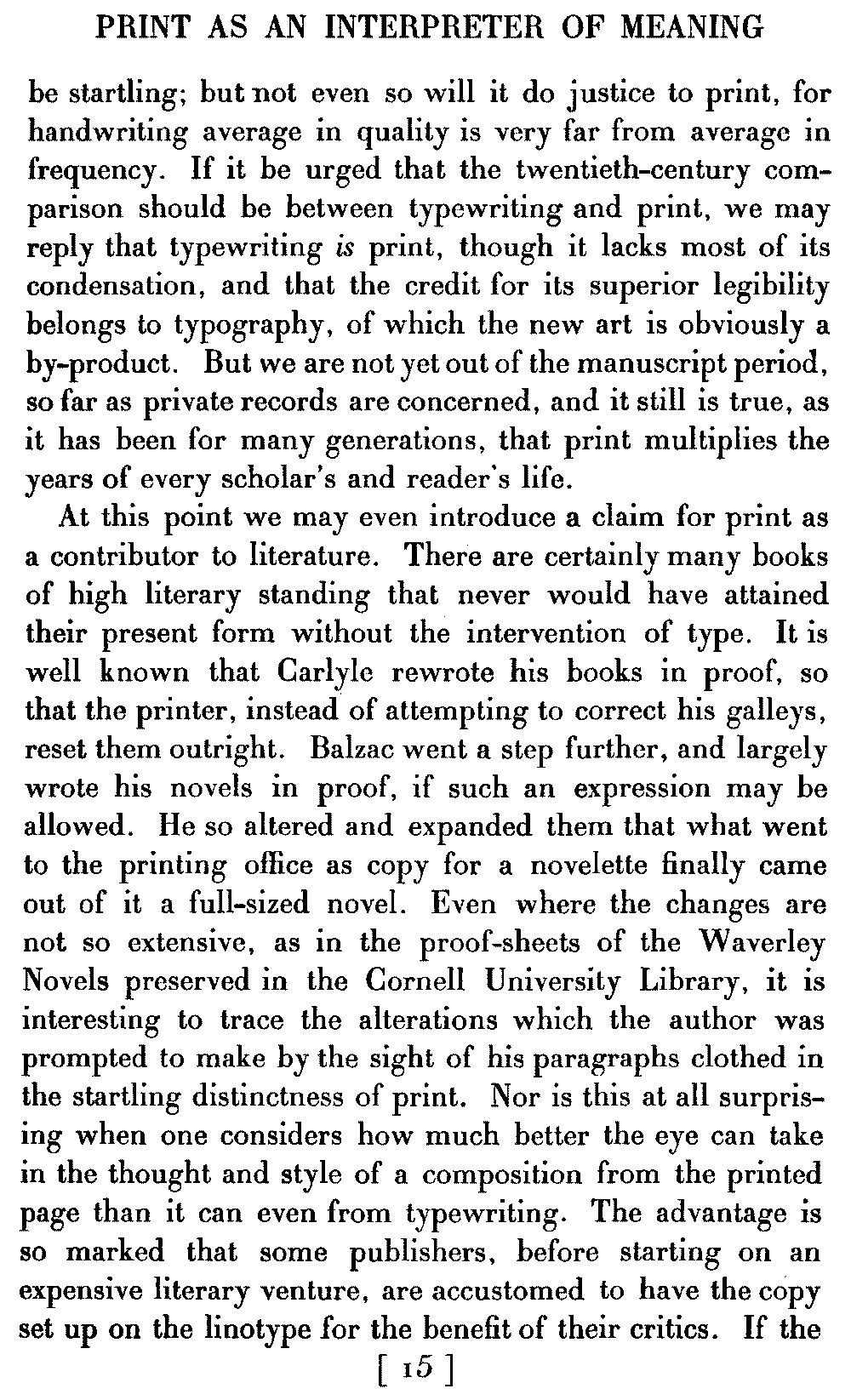 At this point we may even introduce a claim for print as a contributor to literature. There are certainly many books of high literary standing that never would have attained their present form without the intervention of type. It is well known that Carlyle rewrote his books in proof, so that the printer, instead of attempting to correct his galleys, reset them outright. Balzac went a step further, and largely wrote his novels in proof, if such an expression may be allowed. He so altered and expanded them that what went to the printing office as copy for a novelette finally came out of it a full-sized novel. Even where the changes are not so extensive, as in the proof-sheets of the Waverley Novels preserved in the Cornell University Library, it is interesting to trace the alterations which the author was prompted to make by the sight of his paragraphs clothed in the startling distinctness of print. Nor is this at all surprising when one considers how much better the eye can take in the thought and style of a composition from the printed page than it can even from typewriting. The advantage is so marked that some publishers, before starting on an expensive literary venture, are accustomed to have the copy set up on the linotype for the benefit of their critics. If the[16] work is accepted, the revisions are made on these sheets, and then, finally, the work is sent back to the composing room to receive the more elaborate typographic dress in which it is to appear.