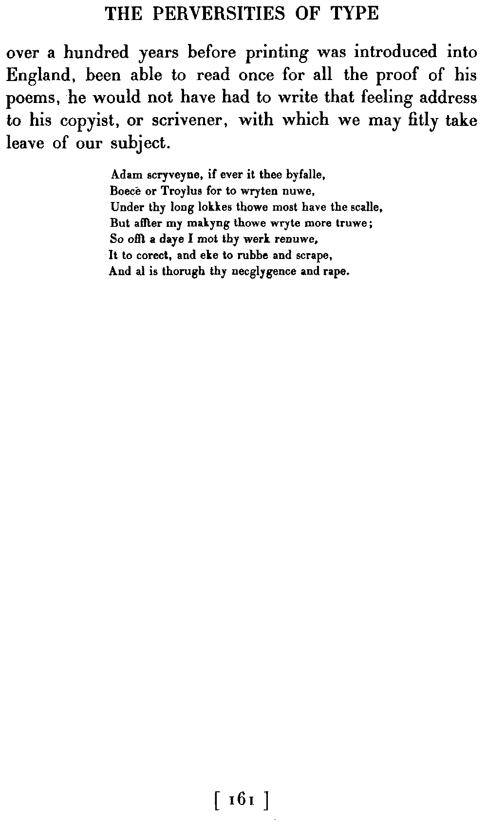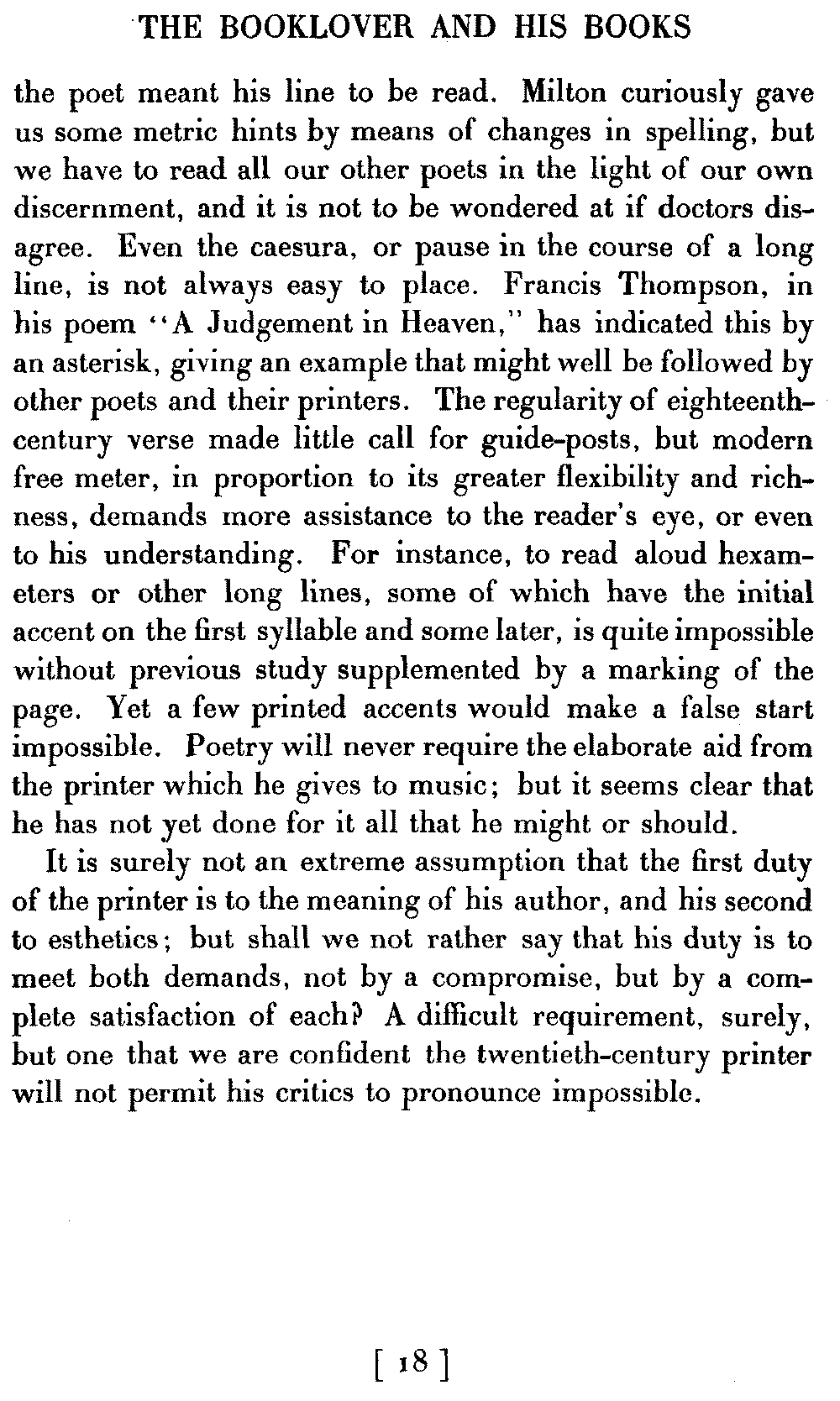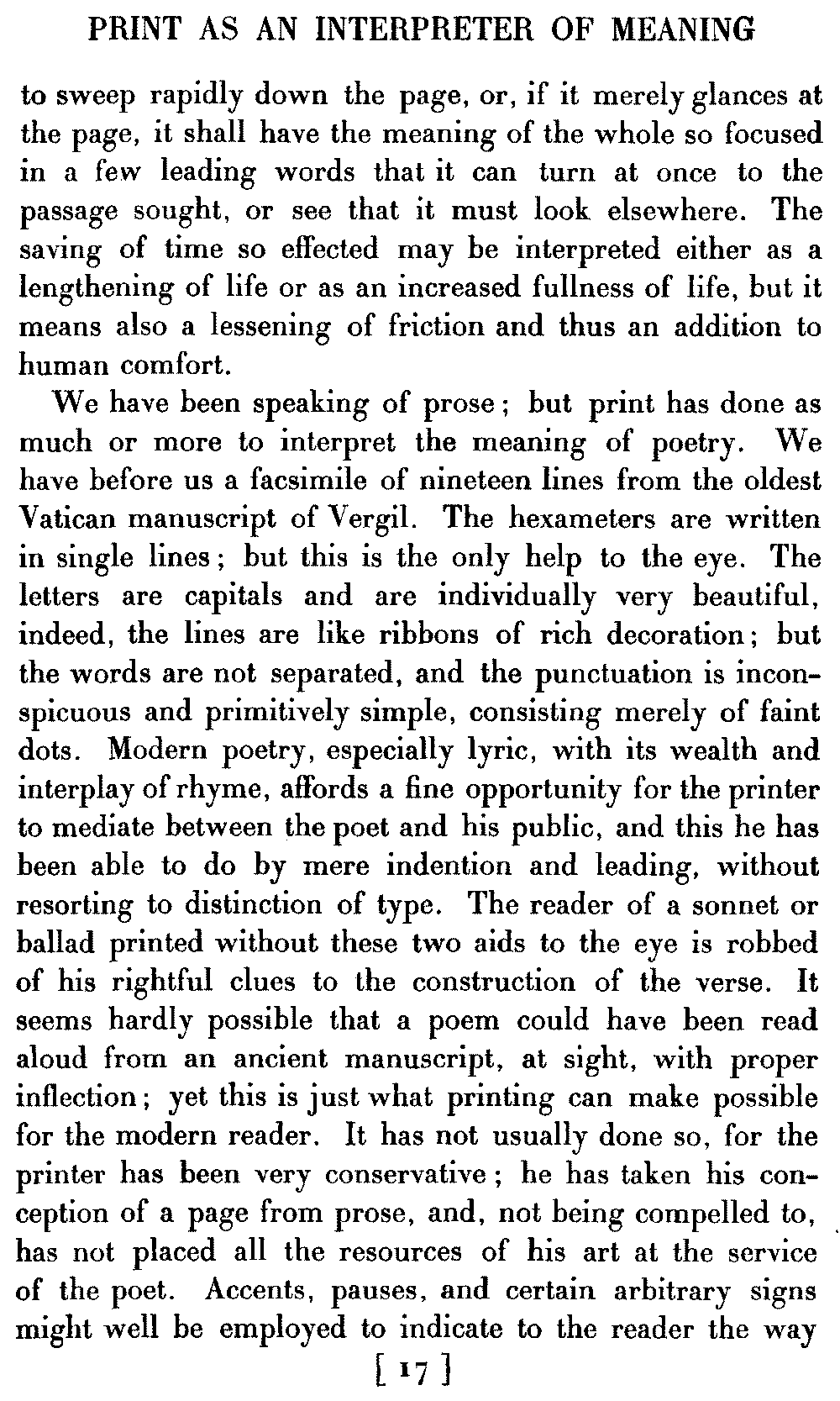 We have been speaking of prose; but print has done as much or more to interpret the meaning of poetry. We have before us a facsimile of nineteen lines from the oldest Vatican manuscript of Vergil. The hexameters are written in single lines; but this is the only help to the eye. The letters are capitals and are individually very beautiful, indeed, the lines are like ribbons of rich decoration; but the words are not separated, and the punctuation is inconspicuous and primitively simple, consisting merely of faint dots. Modern poetry, especially lyric, with its wealth and interplay of rhyme, affords a fine opportunity for the printer to mediate between the poet and his public, and this he has been able to do by mere indention and leading, without resorting to distinction of type. The reader of a sonnet or ballad printed without these two aids to the eye is robbed of his rightful clues to the construction of the verse. It seems hardly possible that a poem could have been read aloud from an ancient manuscript, at sight, with proper inflection; yet this is just what printing can make possible for the modern reader. It has not usually done so, for the printer has been very conservative; he has taken his conception of a page from prose, and, not being compelled to, has not placed all the resources of his art at the service of the poet. Accents, pauses, and certain arbitrary signs might well be employed to indicate to the reader the way[18] the poet meant his line to be read. Milton curiously gave us some metric hints by means of changes in spelling, but we have to read all our other poets in the light of our own discernment, and it is not to be wondered at if doctors disagree. Even the caesura, or pause in the course of a long line, is not always easy to place. Francis Thompson, in his poem "A Judgement in Heaven," has indicated this by an asterisk, giving an example that might well be followed by other poets and their printers. The regularity of eighteenth-century verse made little call for guide-posts, but modern free meter, in proportion to its greater flexibility and richness, demands more assistance to the reader's eye, or even to his understanding. For instance, to read aloud hexameters or other long lines, some of which have the initial accent on the first syllable and some later, is quite impossible without previous study supplemented by a marking of the page. Yet a few printed accents would make a false start impossible. Poetry will never require the elaborate aid from the printer which he gives to music; but it seems clear that he has not yet done for it all that he might or should.