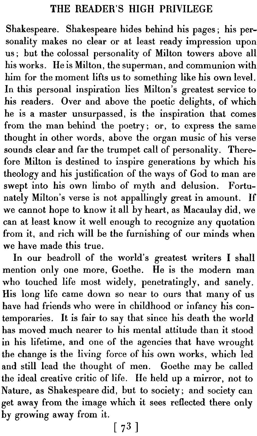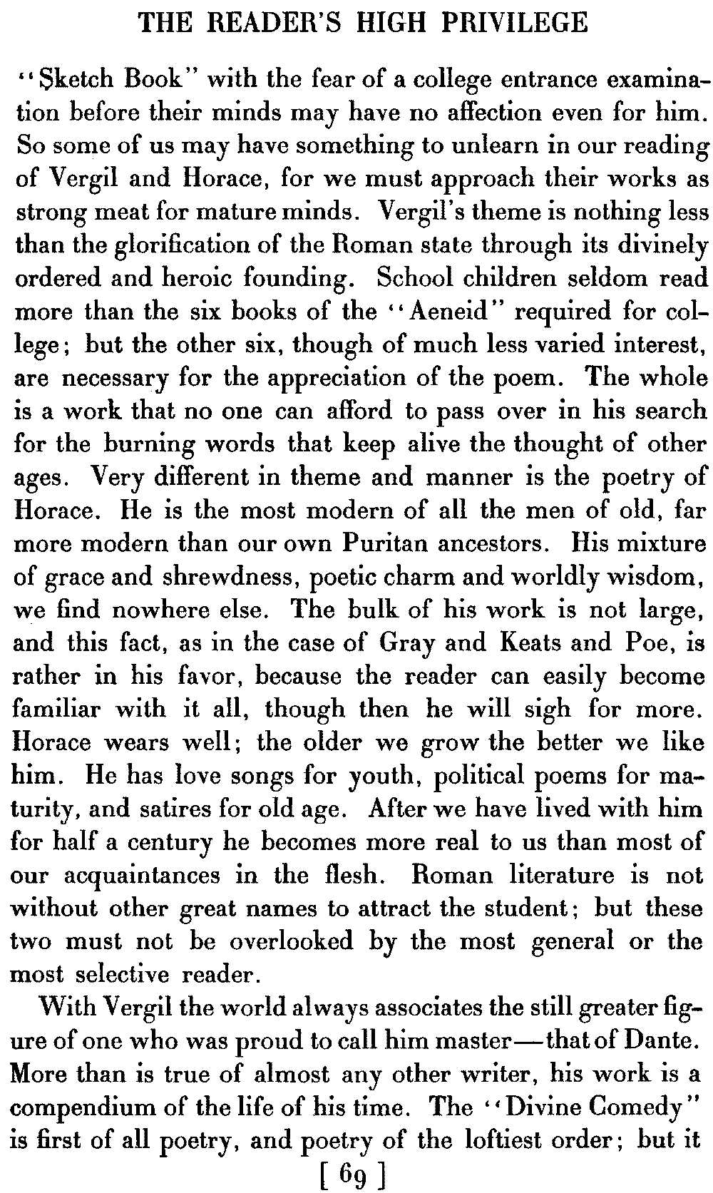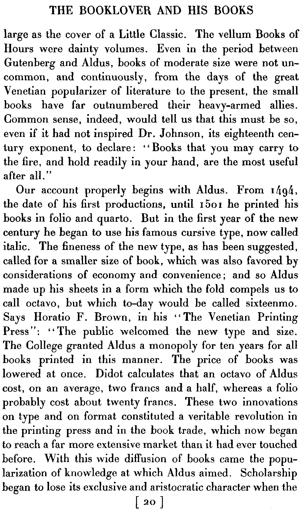 The parent of our present book form, the Roman codex, split from an actual block of wood, had a surface hardly as[20] large as the cover of a Little Classic. The vellum Books of Hours were dainty volumes. Even in the period between Gutenberg and Aldus, books of moderate size were not uncommon, and continuously, from the days of the great Venetian popularizer of literature to the present, the small books have far outnumbered their heavy-armed allies. Common sense, indeed, would tell us that this must be so, even if it had not inspired Dr. Johnson, its eighteenth century exponent, to declare: "Books that you may carry to the fire, and hold readily in your hand, are the most useful after all."
