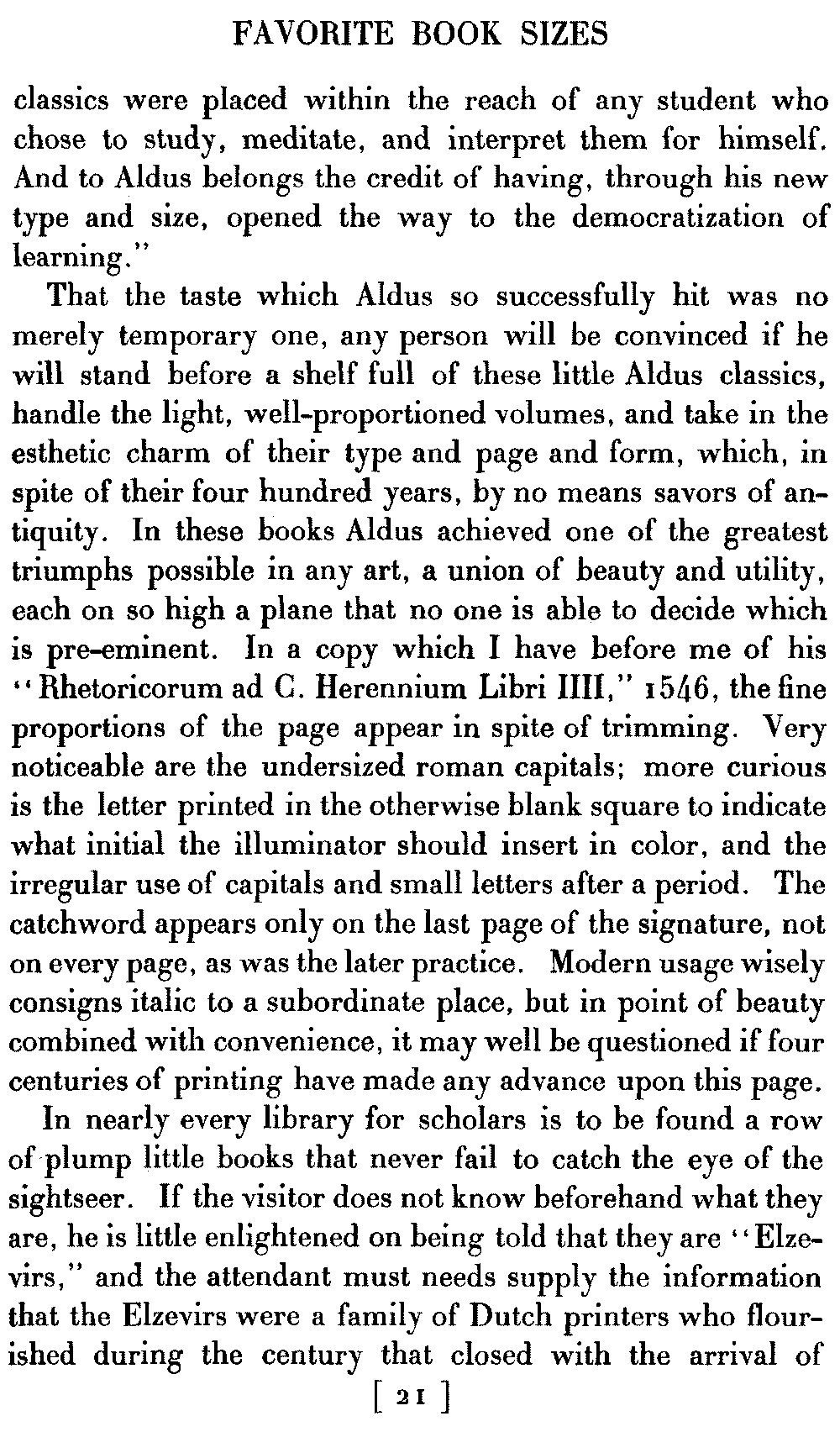 That the taste which Aldus so successfully hit was no merely temporary one, any person will be convinced if he will stand before a shelf full of these little Aldus classics, handle the light, well-proportioned volumes, and take in the esthetic charm of their type and page and form, which, in spite of their four hundred years, by no means savors of antiquity. In these books Aldus achieved one of the greatest triumphs possible in any art, a union of beauty and utility, each on so high a plane that no one is able to decide which is pre-eminent. In a copy which I have before me of his "Rhetoricorum ad C. Herennium Libri IIII," 1546, the fine proportions of the page appear in spite of trimming. Very noticeable are the undersized roman capitals; more curious is the letter printed in the otherwise blank square to indicate what initial the illuminator should insert in color, and the irregular use of capitals and small letters after a period. The catchword appears only on the last page of the signature, not on every page, as was the later practice. Modern usage wisely consigns italic to a subordinate place, but in point of beauty combined with convenience, it may well be questioned if four centuries of printing have made any advance upon this page.