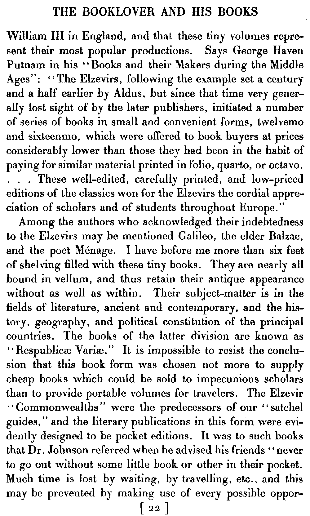 Among the authors who acknowledged their indebtedness to the Elzevirs may be mentioned Galileo, the elder Balzac, and the poet Ménage. I have before me more than six feet of shelving filled with these tiny books. They are nearly all bound in vellum, and thus retain their antique appearance without as well as within. Their subject-matter is in the fields of literature, ancient and contemporary, and the history, geography, and political constitution of the principal countries. The books of the latter division are known as "Respublicæ Variæ." It is impossible to resist the conclusion that this book form was chosen not more to supply cheap books which could be sold to impecunious scholars than to provide portable volumes for travelers. The Elzevir "Commonwealths" were the predecessors of our "satchel guides," and the literary publications in this form were evidently designed to be pocket editions. It was to such books that Dr. Johnson referred when he advised his friends "never to go out without some little book or other in their pocket. Much time is lost by waiting, by travelling, etc., and this may be prevented by making use of every possible opportunity[23] for improvement." When the positive doctor, on his journey to the Hebrides, paid his tribute to George Buchanan at St. Andrews, his acquaintance with the Latin poetry of the Scotch professor may well have arisen from his having thus made a pocket piece of one of the several Elzevir editions of the poet.