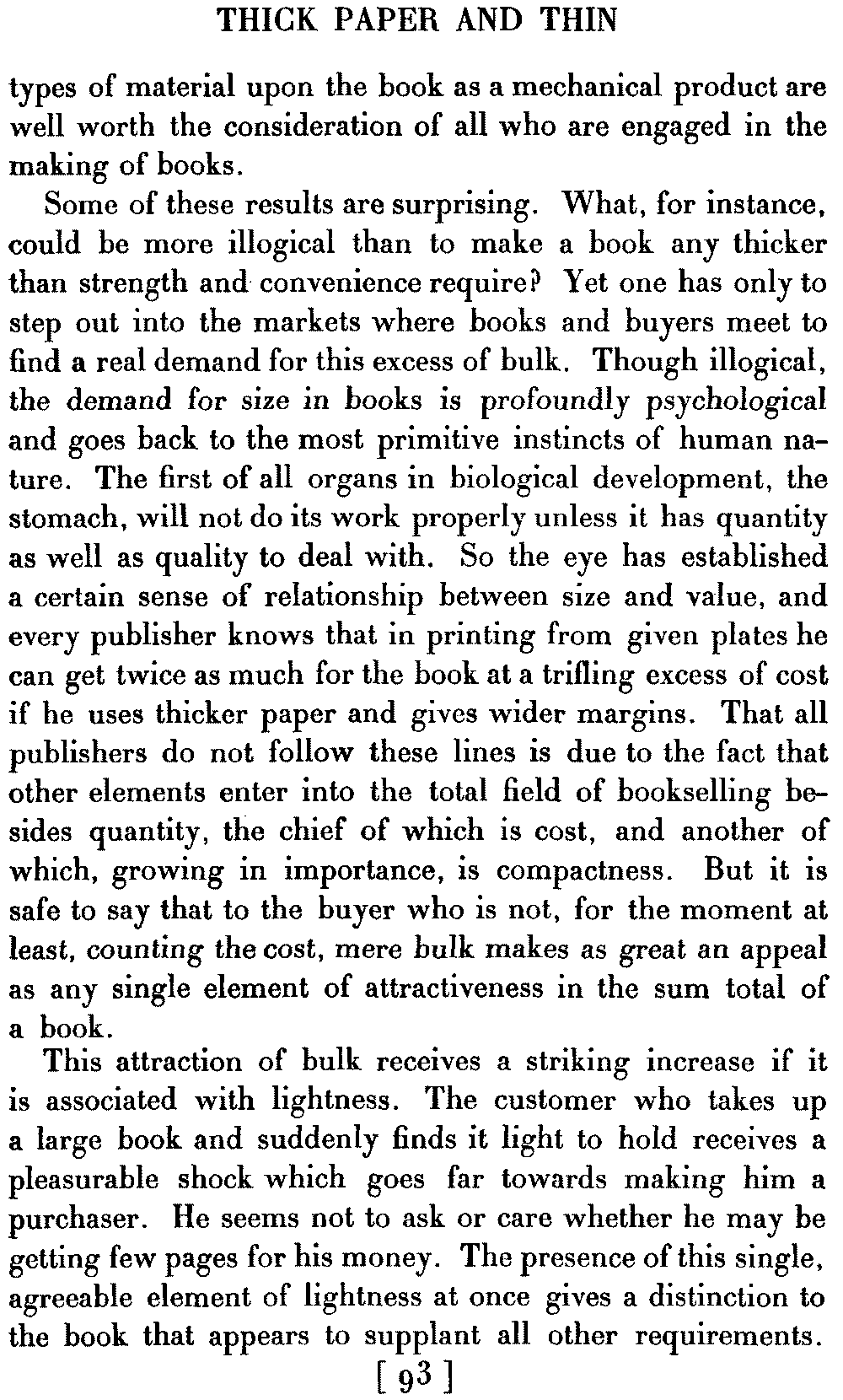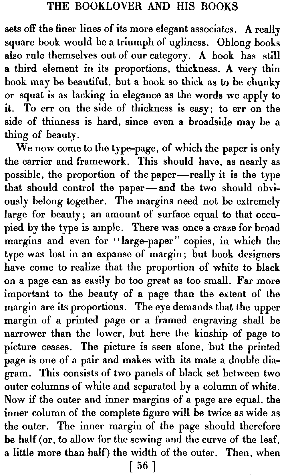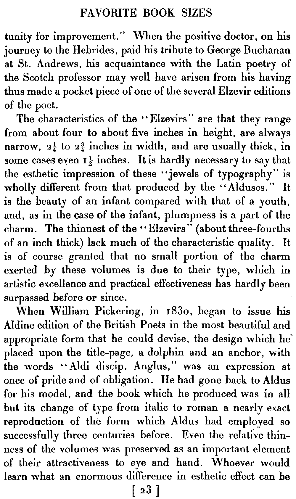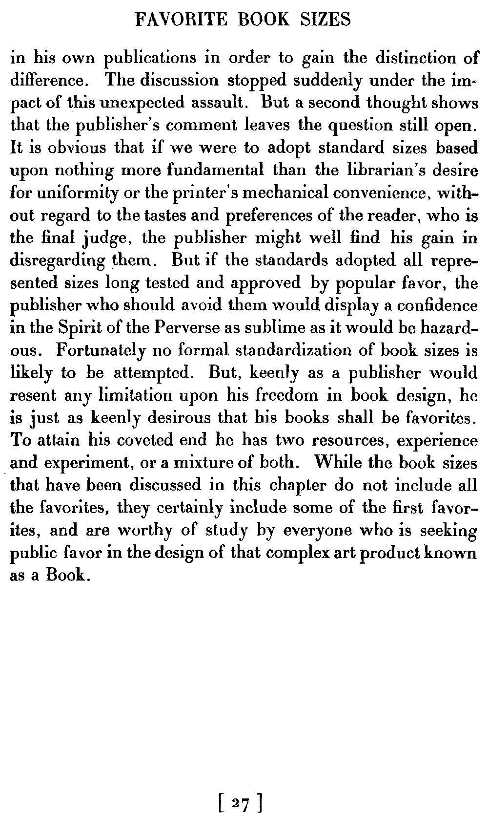 The adoption of a few standard sizes for all books was urged some years ago at a meeting of American librarians. Commenting on this proposal, a New York publisher remarked that he should be glad to have such standard sizes adopted by others, but he should take pains to avoid them[27] in his own publications in order to gain the distinction of difference. The discussion stopped suddenly under the impact of this unexpected assault. But a second thought shows that the publisher's comment leaves the question still open. It is obvious that if we were to adopt standard sizes based upon nothing more fundamental than the librarian's desire for uniformity or the printer's mechanical convenience, without regard to the tastes and preferences of the reader, who is the final judge, the publisher might well find his gain in disregarding them. But if the standards adopted all represented sizes long tested and approved by popular favor, the publisher who should avoid them would display a confidence in the Spirit of the Perverse as sublime as it would be hazardous. Fortunately no formal standardization of book sizes is likely to be attempted. But, keenly as a publisher would resent any limitation upon his freedom in book design, he is just as keenly desirous that his books shall be favorites. To attain his coveted end he has two resources, experience and experiment, or a mixture of both. While the book sizes that have been discussed in this chapter do not include all the favorites, they certainly include some of the first favorites, and are worthy of study by everyone who is seeking public favor in the design of that complex art product known as a Book.