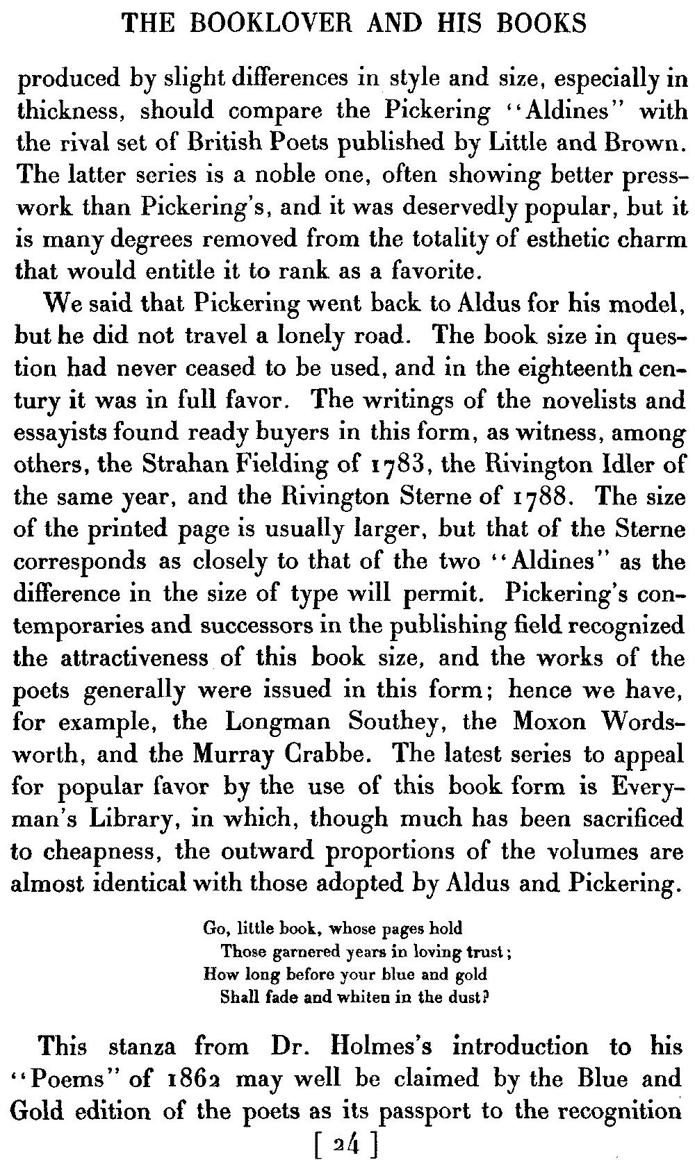 We said that Pickering went back to Aldus for his model, but he did not travel a lonely road. The book size in question had never ceased to be used, and in the eighteenth century it was in full favor. The writings of the novelists and essayists found ready buyers in this form, as witness, among others, the Strahan Fielding of 1783, the Rivington Idler of the same year, and the Rivington Sterne of 1788. The size of the printed page is usually larger, but that of the Sterne corresponds as closely to that of the two "Aldines" as the difference in the size of type will permit. Pickering's contemporaries and successors in the publishing field recognized the attractiveness of this book size, and the works of the poets generally were issued in this form; hence we have, for example, the Longman Southey, the Moxon Wordsworth, and the Murray Crabbe. The latest series to appeal for popular favor by the use of this book form is Everyman's Library, in which, though much has been sacrificed to cheapness, the outward proportions of the volumes are almost identical with those adopted by Aldus and Pickering.
