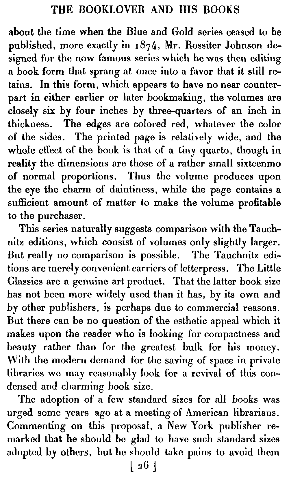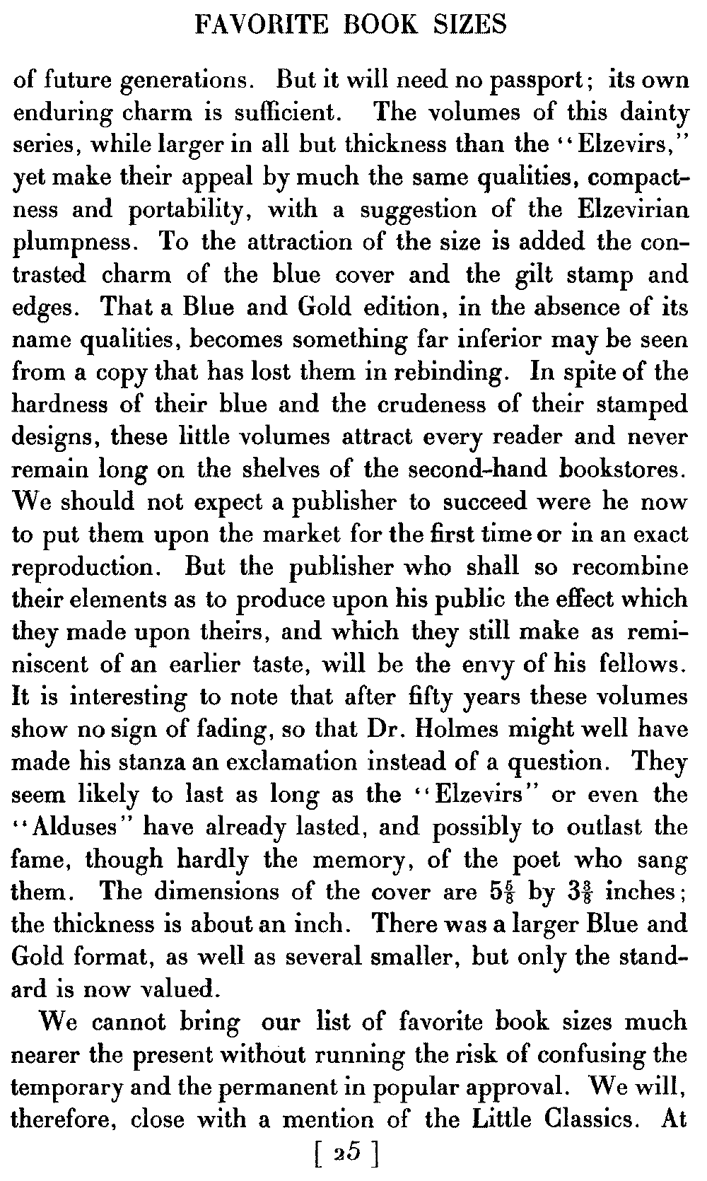 We cannot bring our list of favorite book sizes much nearer the present without running the risk of confusing the temporary and the permanent in popular approval. We will, therefore, close with a mention of the Little Classics. At[26] about the time when the Blue and Gold series ceased to be published, more exactly in 1874, Mr. Rossiter Johnson designed for the now famous series which he was then editing a book form that sprang at once into a favor that it still retains. In this form, which appears to have no near counterpart in either earlier or later bookmaking, the volumes are closely six by four inches by three-quarters of an inch in thickness. The edges are colored red, whatever the color of the sides. The printed page is relatively wide, and the whole effect of the book is that of a tiny quarto, though in reality the dimensions are those of a rather small sixteenmo of normal proportions. Thus the volume produces upon the eye the charm of daintiness, while the page contains a sufficient amount of matter to make the volume profitable to the purchaser.