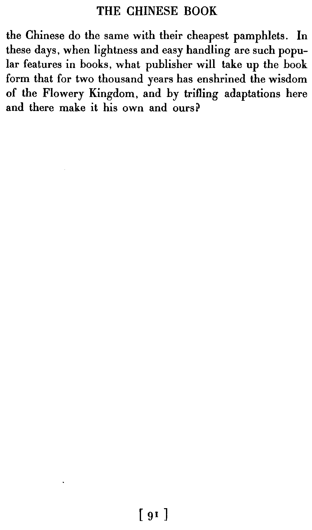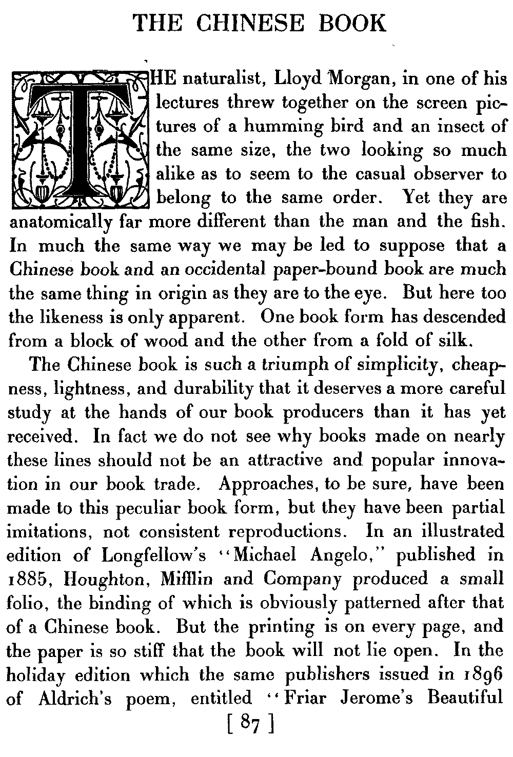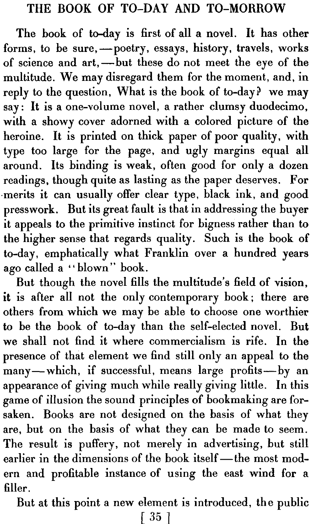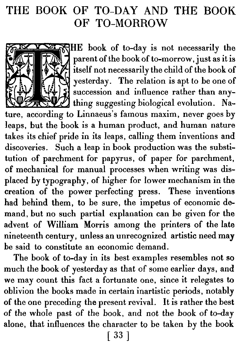 HE invention of printing, we have often been told, added to book production only the two commercial elements of speed and cheapness. As regards the book itself, we are assured, printing not only added nothing, but, during the four and a half centuries of its development, has constantly tended to take away. These statements are no doubt historically and theoretically true, yet they are so unjust to the present-day art that some supplementary statement of our obligations to printing seems called for, aside from the obvious rejoinder that, even if speed and cheapness are commercial qualities, they have reached a development—especially in the newspaper—beyond the dreams of the most imaginative fifteenth-century inventor, and have done nothing less than revolutionize the world.