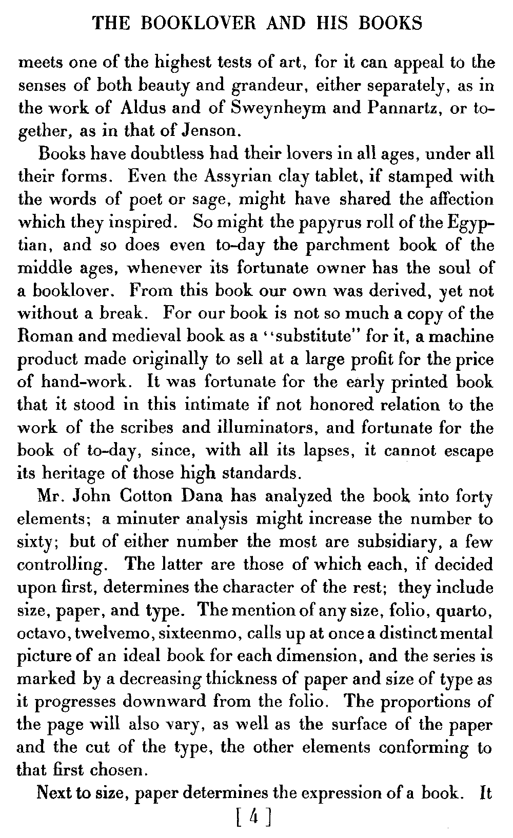 Mr. John Cotton Dana has analyzed the book into forty elements; a minuter analysis might increase the number to sixty; but of either number the most are subsidiary, a few controlling. The latter are those of which each, if decided upon first, determines the character of the rest; they include size, paper, and type. The mention of any size, folio, quarto, octavo, twelvemo, sixteenmo, calls up at once a distinct mental picture of an ideal book for each dimension, and the series is marked by a decreasing thickness of paper and size of type as it progresses downward from the folio. The proportions of the page will also vary, as well as the surface of the paper and the cut of the type, the other elements conforming to that first chosen.