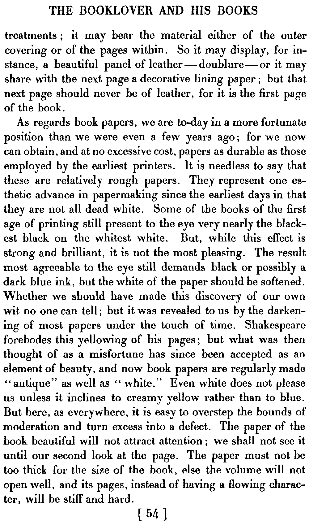 A further important element, which affects both the legibility and the durability of the book, is the ink. For most purposes it should be a rich black. Some of the print of the early masters is now brown, and there have been fashions of gray printing, but the booklover demands black ink, except in ornaments, and there color, if it is to win his favor, must be used sparingly and with great skill. We are told that the best combination for the eye is ink of a bluish tint on buff-tinted [6]paper; but, like much other good advice, this remains practically untried.