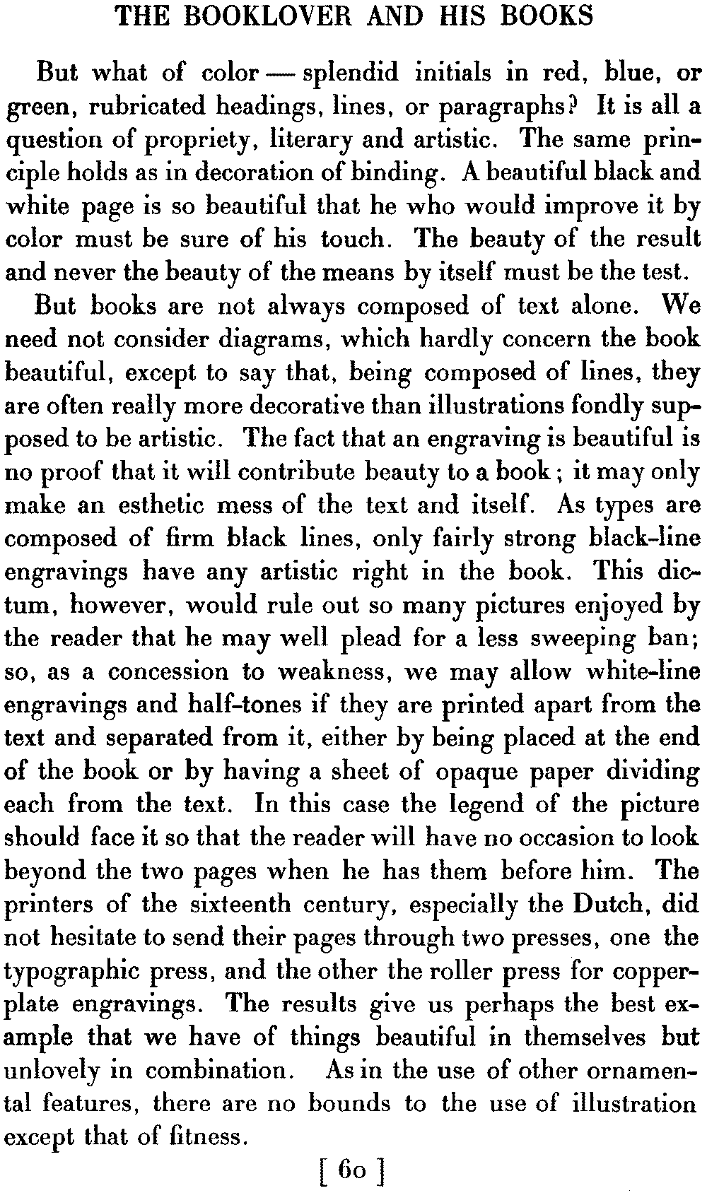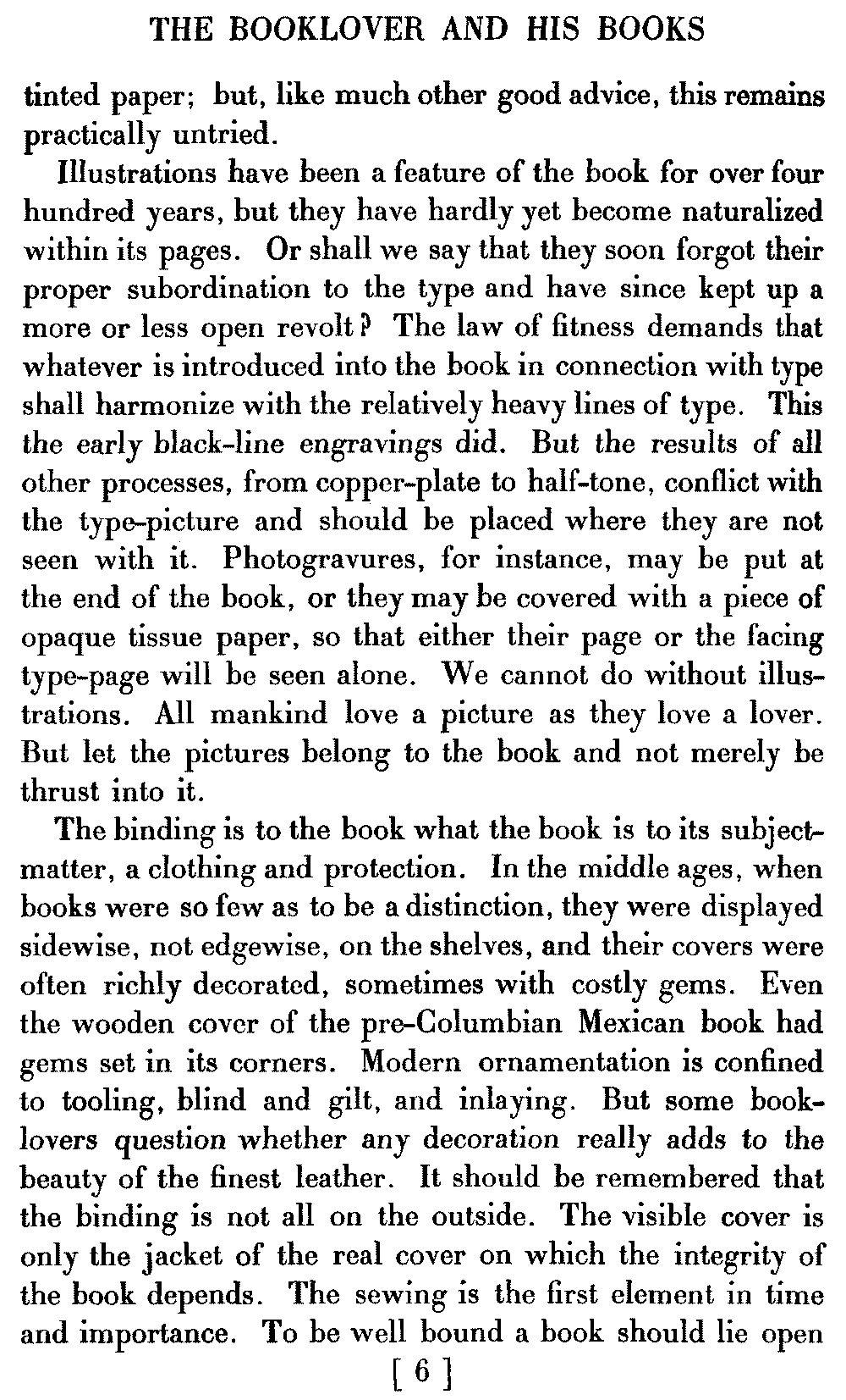 Illustrations have been a feature of the book for over four hundred years, but they have hardly yet become naturalized within its pages. Or shall we say that they soon forgot their proper subordination to the type and have since kept up a more or less open revolt? The law of fitness demands that whatever is introduced into the book in connection with type shall harmonize with the relatively heavy lines of type. This the early black-line engravings did. But the results of all other processes, from copper-plate to half-tone, conflict with the type-picture and should be placed where they are not seen with it. Photogravures, for instance, may be put at the end of the book, or they may be covered with a piece of opaque tissue paper, so that either their page or the facing type-page will be seen alone. We cannot do without illustrations. All mankind love a picture as they love a lover. But let the pictures belong to the book and not merely be thrust into it.
