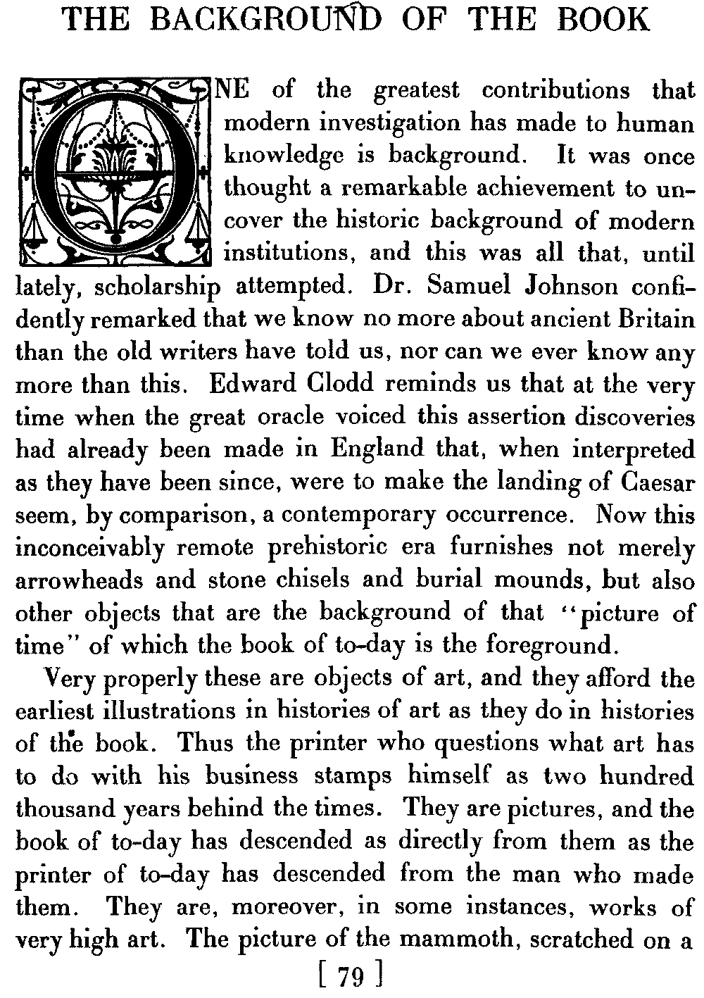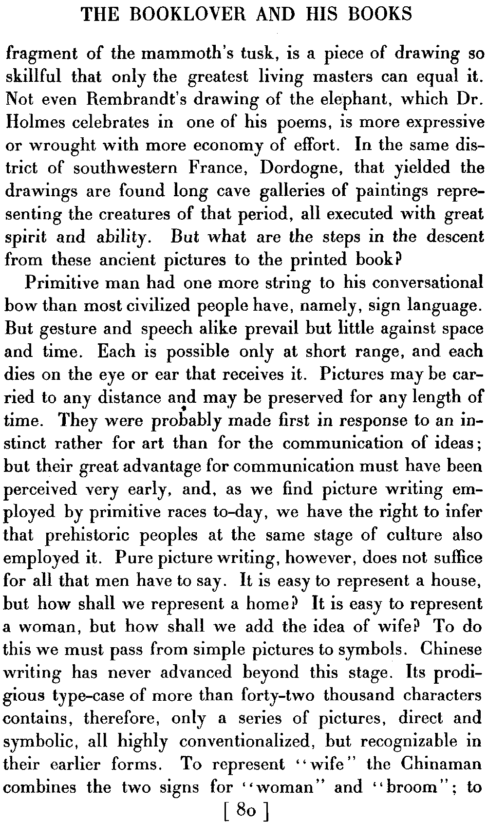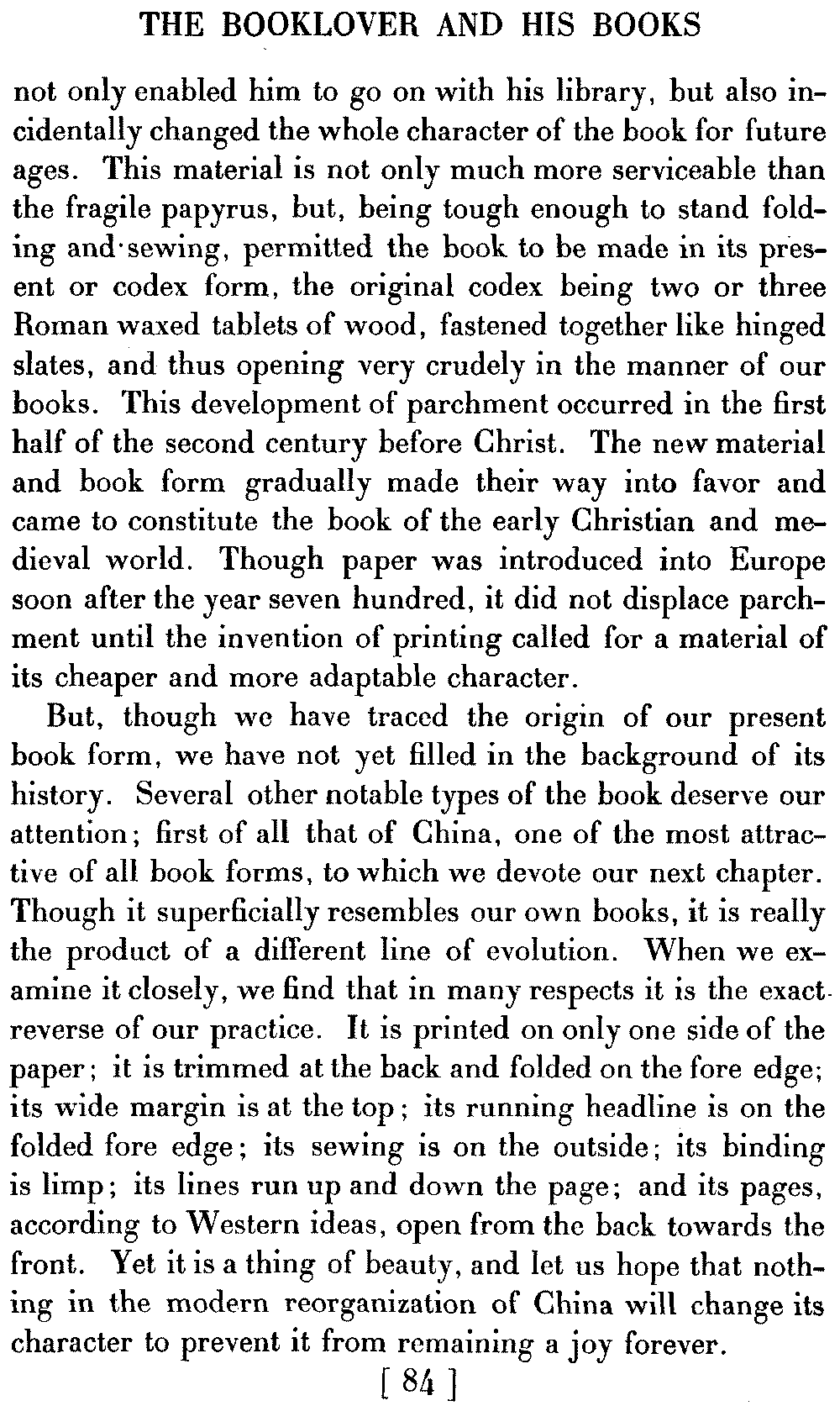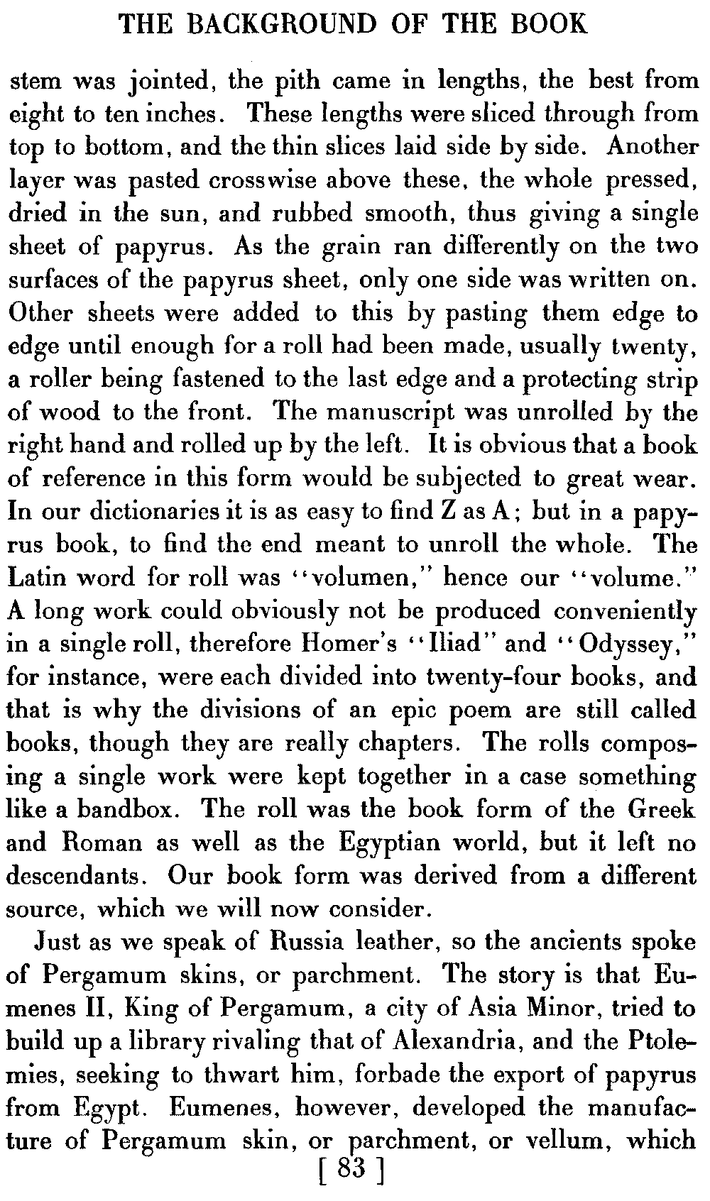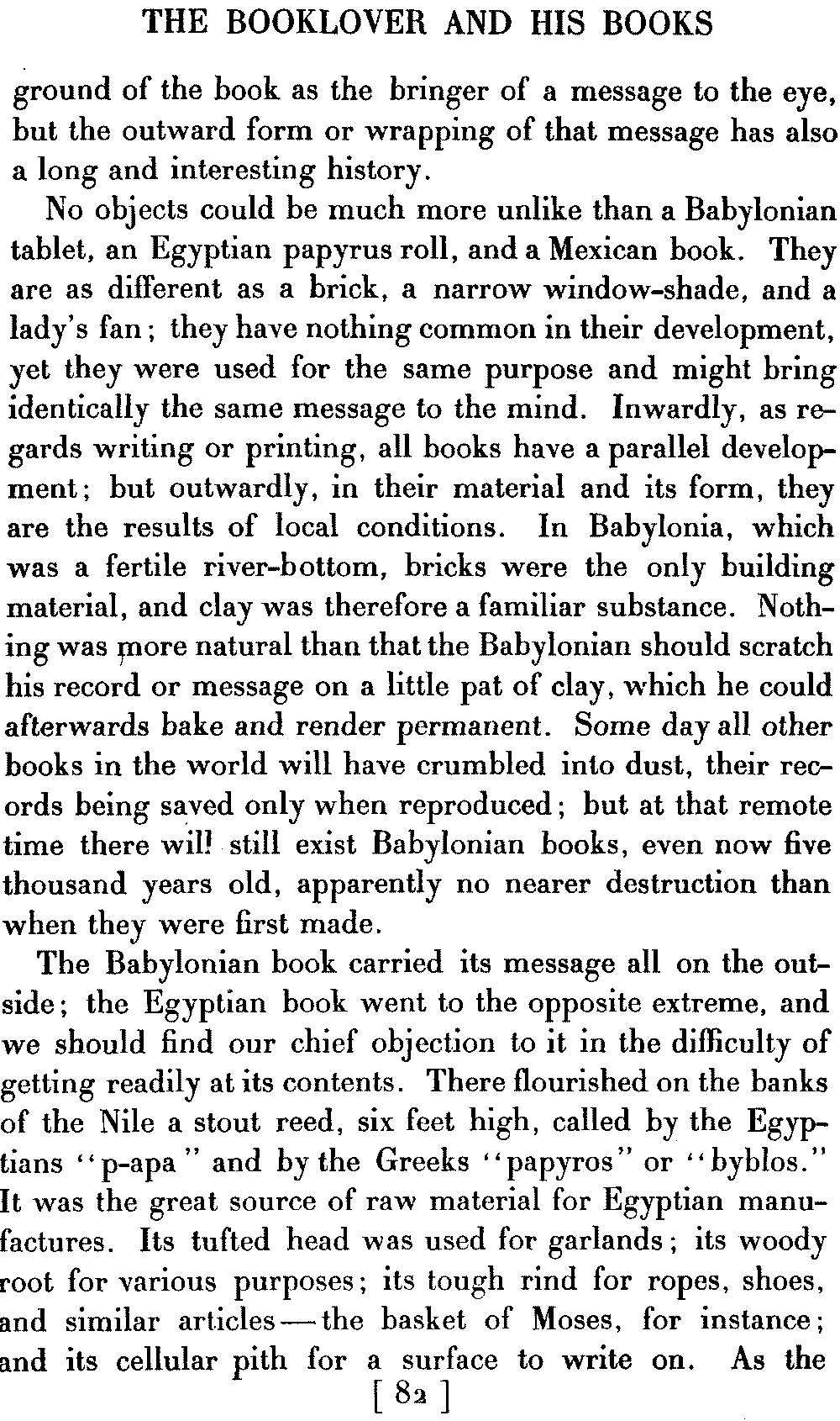 Books have doubtless had their lovers in all ages, under all their forms. Even the Assyrian clay tablet, if stamped with the words of poet or sage, might have shared the affection which they inspired. So might the papyrus roll of the Egyptian, and so does even to-day the parchment book of the middle ages, whenever its fortunate owner has the soul of a booklover. From this book our own was derived, yet not without a break. For our book is not so much a copy of the Roman and medieval book as a "substitute" for it, a machine product made originally to sell at a large profit for the price of hand-work. It was fortunate for the early printed book that it stood in this intimate if not honored relation to the work of the scribes and illuminators, and fortunate for the book of to-day, since, with all its lapses, it cannot escape its heritage of those high standards.