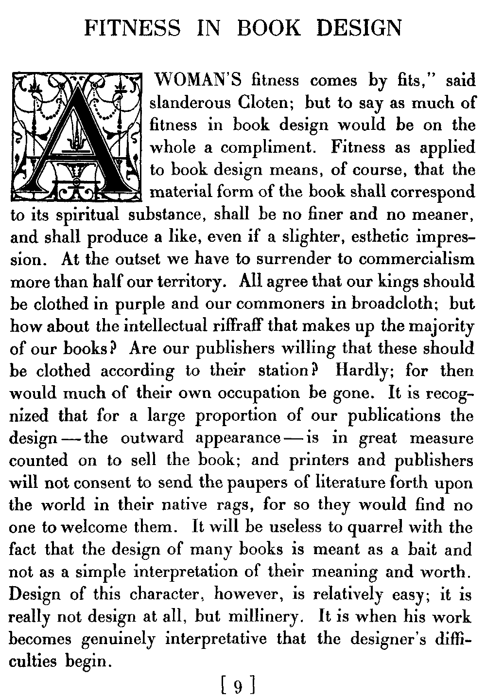 WOMAN'S fitness comes by fits," said slanderous Cloten; but to say as much of fitness in book design would be on the whole a compliment. Fitness as applied to book design means, of course, that the material form of the book shall correspond to its spiritual substance, shall be no finer and no meaner, and shall produce a like, even if a slighter, esthetic impression. At the outset we have to surrender to commercialism more than half our territory. All agree that our kings should be clothed in purple and our commoners in broadcloth; but how about the intellectual riffraff that makes up the majority of our books? Are our publishers willing that these should be clothed according to their station? Hardly; for then would much of their own occupation be gone. It is recognized that for a large proportion of our publications the design—the outward appearance—is in great measure counted on to sell the book; and printers and publishers will not consent to send the paupers of literature forth upon the world in their native rags, for so they would find no one to welcome them. It will be useless to quarrel with the fact that the design of many books is meant as a bait and not as a simple interpretation of their meaning and worth. Design of this character, however, is relatively easy; it is really not design at all, but millinery. It is when his work becomes genuinely interpretative that the designer's difficulties begin.[10]
