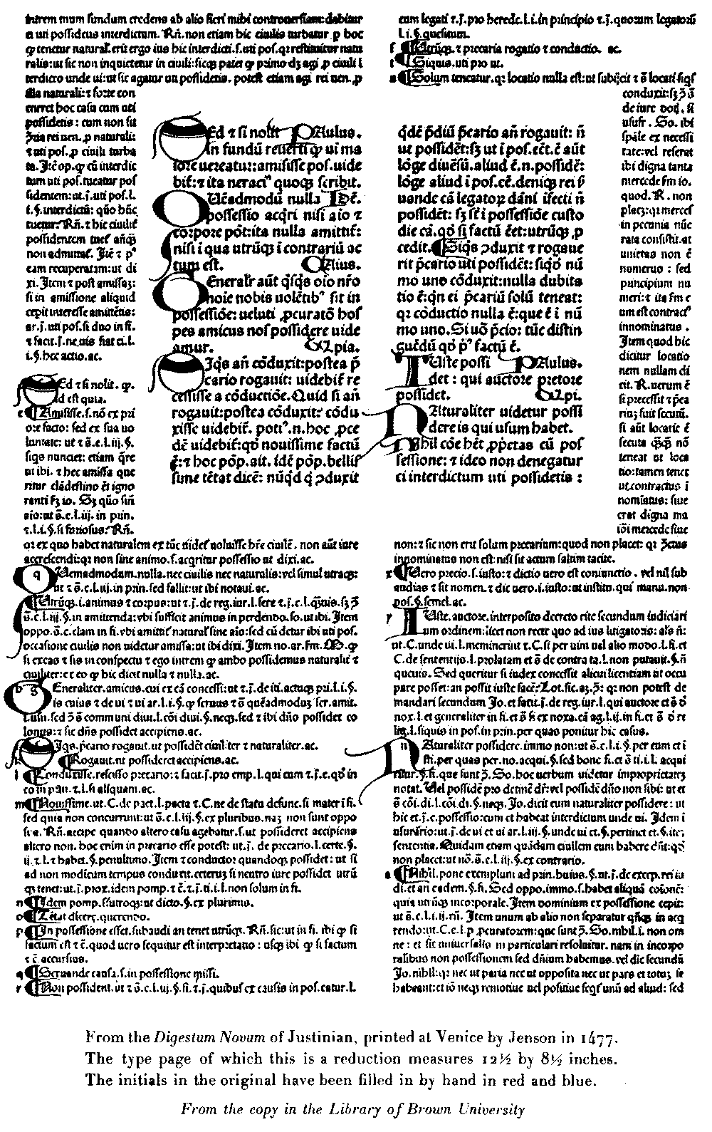 HE booklover is distinguished from the reader as such by loving his books, and from the collector as such by reading them. He prizes not only the soul of the book, but also its body, which he would make a house beautiful, meet for the indwelling of the spirit given by its author. Love is not too strong a word to apply to his regard, which demands, in the language of Dorothy Wordsworth, "a beautiful book, a book to caress—peculiar, distinctive, individual: a book that hath first caught your eye and then pleased your fancy." The truth is that the book on its physical side is a highly organized art object. Not in vain has it transmitted the thought and passion of the ages; it has taken toll of them, and in the hands of its worthiest makers these elements have worked themselves out into its material body. Enshrining the artist's thought, it has, therefore, the qualities of a true art product, and stands second only to those which express it, such as painting and sculpture; but no other art product of its own order, not the violin nor the jewel-casket, can compare with the book in esthetic quality. It[4] meets one of the highest tests of art, for it can appeal to the senses of both beauty and grandeur, either separately, as in the work of Aldus and of Sweynheym and Pannartz, or together, as in that of Jenson.