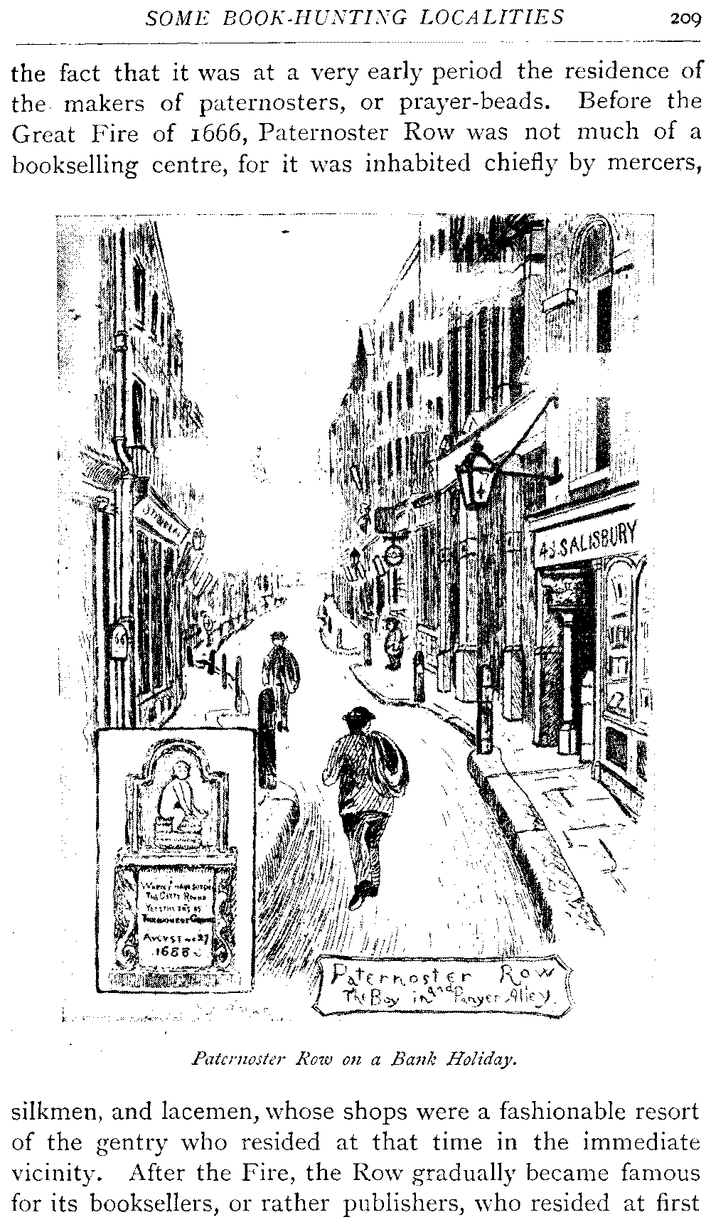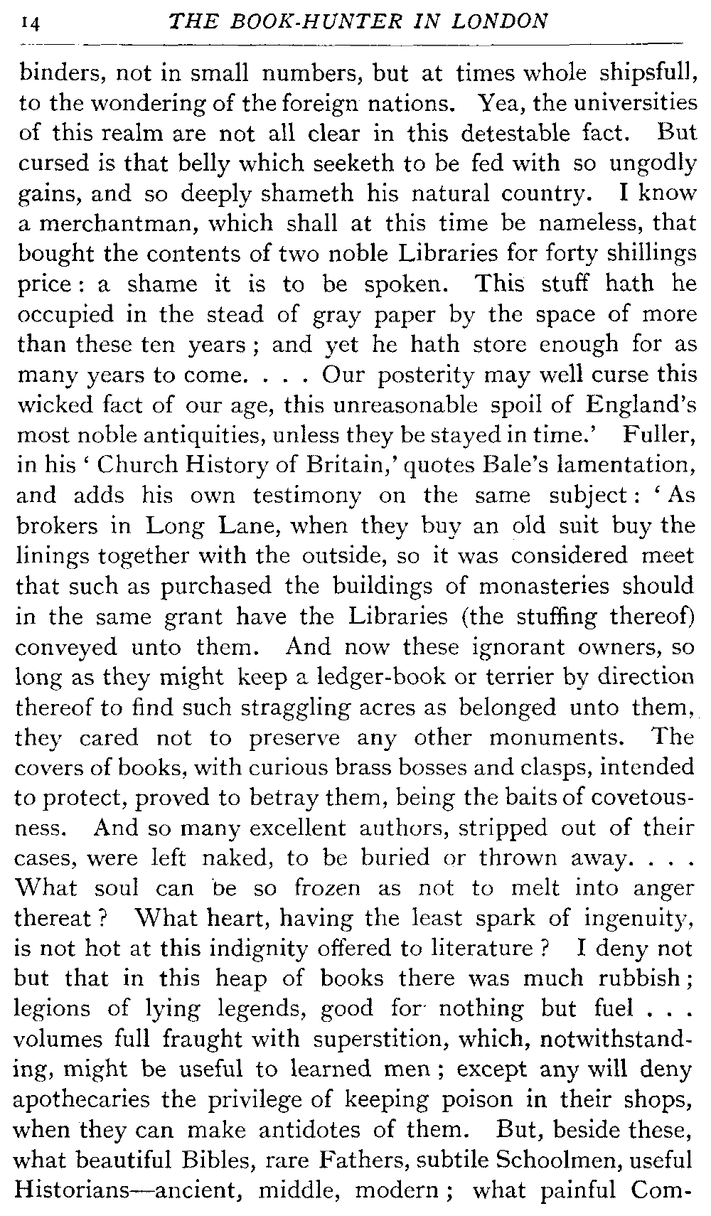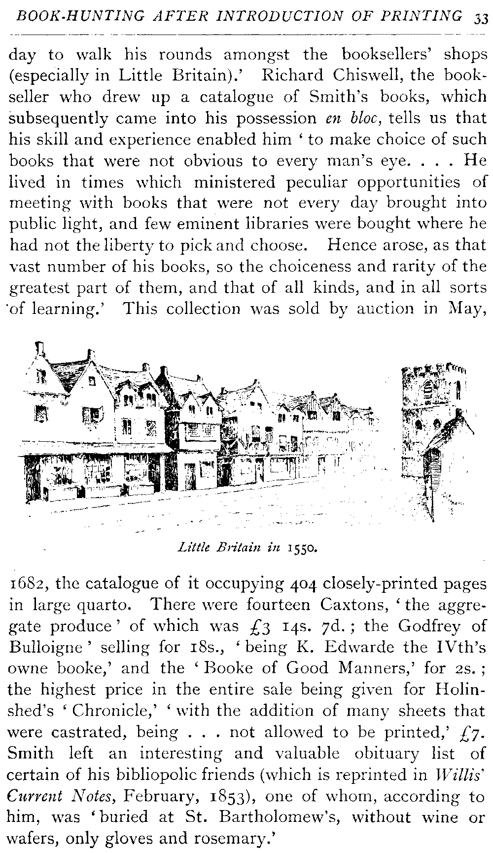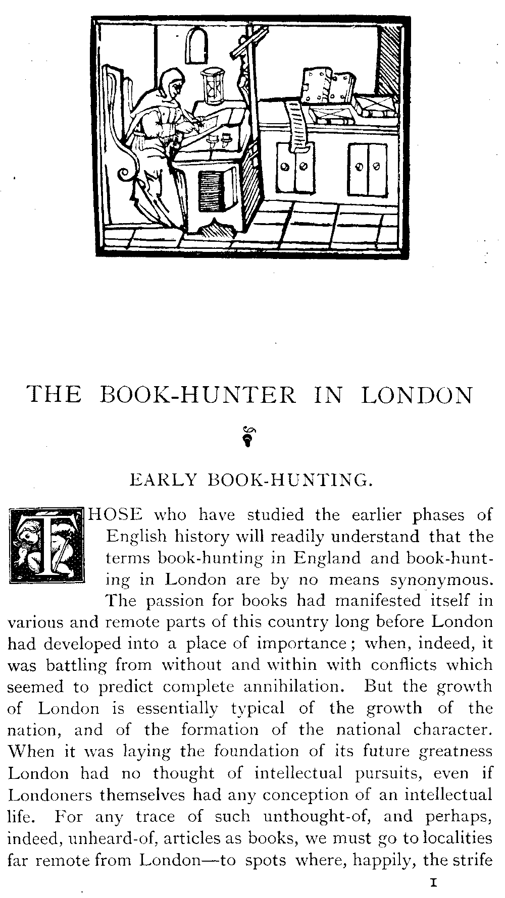 THOSE who have studied the earlier phases of English history will readily understand that the terms book-hunting in England and book-hunting in London are by no means synonymous. The passion for books had manifested itself in various and remote parts of this country long before London had developed into a place of importance; when, indeed, it was battling from without and within with conflicts which seemed to predict complete annihilation. But the growth of London is essentially typical of the growth of the nation, and of the formation of the national character. When it was laying the foundation of its future greatness London had no thought of intellectual pursuits, even if Londoners themselves had any conception of an intellectual life. For any trace of such unthought-of, and perhaps, indeed, unheard-of, articles as books, we must go to localities far remote from London—to spots where, happily, the strife [2]and din of savage warfare scarcely made themselves heard. The monasteries were the sole repositories of literature; to the monk alone had the written book any kind of intelligence, any species of pleasure. To him it was as essential as the implements of destruction to the warrior, or the plough to the husbandman. The one had no sympathy, no connection, with the other, only in so far that the events which transpired in the battlefield had to be recorded in the scriptorium. Although London was a place of importance at a very early stage of the Roman occupation, it was not in any sense an intellectual centre for centuries after that period.