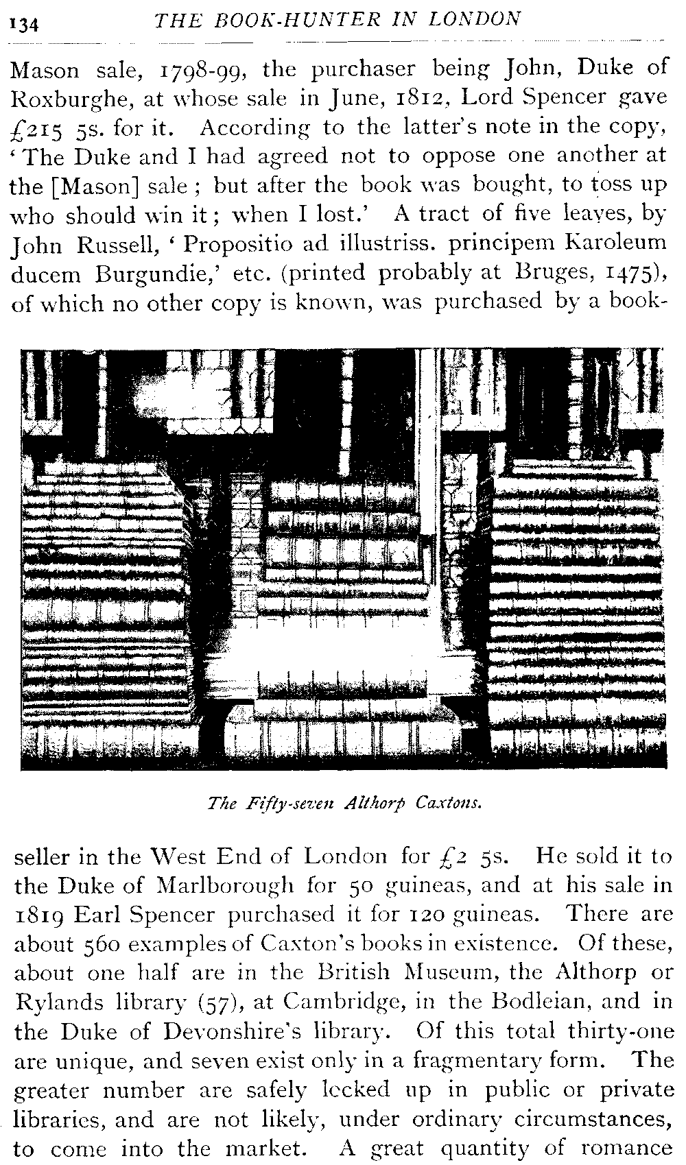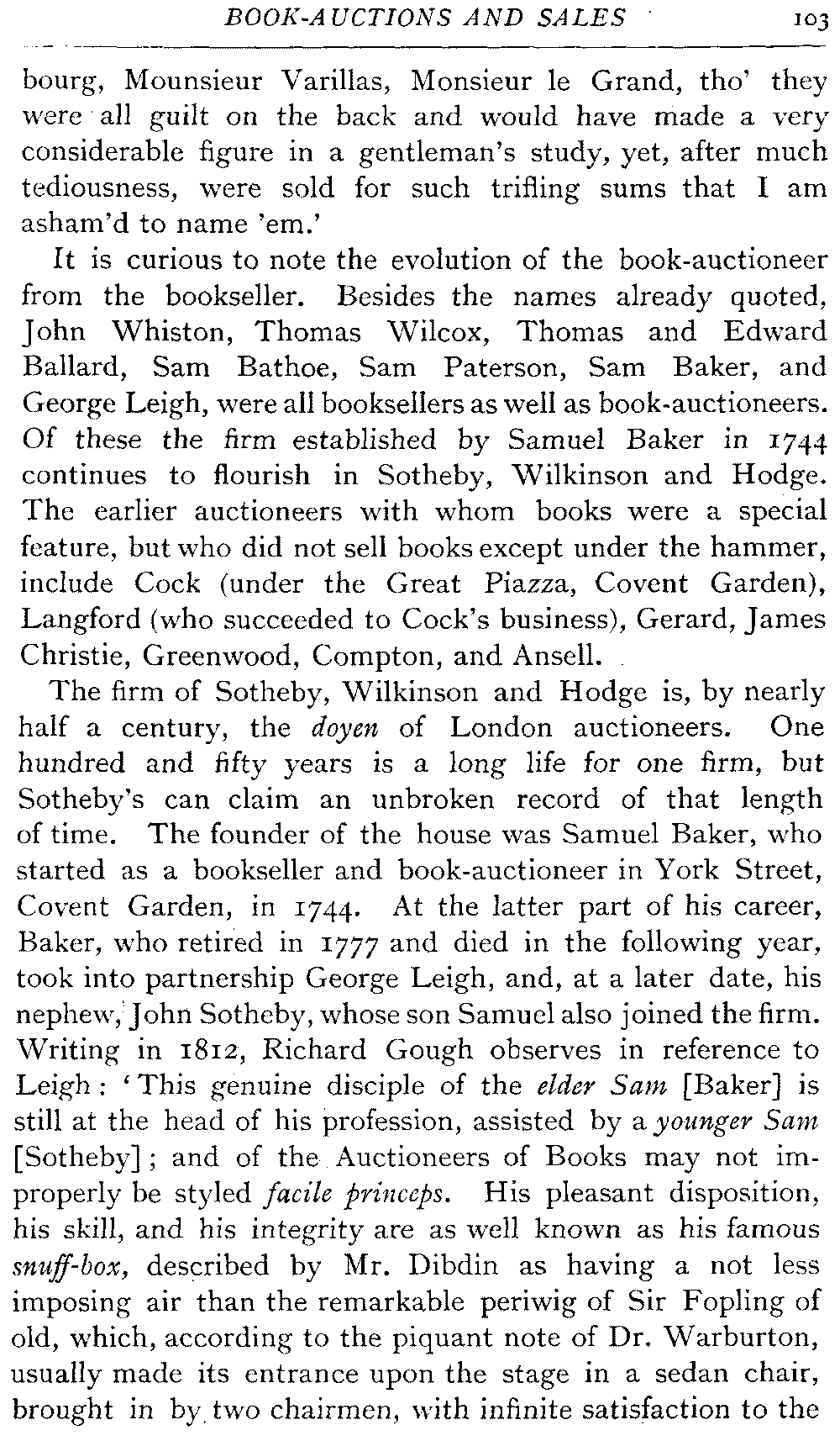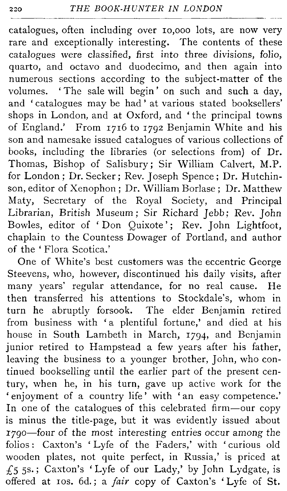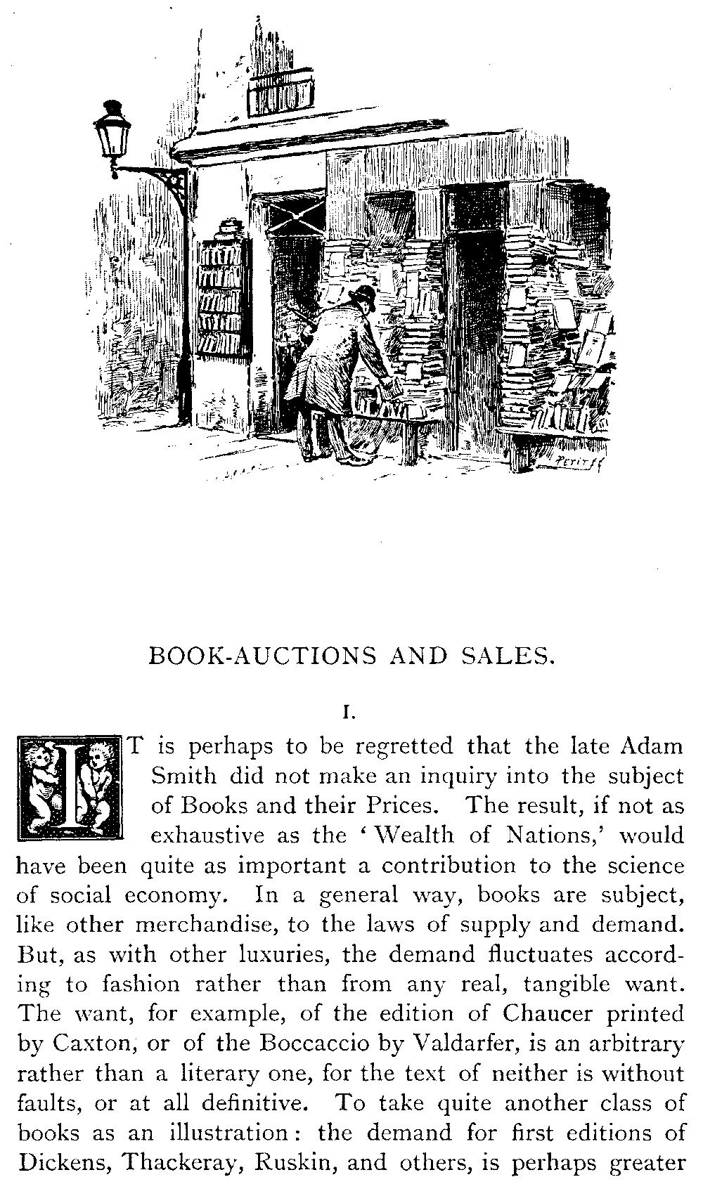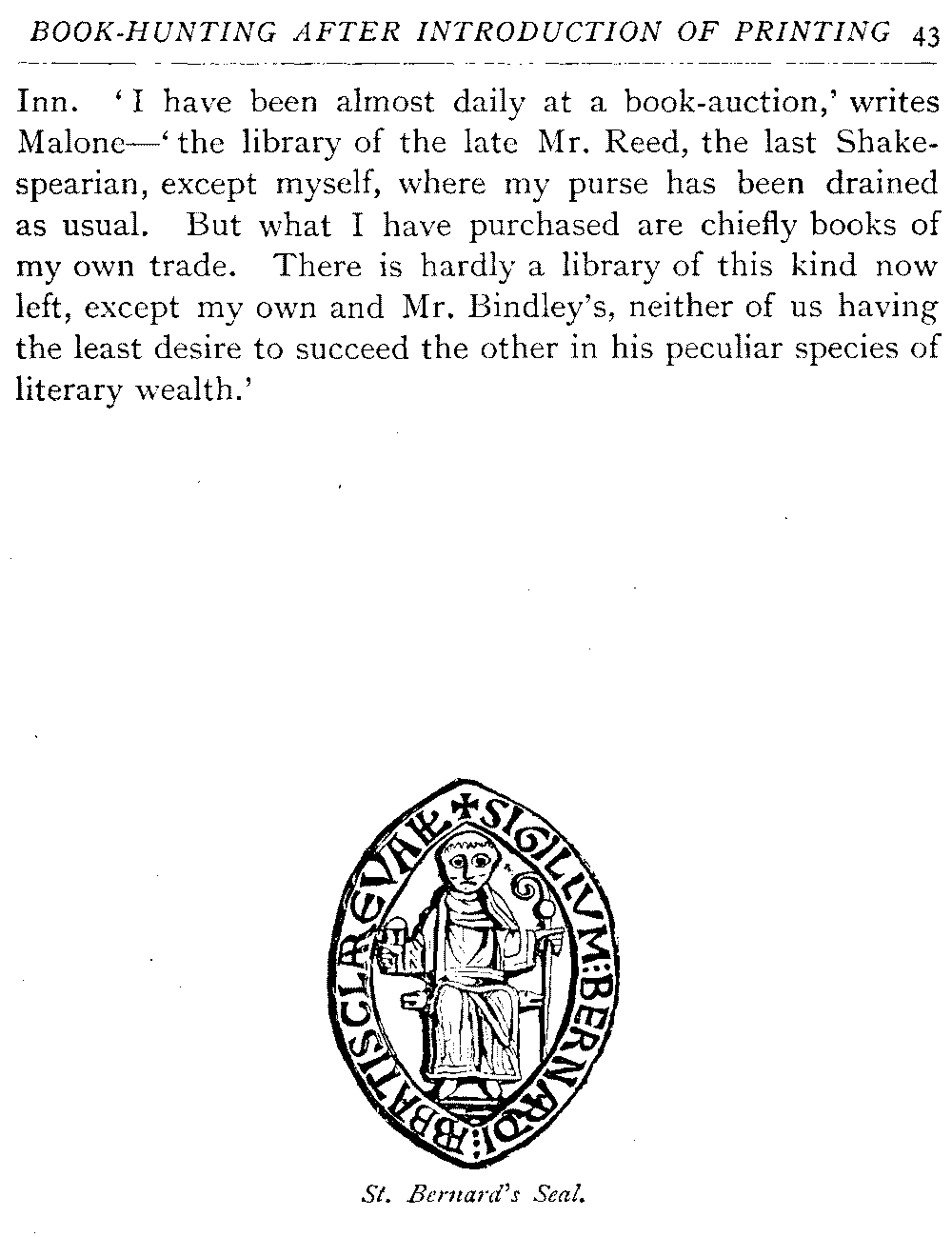 Half a century ago one of the most inveterate frequenters of book-auctions was a certain Dr. G., of diminutive stature, on account of an awkward deviation of the spine. At that time the appearance of a private purchaser at a sale was a very rare event, and one which, when it occurred, invariably met with a more or less hostile reception from the fraternity. Dr. G.'s first appearance produced a good deal of sensation. The hunchback, it is true, was rather shabbily dressed, but 'l'habit ne fait pas le moine,' and is certainly no trustworthy index to the pockets of the wearer. Excitement reached fever-heat when a Wynkyn de Worde was put up and persistently contested for by the doctor, who ran it up against the booksellers present (some of whom quickly desisted from the fun for fear of burning their fingers), one of whom, far exceeding his commission, obstinately refused to give in until the book was knocked down to him to his own dismay, and the delight and ironical compliments of his colleagues. After this contretemps the doctor had it pretty much his own way; his name was duly entered on the sale catalogue, and his address was known. The next day our bookseller, sobered by reflection, called on the doctor, confessed his sin of the previous day, humbly asked for absolution, and offered him the book at an immense loss on the sale price. 'If you were,' replied the doctor, 'to bring the book at my door for nothing, I would take it with a pair of tongs and drop it into the gutter.' It was a puzzle to everyone what the little doctor did with all his purchases, which were limited chiefly to classical books. At [xxx]his death, however, it transpired that he bought for the various Universities of the United Kingdom. The doctor's son, a poor curate, entered his late father's library for the first time, and found there a mass of books, which occupied nearly a month in selling, and realized, to his delight, a large sum of money.