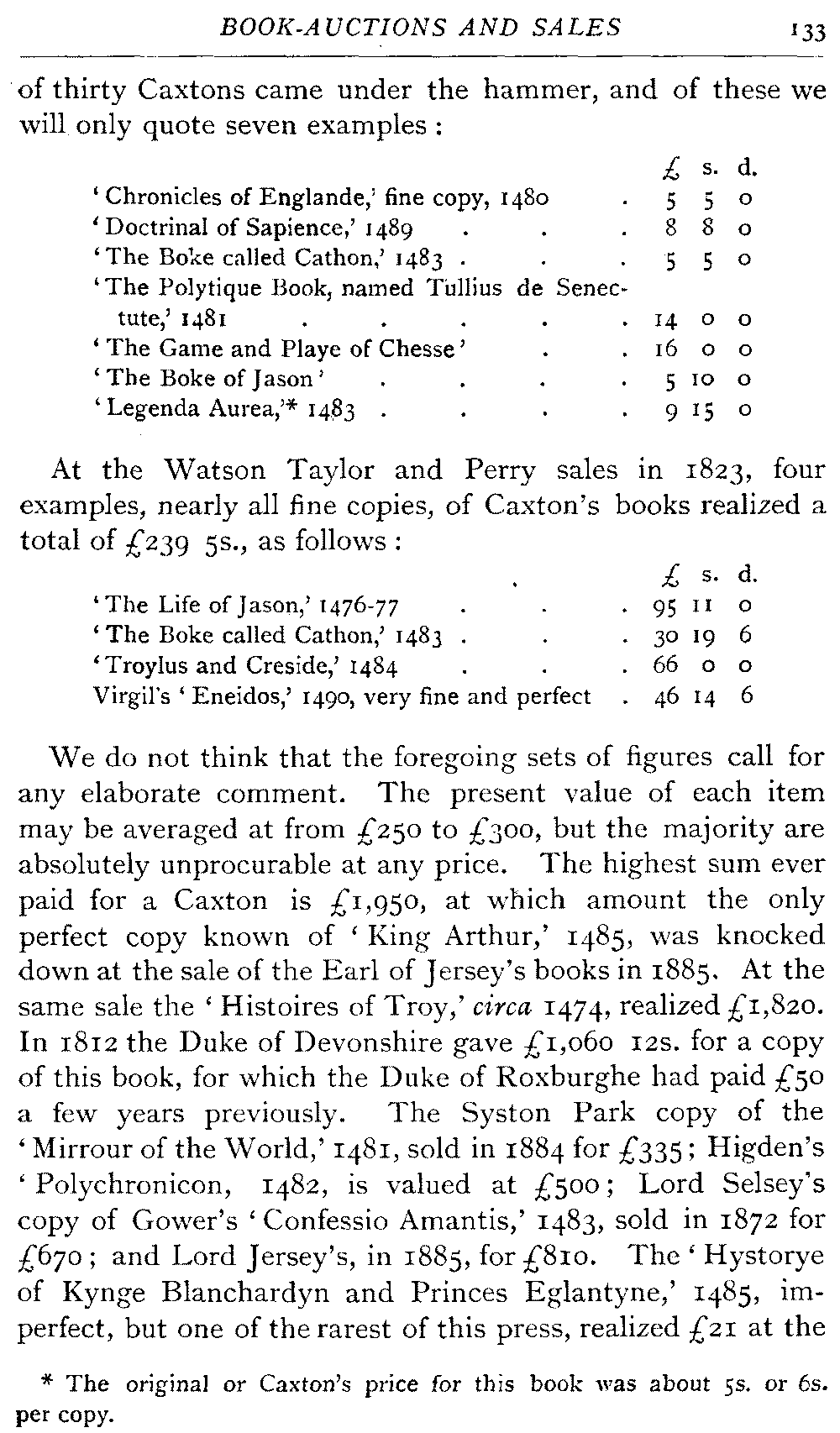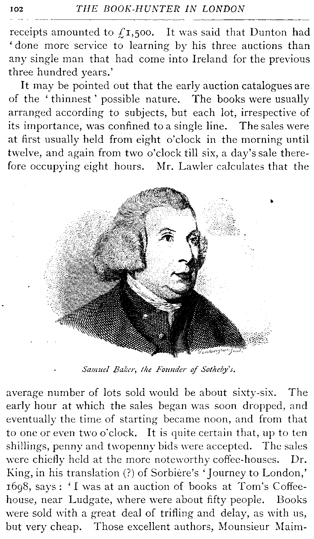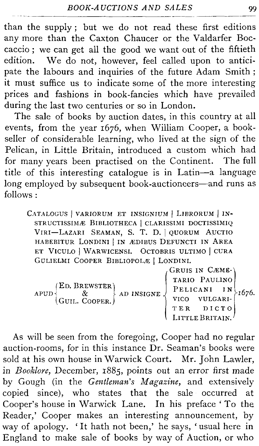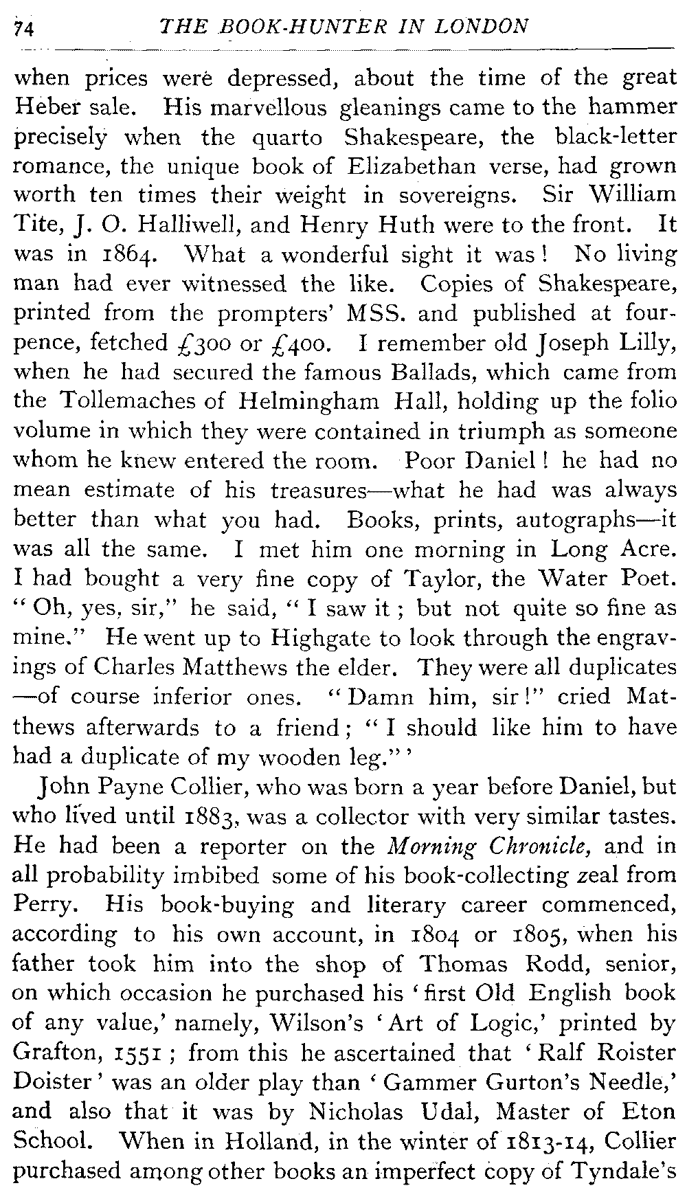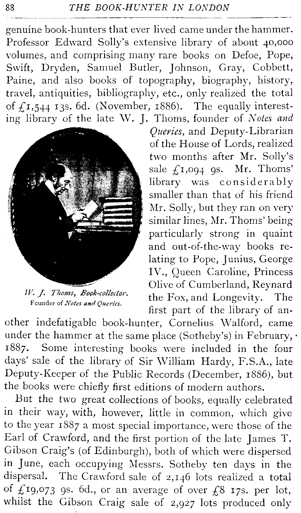 Half a century ago one of the most inveterate frequenters of book-auctions was a certain Dr. G., of diminutive stature, on account of an awkward deviation of the spine. At that time the appearance of a private purchaser at a sale was a very rare event, and one which, when it occurred, invariably met with a more or less hostile reception from the fraternity. Dr. G.'s first appearance produced a good deal of sensation. The hunchback, it is true, was rather shabbily dressed, but 'l'habit ne fait pas le moine,' and is certainly no trustworthy index to the pockets of the wearer. Excitement reached fever-heat when a Wynkyn de Worde was put up and persistently contested for by the doctor, who ran it up against the booksellers present (some of whom quickly desisted from the fun for fear of burning their fingers), one of whom, far exceeding his commission, obstinately refused to give in until the book was knocked down to him to his own dismay, and the delight and ironical compliments of his colleagues. After this contretemps the doctor had it pretty much his own way; his name was duly entered on the sale catalogue, and his address was known. The next day our bookseller, sobered by reflection, called on the doctor, confessed his sin of the previous day, humbly asked for absolution, and offered him the book at an immense loss on the sale price. 'If you were,' replied the doctor, 'to bring the book at my door for nothing, I would take it with a pair of tongs and drop it into the gutter.' It was a puzzle to everyone what the little doctor did with all his purchases, which were limited chiefly to classical books. At [xxx]his death, however, it transpired that he bought for the various Universities of the United Kingdom. The doctor's son, a poor curate, entered his late father's library for the first time, and found there a mass of books, which occupied nearly a month in selling, and realized, to his delight, a large sum of money.