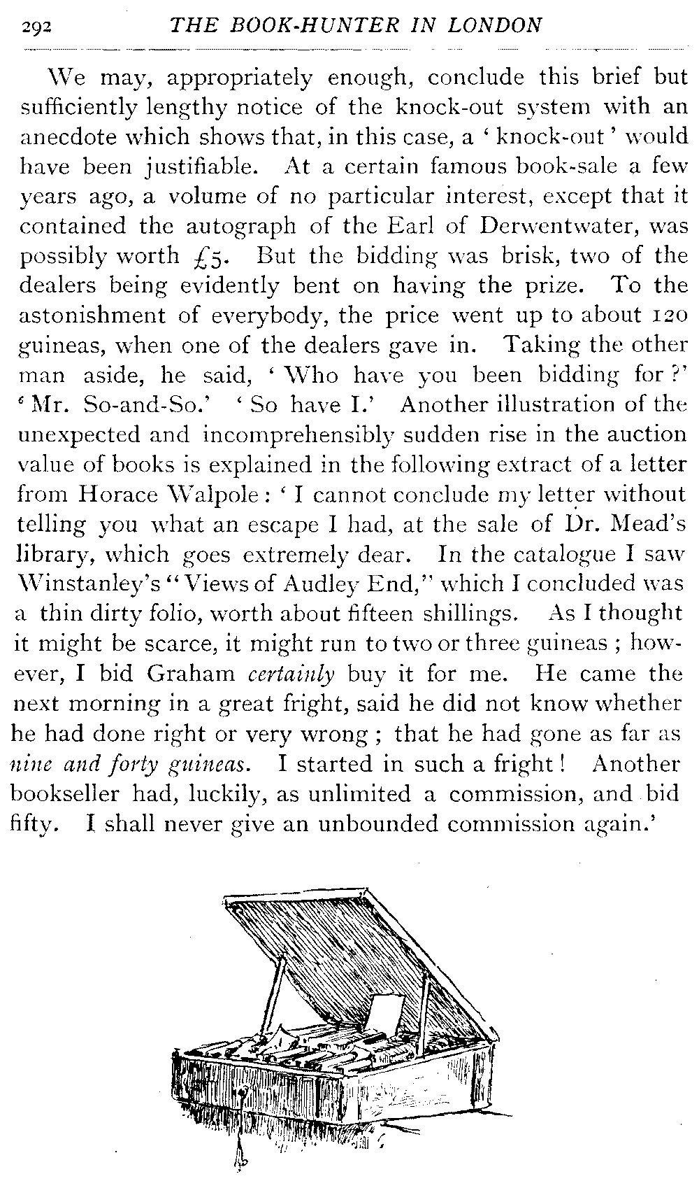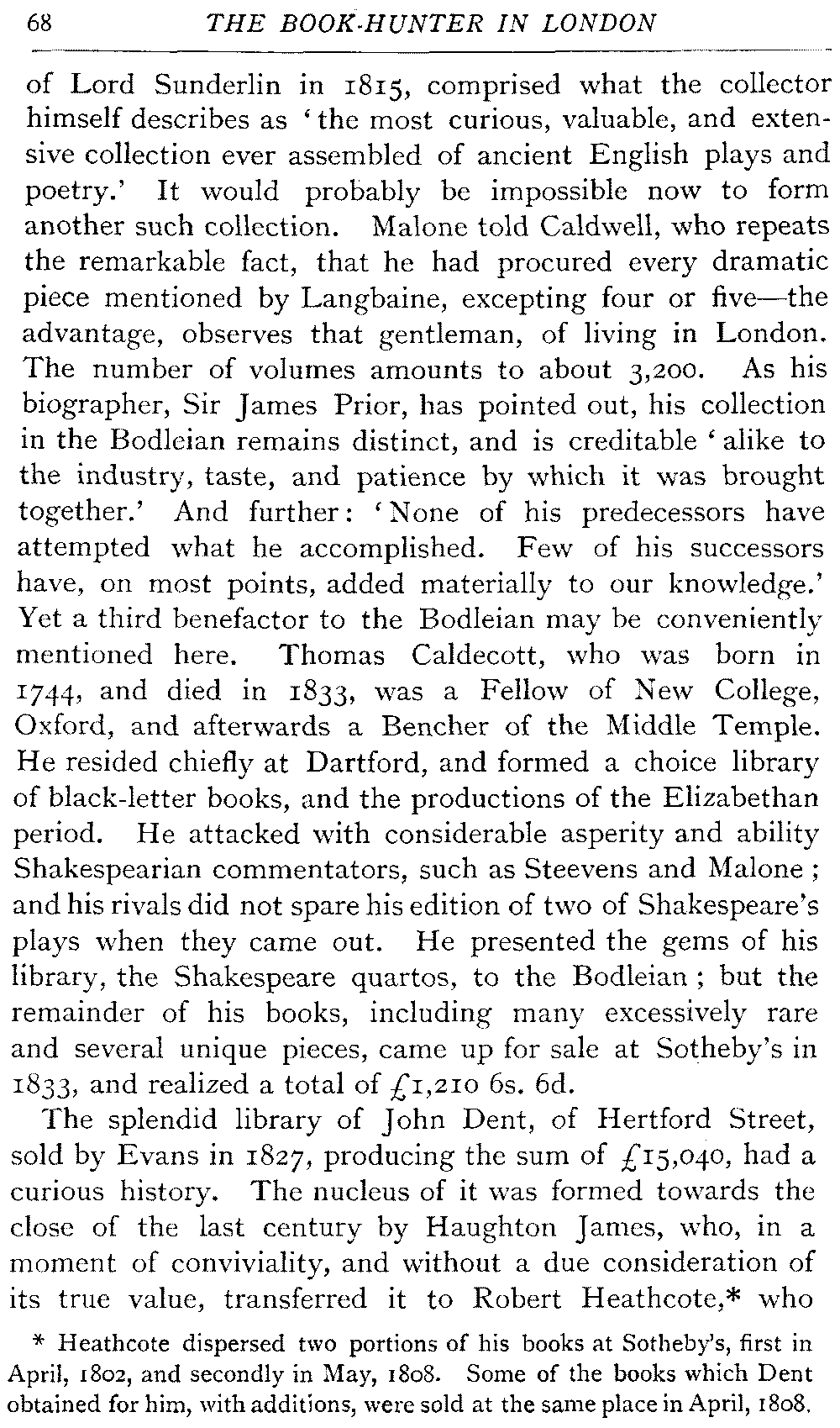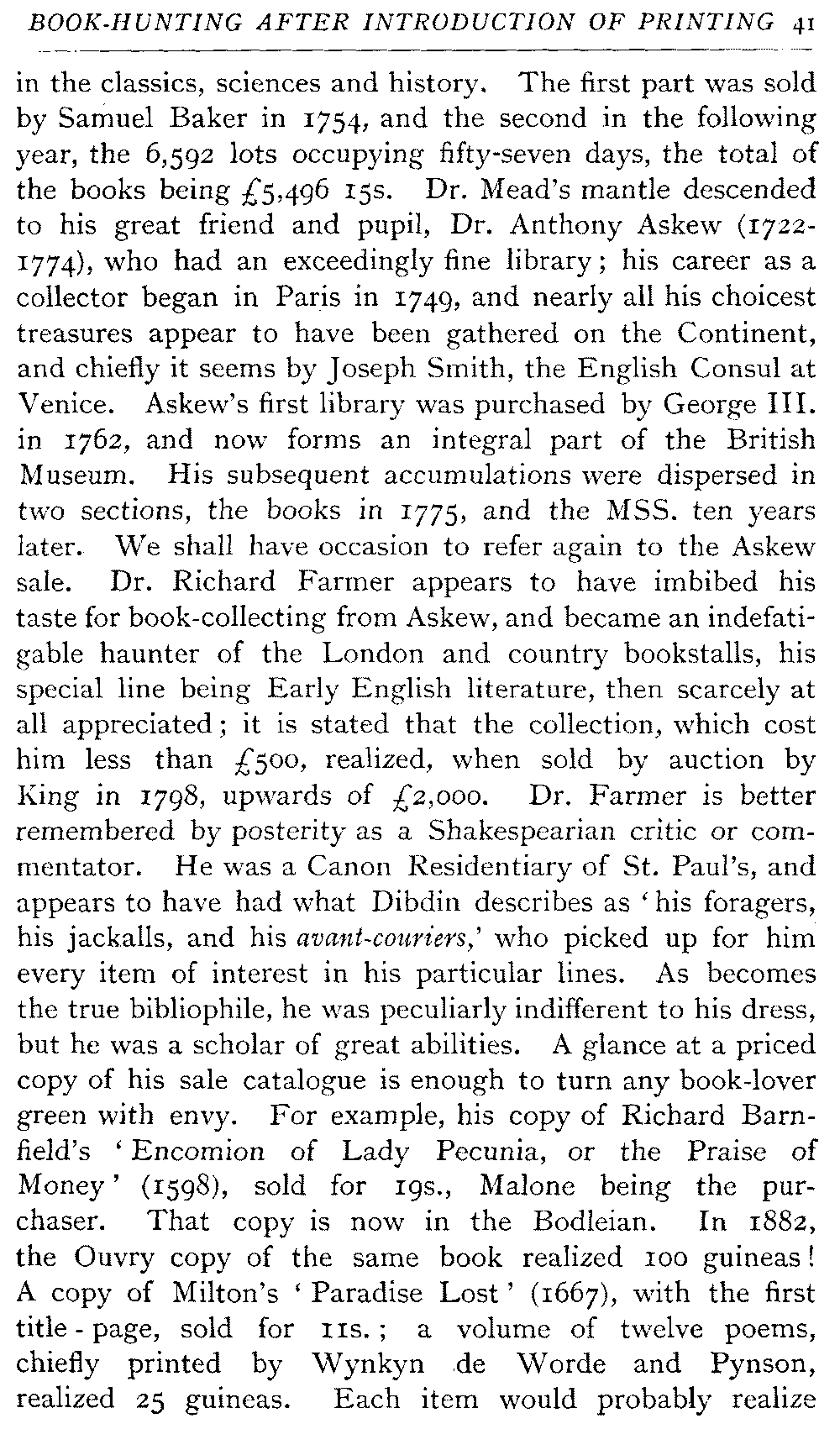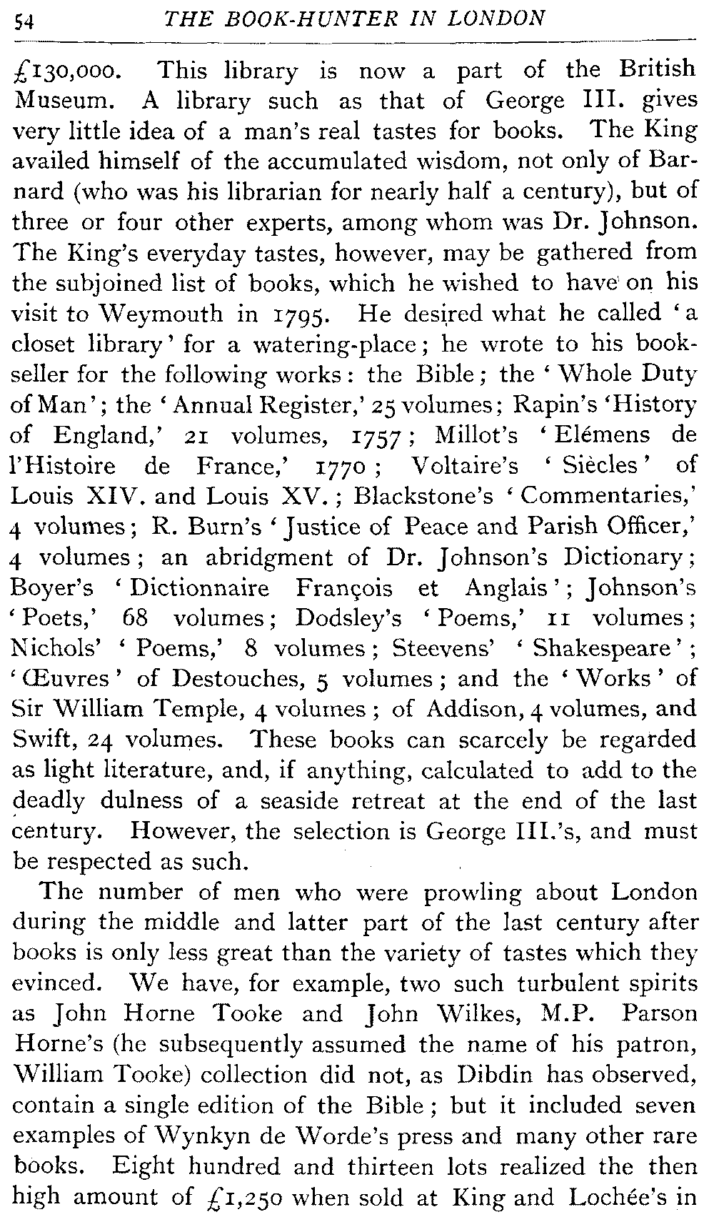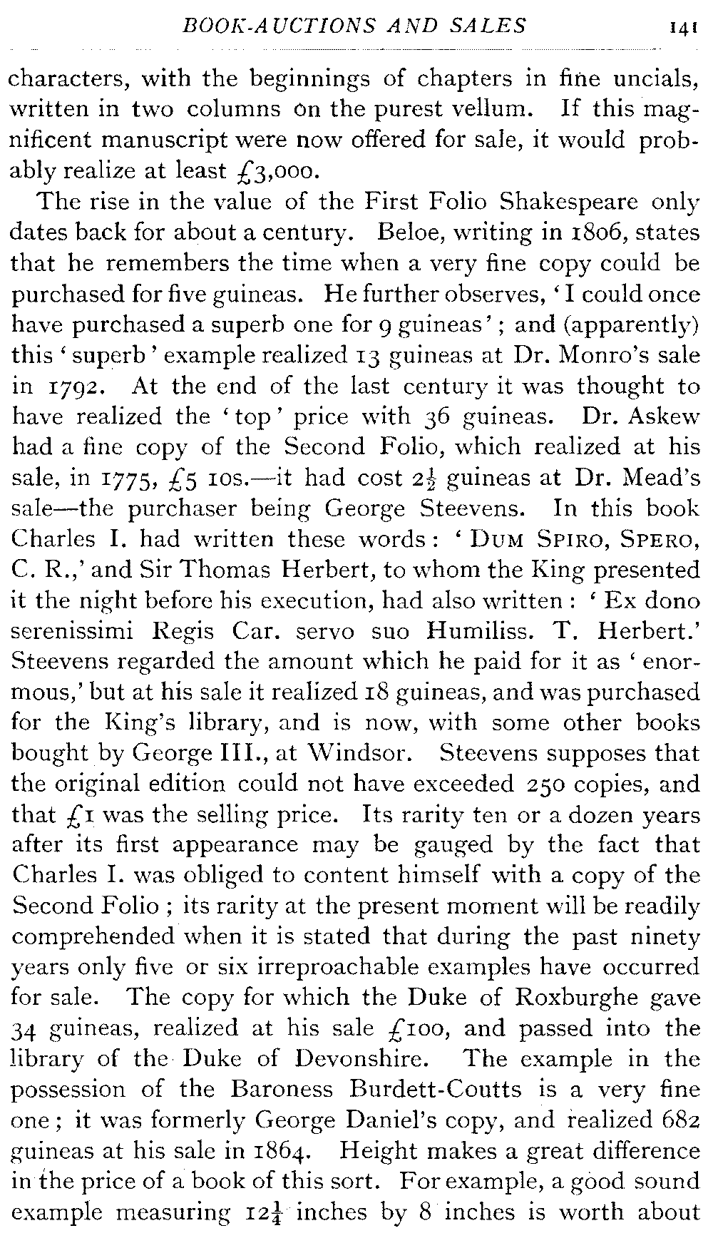 Half a century ago one of the most inveterate frequenters of book-auctions was a certain Dr. G., of diminutive stature, on account of an awkward deviation of the spine. At that time the appearance of a private purchaser at a sale was a very rare event, and one which, when it occurred, invariably met with a more or less hostile reception from the fraternity. Dr. G.'s first appearance produced a good deal of sensation. The hunchback, it is true, was rather shabbily dressed, but 'l'habit ne fait pas le moine,' and is certainly no trustworthy index to the pockets of the wearer. Excitement reached fever-heat when a Wynkyn de Worde was put up and persistently contested for by the doctor, who ran it up against the booksellers present (some of whom quickly desisted from the fun for fear of burning their fingers), one of whom, far exceeding his commission, obstinately refused to give in until the book was knocked down to him to his own dismay, and the delight and ironical compliments of his colleagues. After this contretemps the doctor had it pretty much his own way; his name was duly entered on the sale catalogue, and his address was known. The next day our bookseller, sobered by reflection, called on the doctor, confessed his sin of the previous day, humbly asked for absolution, and offered him the book at an immense loss on the sale price. 'If you were,' replied the doctor, 'to bring the book at my door for nothing, I would take it with a pair of tongs and drop it into the gutter.' It was a puzzle to everyone what the little doctor did with all his purchases, which were limited chiefly to classical books. At [xxx]his death, however, it transpired that he bought for the various Universities of the United Kingdom. The doctor's son, a poor curate, entered his late father's library for the first time, and found there a mass of books, which occupied nearly a month in selling, and realized, to his delight, a large sum of money.