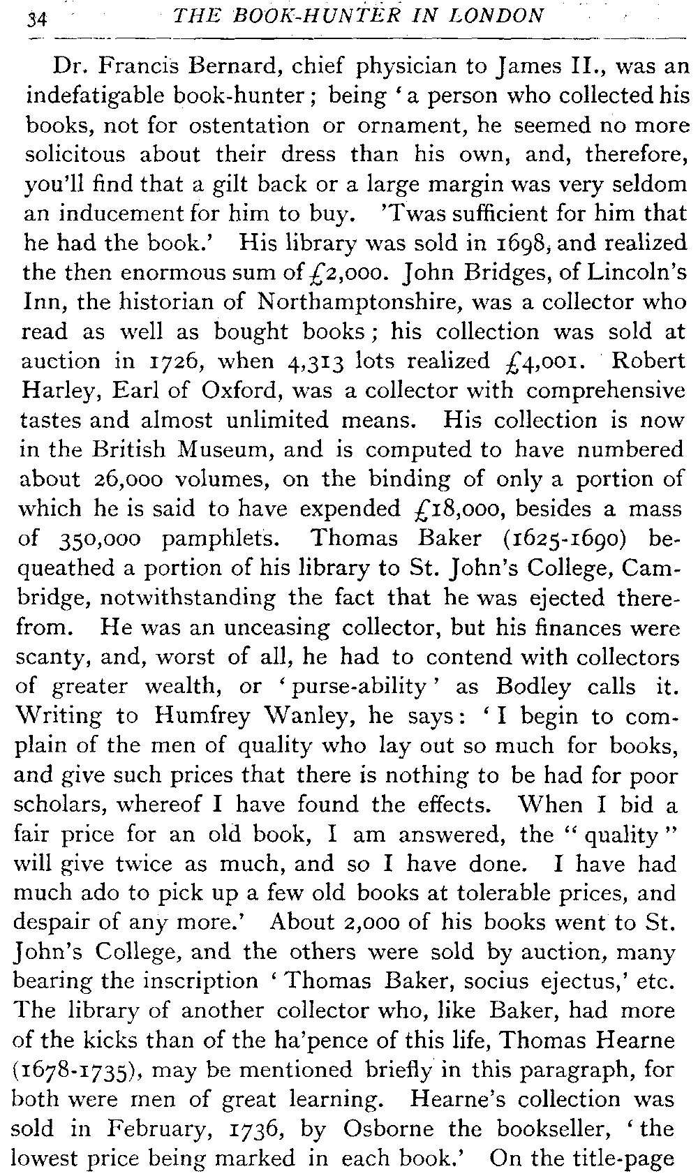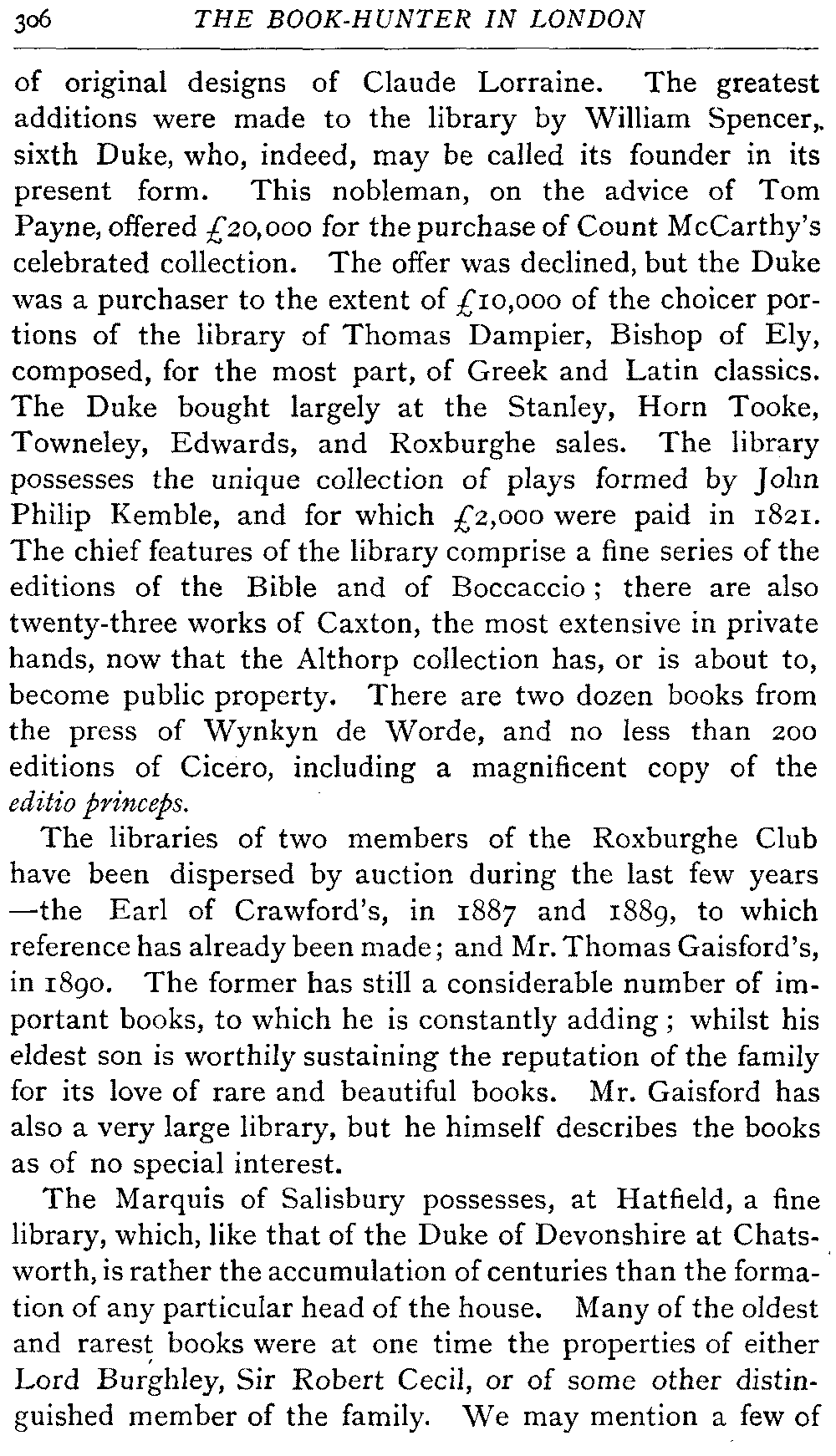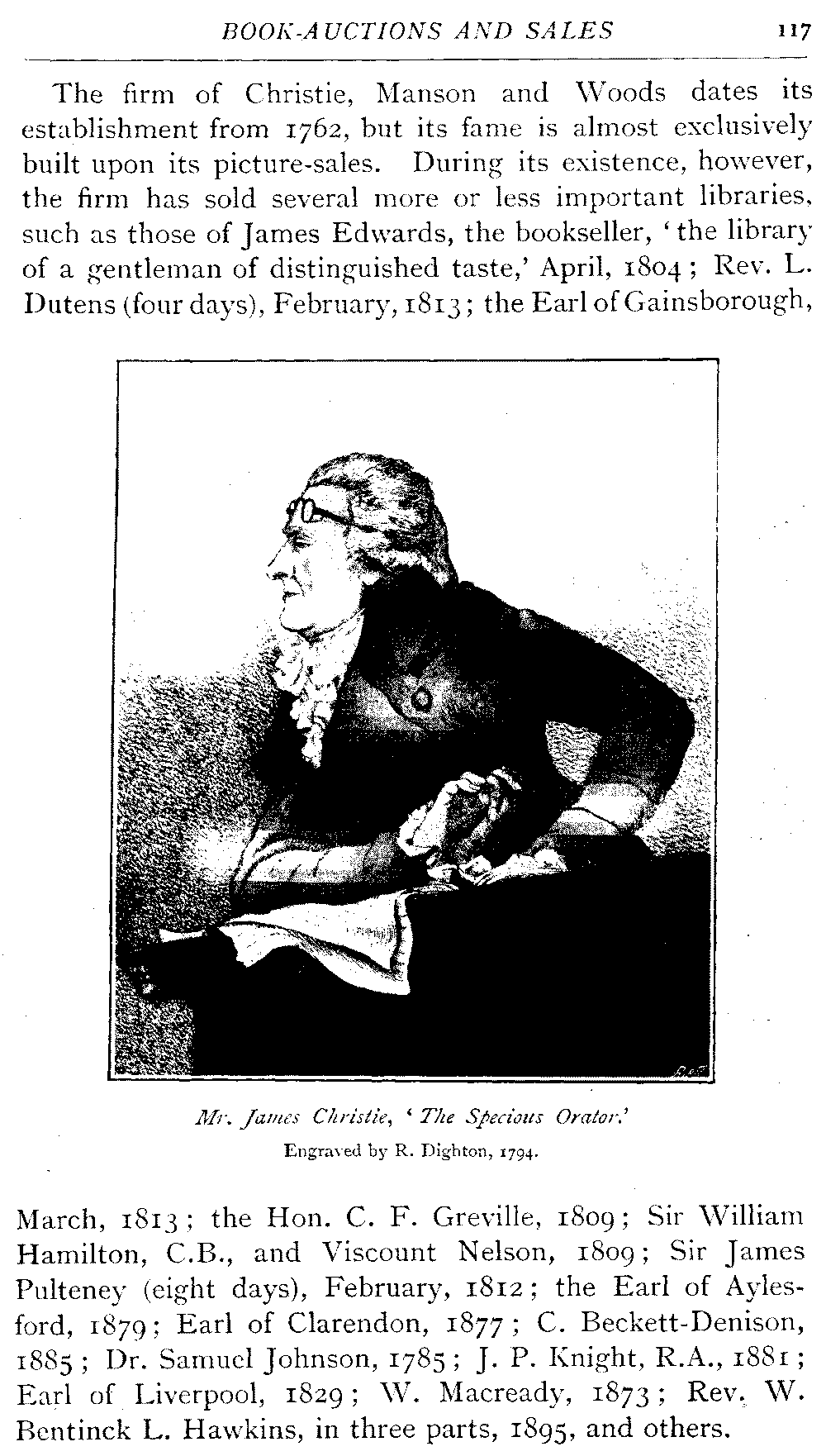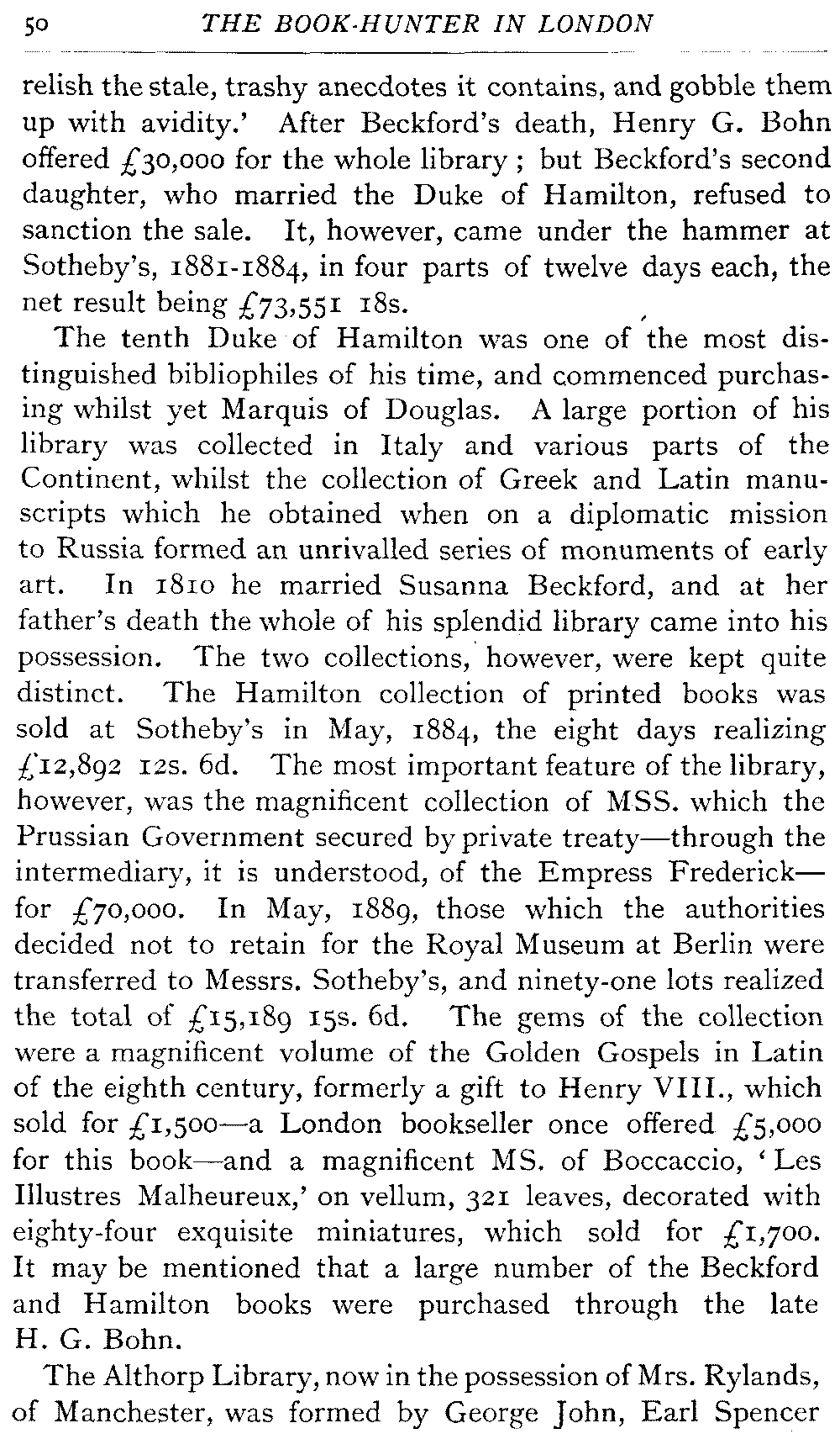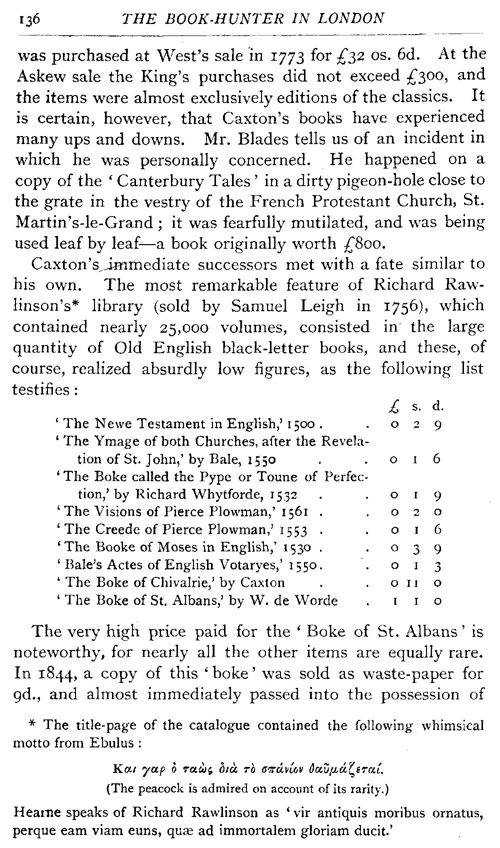Half a century ago one of the most inveterate frequenters of book-auctions was a certain Dr. G., of diminutive stature, on account of an awkward deviation of the spine. At that time the appearance of a private purchaser at a sale was a very rare event, and one which, when it occurred, invariably met with a more or less hostile reception from the fraternity. Dr. G.'s first appearance produced a good deal of sensation. The hunchback, it is true, was rather shabbily dressed, but 'l'habit ne fait pas le moine,' and is certainly no trustworthy index to the pockets of the wearer. Excitement reached fever-heat when a Wynkyn de Worde was put up and persistently contested for by the doctor, who ran it up against the booksellers present (some of whom quickly desisted from the fun for fear of burning their fingers), one of whom, far exceeding his commission, obstinately refused to give in until the book was knocked down to him to his own dismay, and the delight and ironical compliments of his colleagues. After this contretemps the doctor had it pretty much his own way; his name was duly entered on the sale catalogue, and his address was known. The next day our bookseller, sobered by reflection, called on the doctor, confessed his sin of the previous day, humbly asked for absolution, and offered him the book at an immense loss on the sale price. 'If you were,' replied the doctor, 'to bring the book at my door for nothing, I would take it with a pair of tongs and drop it into the gutter.' It was a puzzle to everyone what the little doctor did with all his purchases, which were limited chiefly to classical books. At [xxx]his death, however, it transpired that he bought for the various Universities of the United Kingdom. The doctor's son, a poor curate, entered his late father's library for the first time, and found there a mass of books, which occupied nearly a month in selling, and realized, to his delight, a large sum of money.
