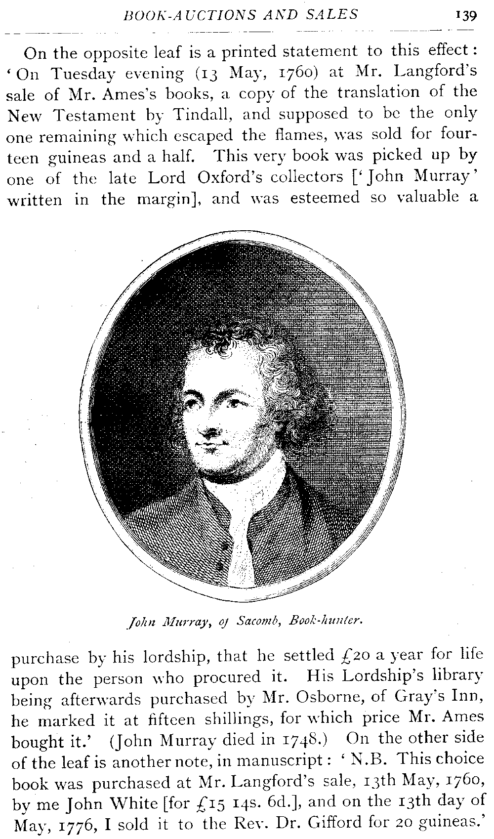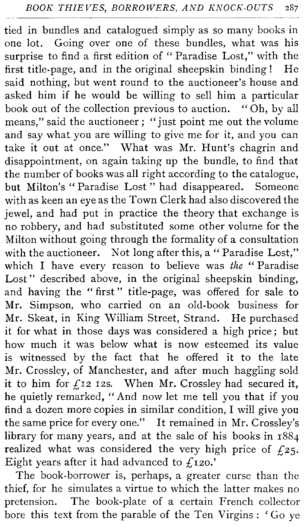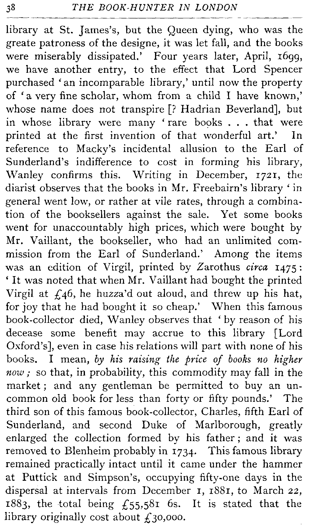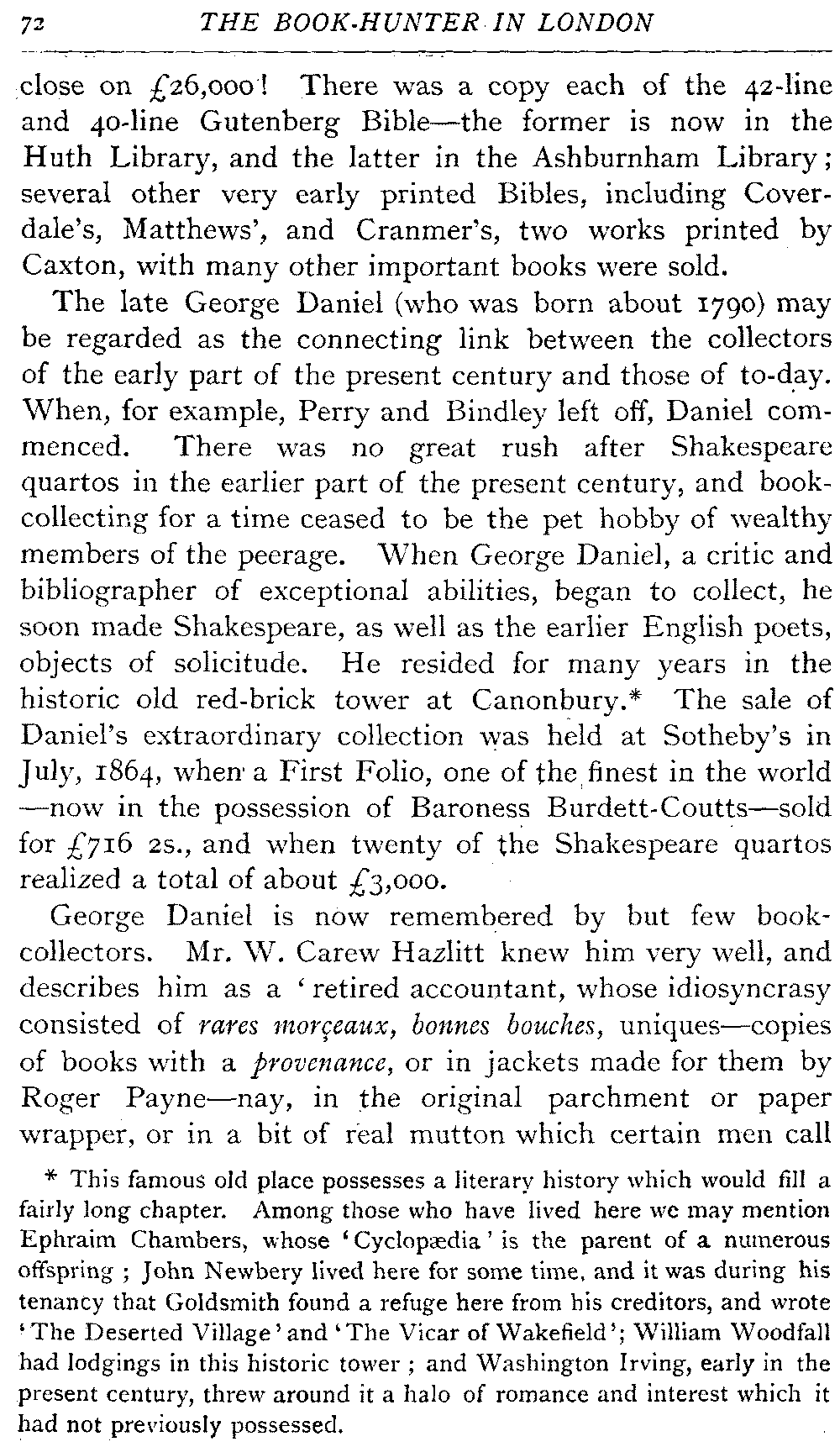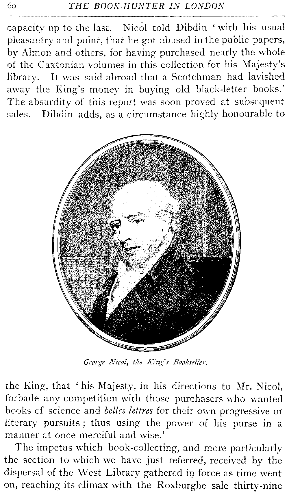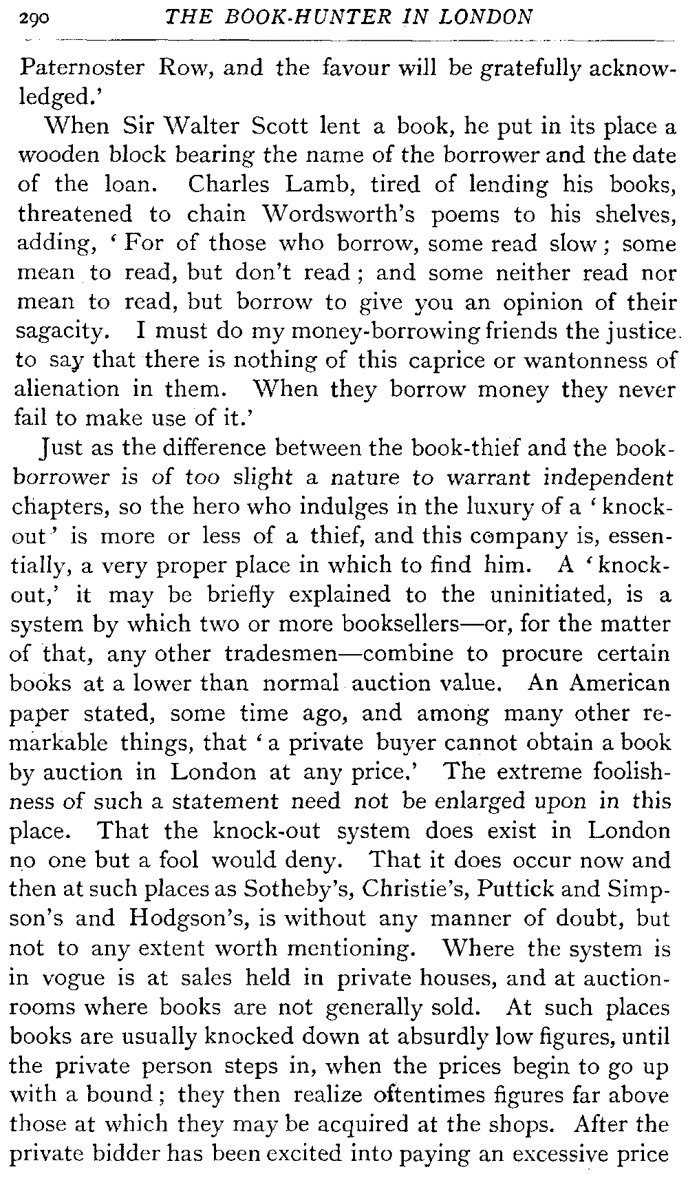 Half a century ago one of the most inveterate frequenters of book-auctions was a certain Dr. G., of diminutive stature, on account of an awkward deviation of the spine. At that time the appearance of a private purchaser at a sale was a very rare event, and one which, when it occurred, invariably met with a more or less hostile reception from the fraternity. Dr. G.'s first appearance produced a good deal of sensation. The hunchback, it is true, was rather shabbily dressed, but 'l'habit ne fait pas le moine,' and is certainly no trustworthy index to the pockets of the wearer. Excitement reached fever-heat when a Wynkyn de Worde was put up and persistently contested for by the doctor, who ran it up against the booksellers present (some of whom quickly desisted from the fun for fear of burning their fingers), one of whom, far exceeding his commission, obstinately refused to give in until the book was knocked down to him to his own dismay, and the delight and ironical compliments of his colleagues. After this contretemps the doctor had it pretty much his own way; his name was duly entered on the sale catalogue, and his address was known. The next day our bookseller, sobered by reflection, called on the doctor, confessed his sin of the previous day, humbly asked for absolution, and offered him the book at an immense loss on the sale price. 'If you were,' replied the doctor, 'to bring the book at my door for nothing, I would take it with a pair of tongs and drop it into the gutter.' It was a puzzle to everyone what the little doctor did with all his purchases, which were limited chiefly to classical books. At [xxx]his death, however, it transpired that he bought for the various Universities of the United Kingdom. The doctor's son, a poor curate, entered his late father's library for the first time, and found there a mass of books, which occupied nearly a month in selling, and realized, to his delight, a large sum of money.